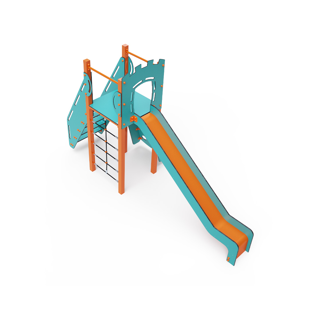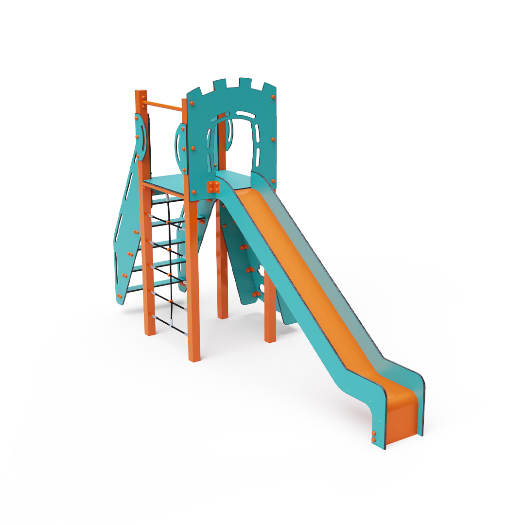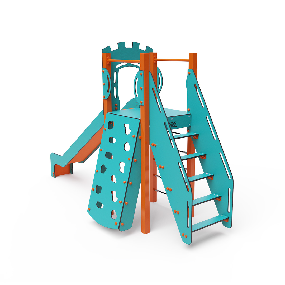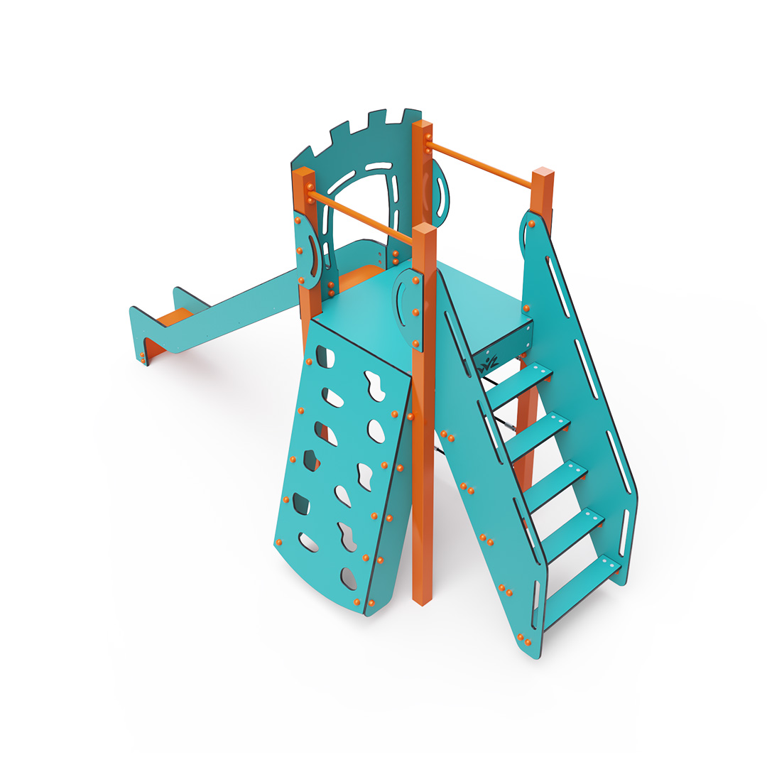 Kombiniertes Turmset – ein niedriger Turm, den Kinder über Stufen erklimmen können, eine schräge Kletterwand mit Griffen oder ein Kletterseil sowie eine Rutsche. Das türkis-orange Design lockt Kinder schon von Weitem zum Spielen an. Die Stahlkonstruktion ist dank Feuerverzinkung und strapazierfähiger Pulverbeschichtung witterungsbeständig. Das verwendete HPL-Material ist chemikalienbeständig, UV-beständig, farbecht, ungiftig, recycelbar und bruchfest. Es besteht keine Verletzungsgefahr durch scharfe Kanten oder Splitter. Alle Verbindungen sind aus Edelstahl und mit Kunststoffkappen versehen, um Haltbarkeit und Sicherheit zu erhöhen.