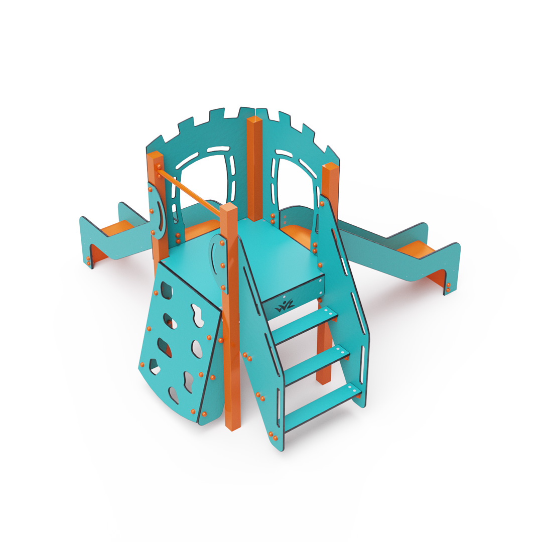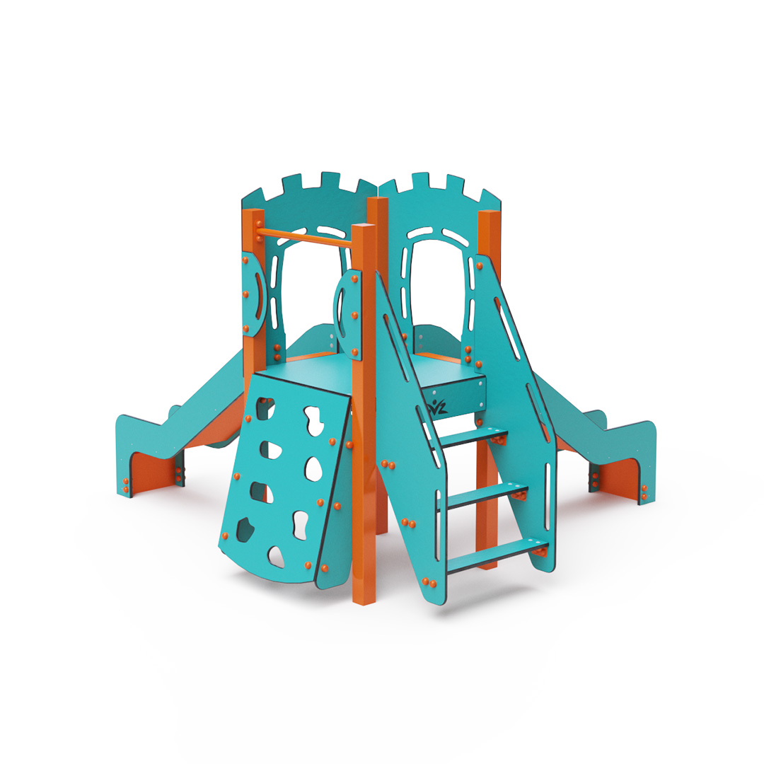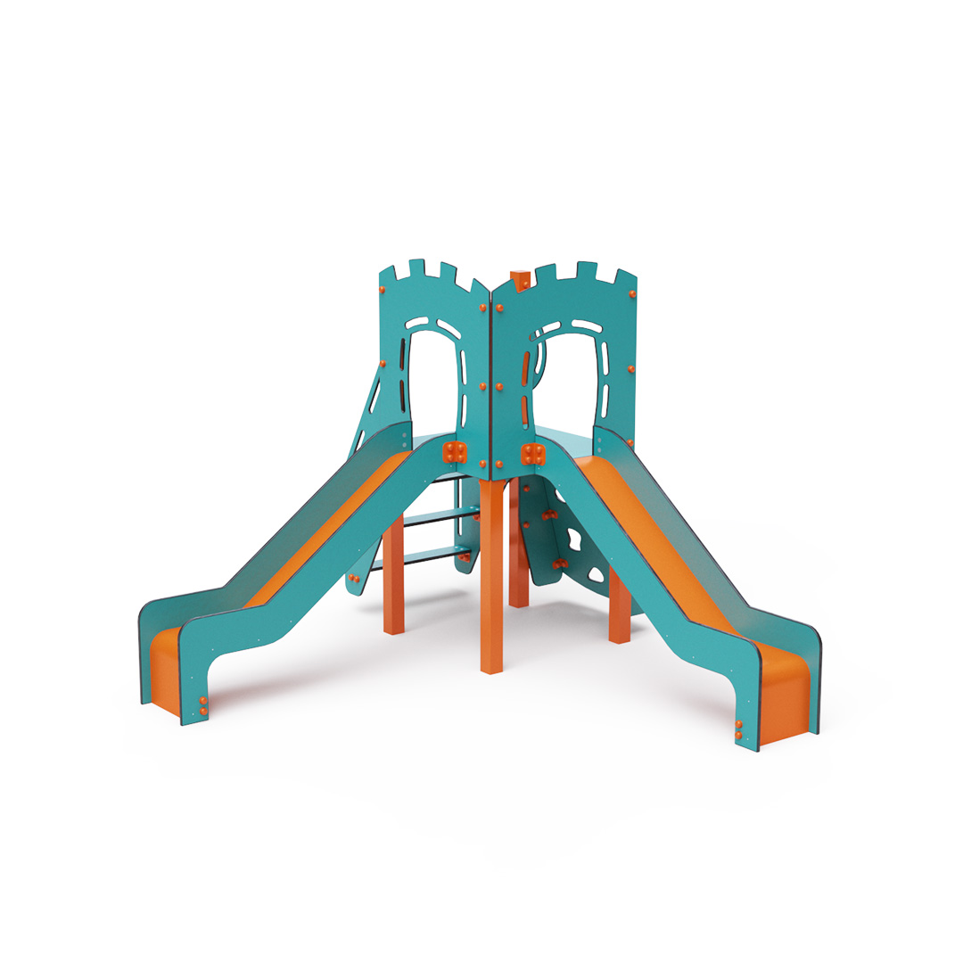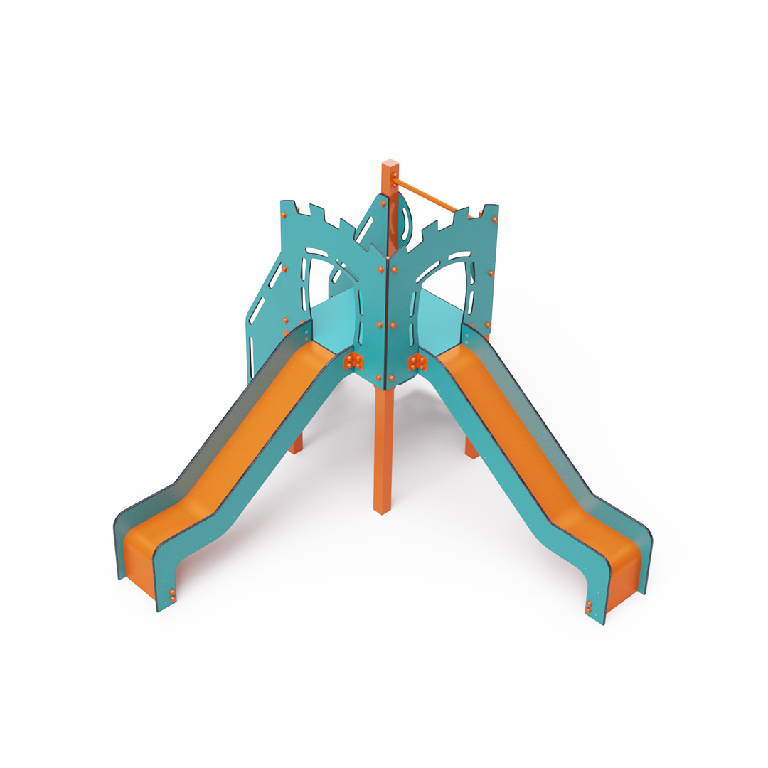 Kombiniertes Turmset – ein Turm, den Kinder über Stufen oder eine Kletterwand mit Griffen erklimmen und anschließend über eine der beiden Rutschen hinuntersausen können. Das türkis-orange Design lockt Kinder schon von Weitem zum Spielen an. Die Stahlkonstruktion ist dank Feuerverzinkung und strapazierfähiger Pulverbeschichtung witterungsbeständig. Das verwendete HPL-Material ist chemikalienbeständig, UV-beständig, farbecht, ungiftig, recycelbar und bruchfest. Es besteht keine Verletzungsgefahr durch scharfe Kanten oder Splitter. Alle Verbindungen sind aus Edelstahl und mit Kunststoffkappen versehen, um Haltbarkeit und Sicherheit zu erhöhen.