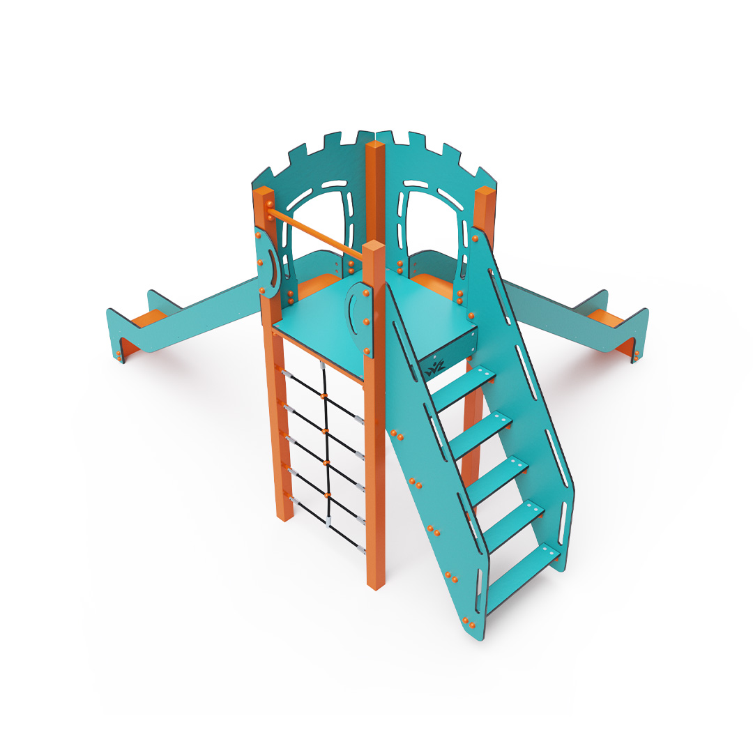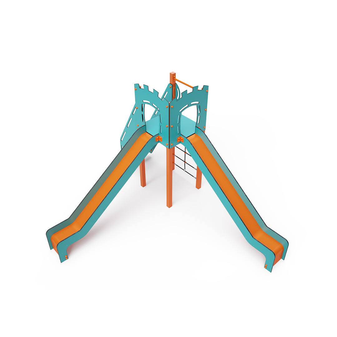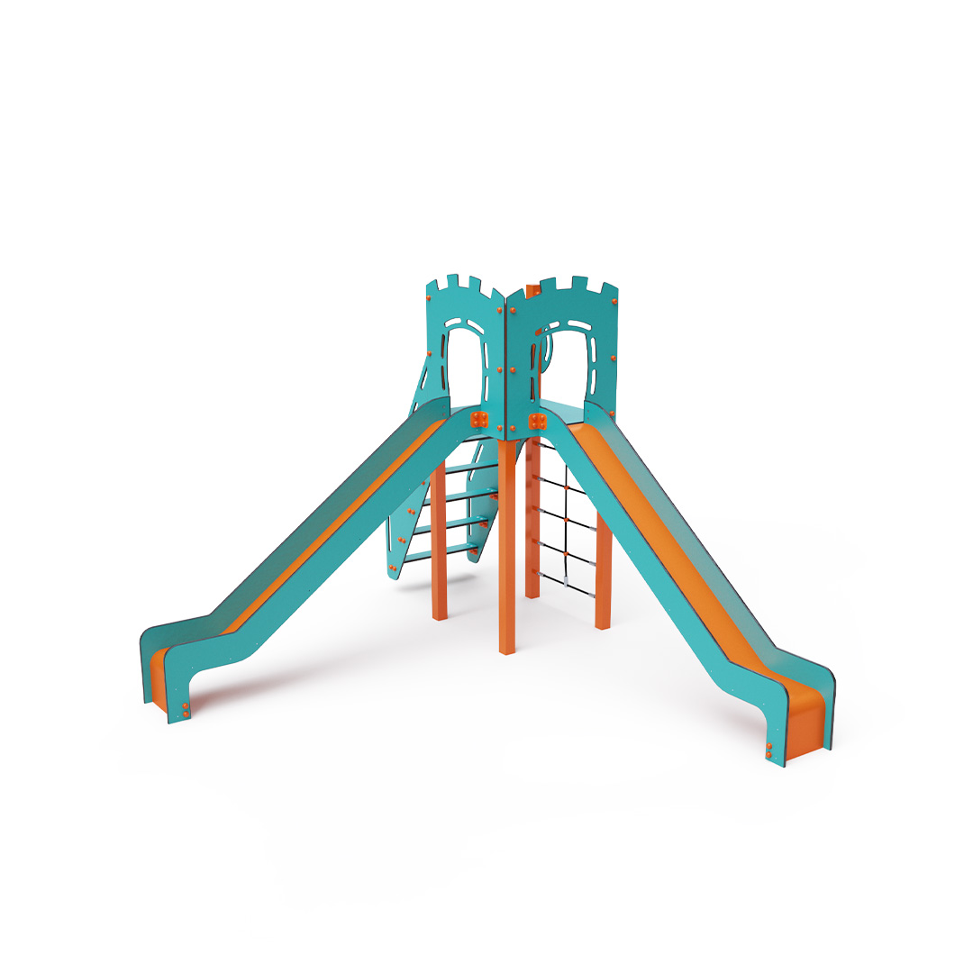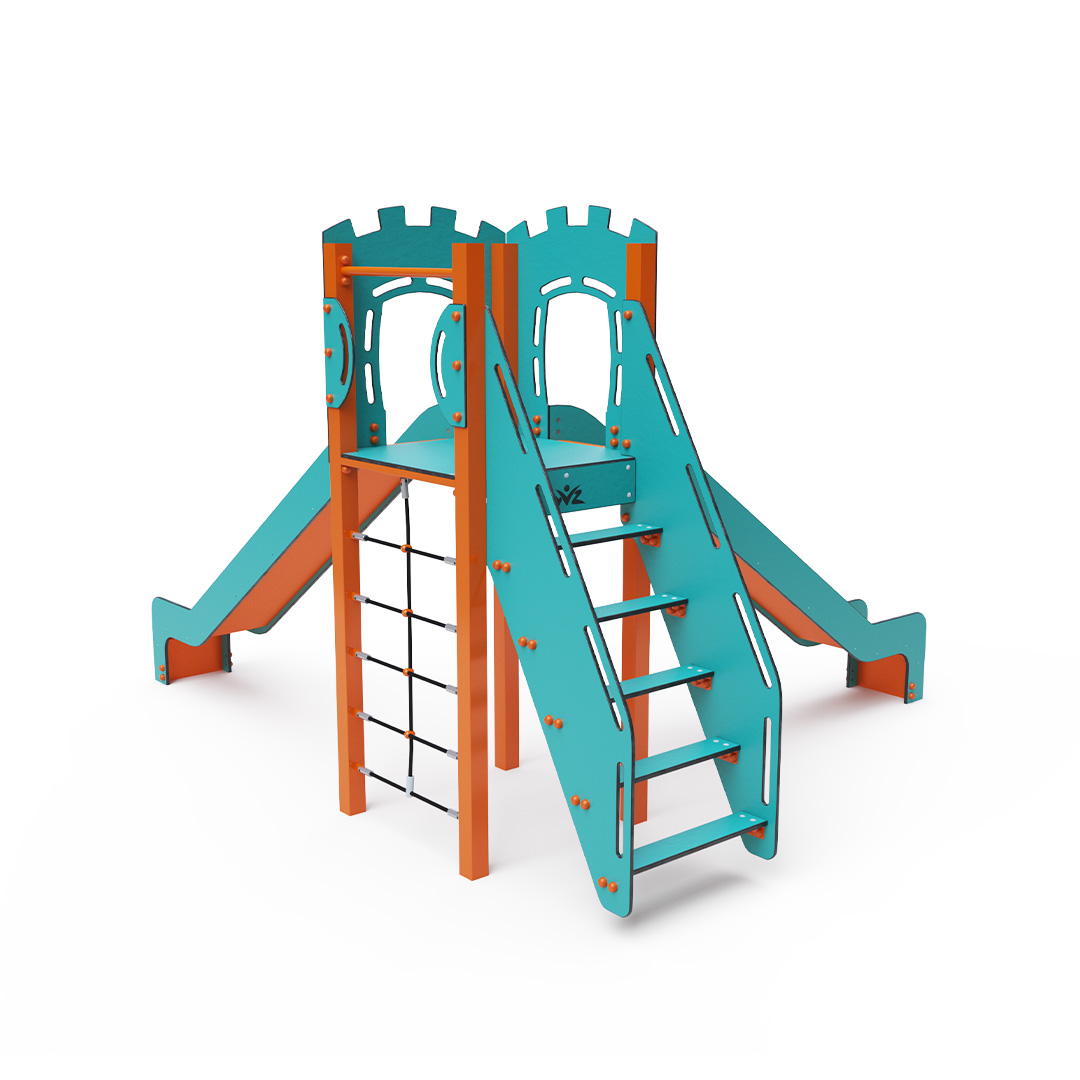 Kombiniertes Kletterturm-Set – ein Turm, den Kinder über Stufen oder eine Seilkletterwand erklimmen und anschließend über eine der beiden Rutschen hinuntersausen können. Das türkis-orange Design zieht schon von Weitem die Blicke auf sich. Die Stahlkonstruktion ist dank Feuerverzinkung und strapazierfähiger Pulverbeschichtung witterungsbeständig. Das verwendete HPL-Material ist chemikalienbeständig, UV-beständig, farbecht, ungiftig, recycelbar und bruchfest. Es besteht keine Verletzungsgefahr durch scharfe Kanten oder Splitter. Die Seile bestehen aus Polyesterfasern, die um die zentrale Verstärkung gewickelt sind. Diese Seilkonstruktion erhöht die Festigkeit und Widerstandsfähigkeit gegen mechanische Belastungen. Polyester selbst ist resistent gegen Mikroorganismen, Witterungseinflüsse, trocknet schnell nach Regen, ist farbecht und zeichnet sich durch hohe Festigkeit aus. Alle Verbindungen sind aus Edelstahl und mit Kunststoffkappen versehen, um Langlebigkeit und Sicherheit zu erhöhen.
