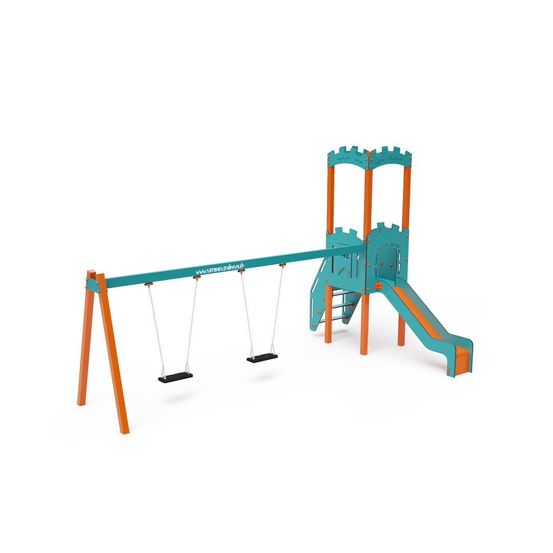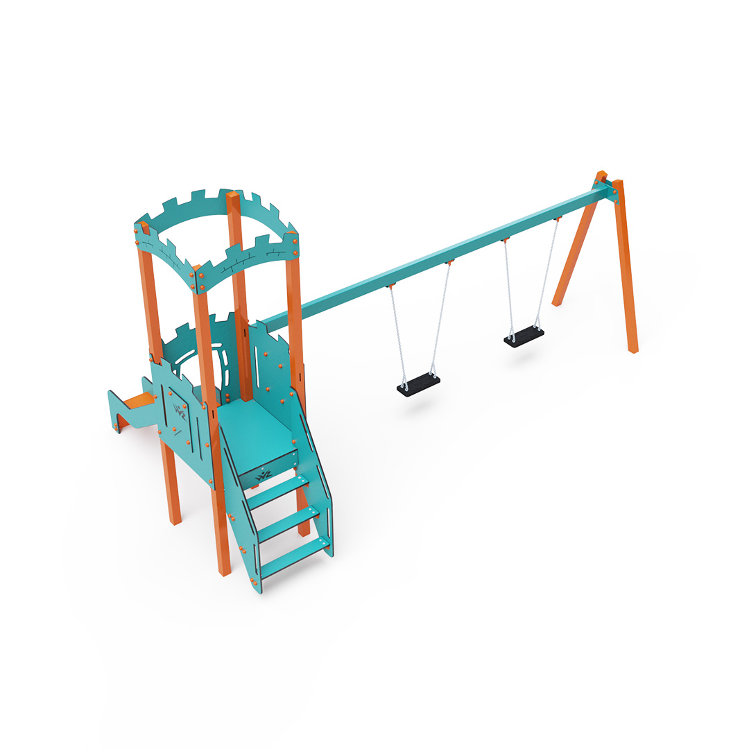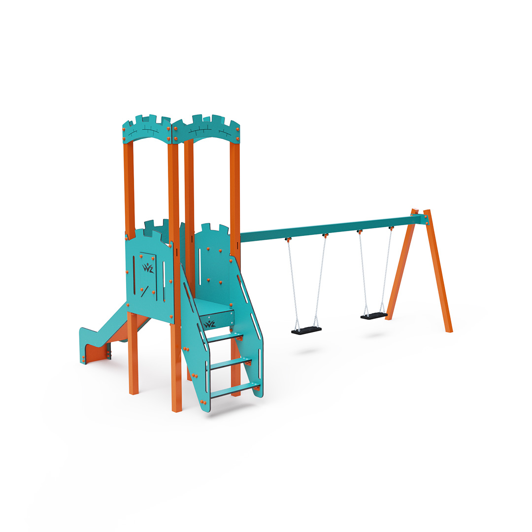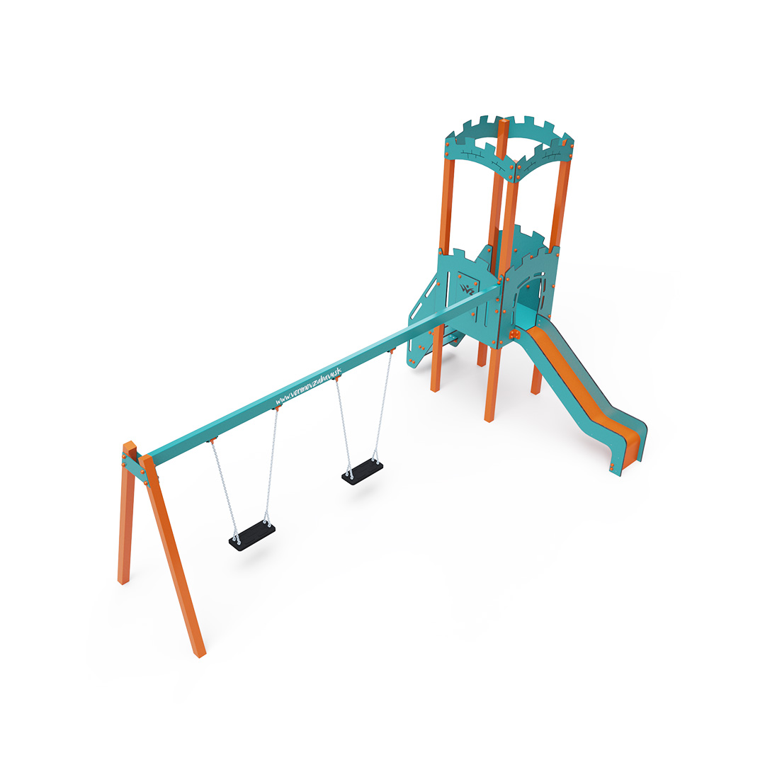 Kombiniertes Turm-Set – ein Turm, den Kinder über Stufen erklimmen und über eine der beiden Rutschen hinuntersausen können. Das Spielset beinhaltet einen Schaukelbalken mit zwei klassischen oder Babysitzen oder einer Kombination aus beiden. Das türkis-orange Design zieht schon von Weitem die Blicke auf sich. Die Stahlkonstruktion ist dank Feuerverzinkung und strapazierfähiger Pulverbeschichtung witterungsbeständig. Das verwendete HPL-Material ist chemikalienbeständig, UV-beständig, farbecht, ungiftig, recycelbar und bruchfest. Es besteht keine Verletzungsgefahr durch scharfe Kanten oder Splitter. Die Seile bestehen aus Polyesterfasern, die um die zentrale Verstärkung gewickelt sind. Diese Seilkonstruktion erhöht die Festigkeit und Widerstandsfähigkeit gegen mechanische Belastung. Polyester selbst ist resistent gegen Mikroorganismen, Witterungseinflüsse, trocknet schnell nach Regen, ist farbecht und zeichnet sich durch hohe Festigkeit aus. Alle Verbindungen sind aus Edelstahl und mit Kunststoffkappen versehen, um Langlebigkeit und Sicherheit zu erhöhen.