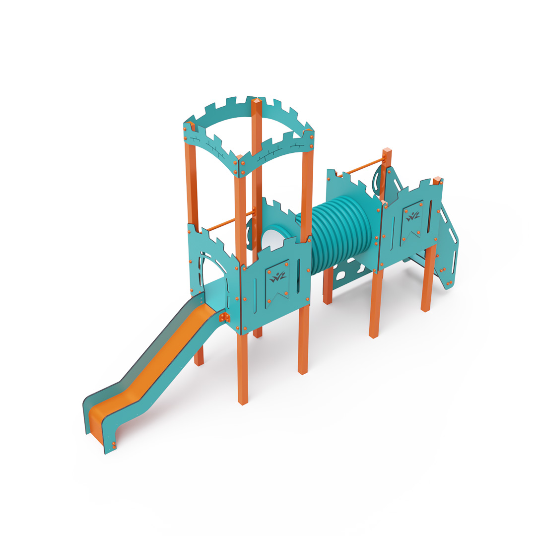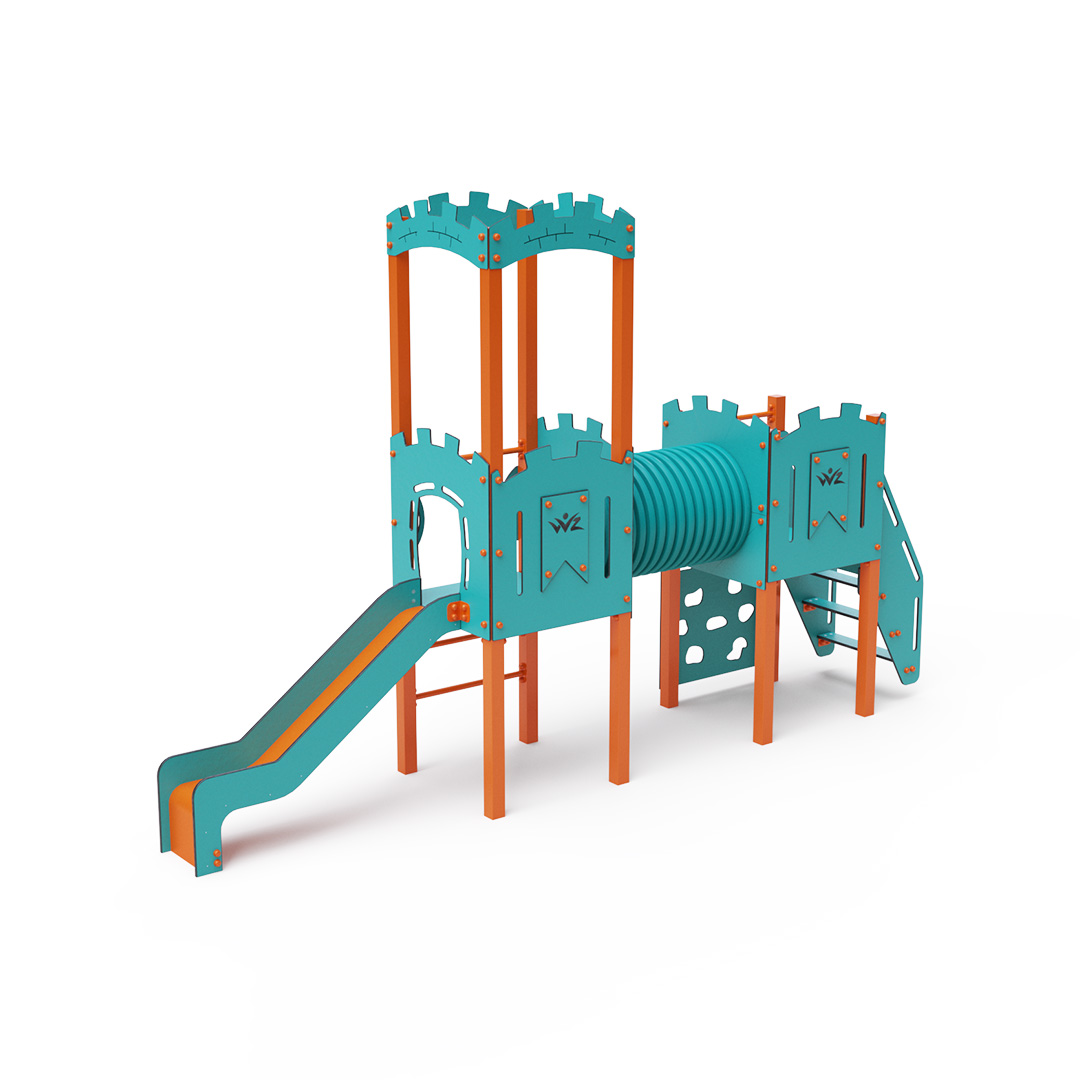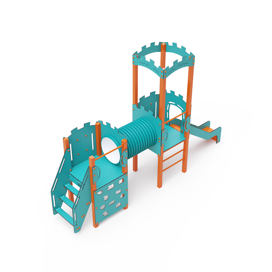 Kombiniertes Zwei-Turm-Set – zwei Türme, die durch einen Tunnel verbunden sind. Kinder können über Stufen oder eine Leiter hinaufklettern und die Rutsche hinuntersausen. Das türkis-orange Design lockt Kinder schon von Weitem zum Spielen an. Die Stahlkonstruktion ist dank Feuerverzinkung und strapazierfähiger Pulverbeschichtung witterungsbeständig. Das verwendete HPL-Material ist chemikalienbeständig, UV-beständig, farbecht, ungiftig, recycelbar und bruchfest. Es besteht keine Verletzungsgefahr durch scharfe Kanten oder Splitter. Alle Verbindungen sind aus Edelstahl und mit Kunststoffkappen versehen, um Haltbarkeit und Sicherheit zu erhöhen.