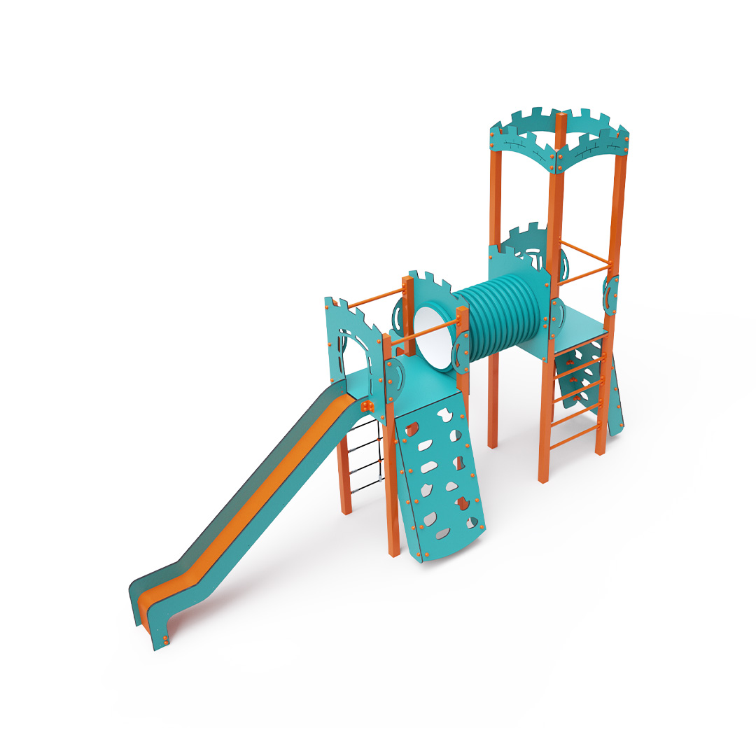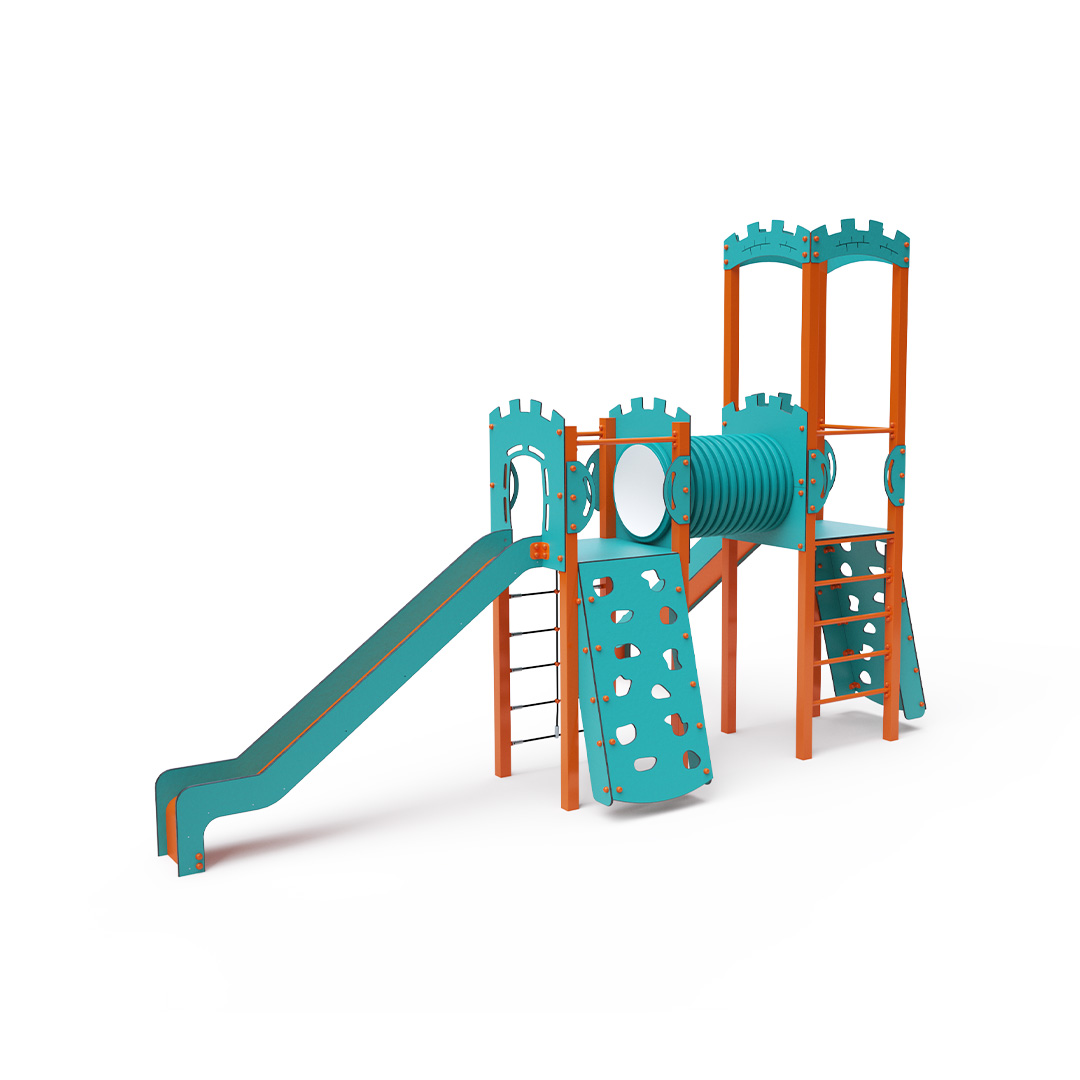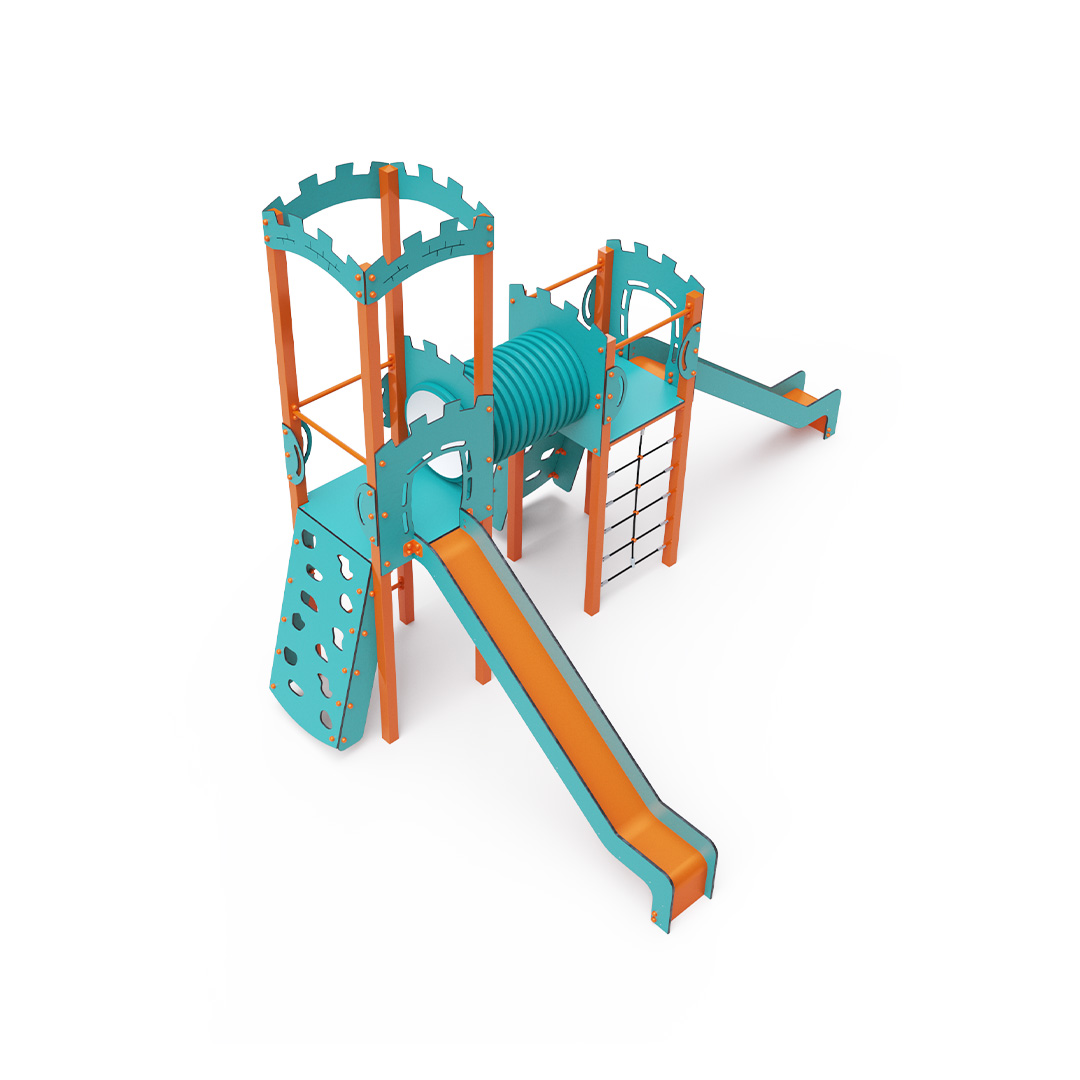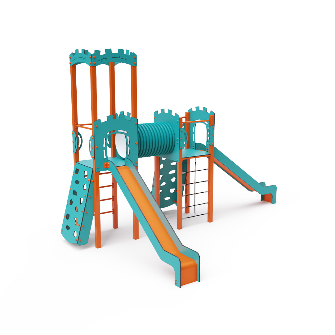 Kombiniertes Zwei-Turm-Set – zwei Türme, die durch einen Tunnel verbunden sind. Kinder können an einer der beiden Kletterwände mit Griffen, einem Seilnetz oder einer Leiter klettern und anschließend eine der beiden Rutschen hinuntersausen. Das türkis-orange Design zieht schon von Weitem die Blicke auf sich. Die Stahlkonstruktion ist dank Feuerverzinkung und strapazierfähiger Pulverbeschichtung witterungsbeständig. Das verwendete HPL-Material ist chemikalienbeständig, UV-beständig, farbecht, ungiftig, recycelbar und bruchfest. Es besteht keine Verletzungsgefahr durch scharfe Kanten oder Splitter. Die Seile bestehen aus Polyesterfasern, die um die zentrale Verstärkung gewickelt sind. Diese Konstruktion erhöht die Festigkeit und Widerstandsfähigkeit der Seile gegen mechanische Belastung. Das Polyester selbst ist resistent gegen Mikroorganismen und Witterungseinflüsse, trocknet schnell nach Regen, ist farbecht und zeichnet sich durch hohe Festigkeit aus. Alle Verbindungen sind aus Edelstahl und mit Kunststoffkappen versehen, um Langlebigkeit und Sicherheit zu erhöhen.