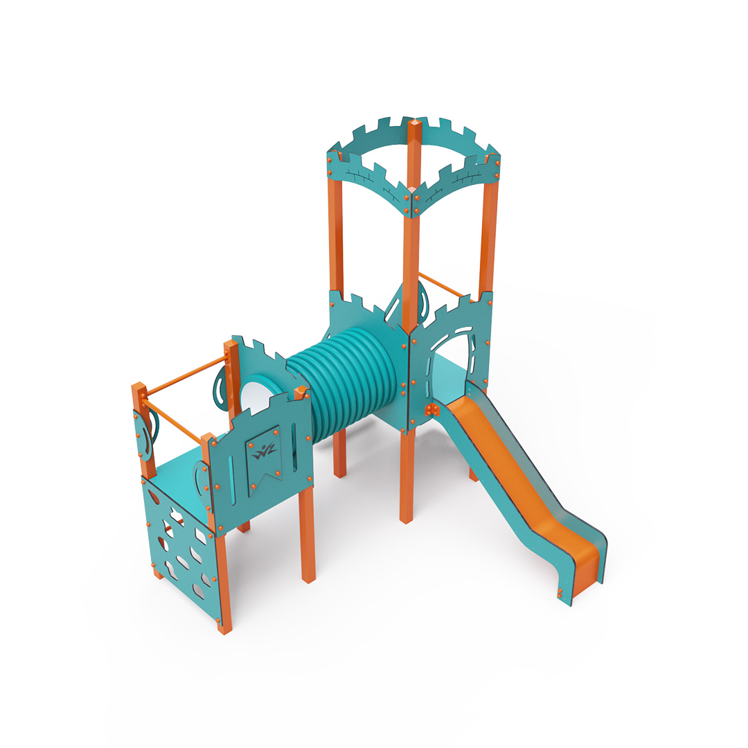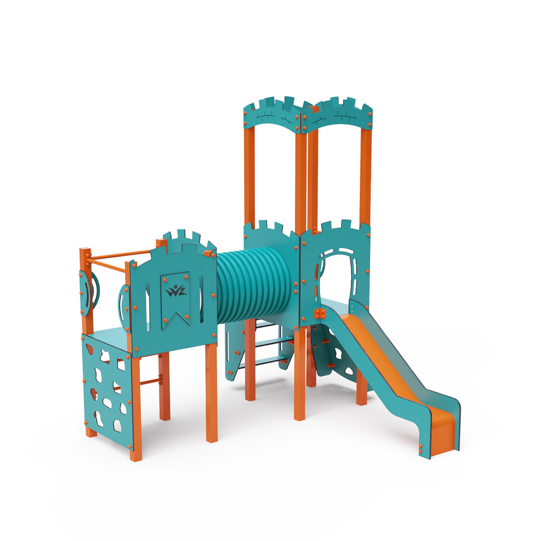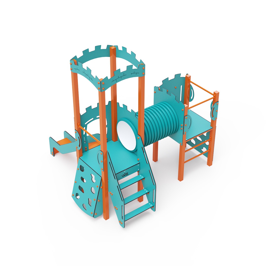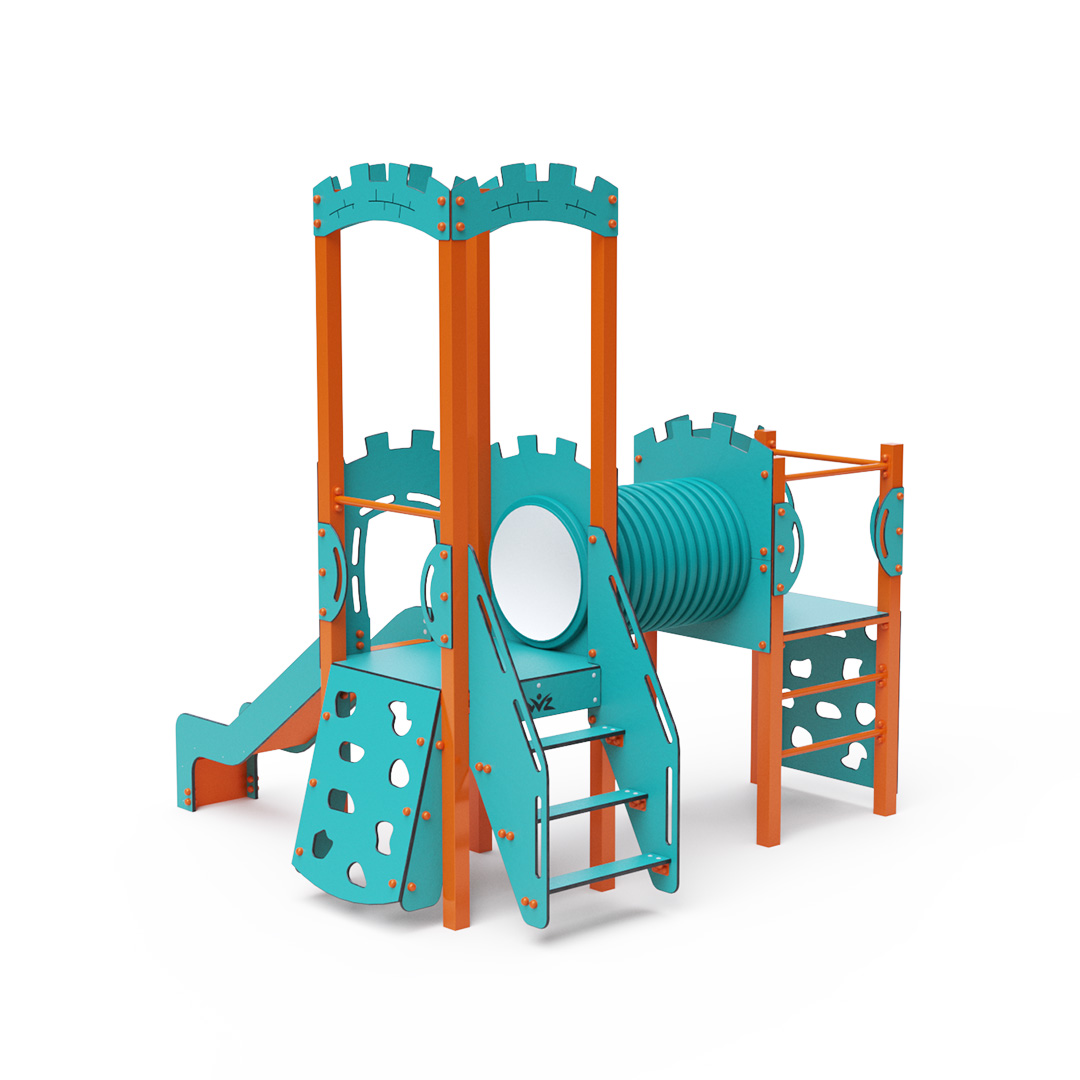 Dieses kombinierte Turmset besteht aus zwei Türmen: einem Turm mit Wänden und einem niedrigeren Turm, die durch einen Tunnel verbunden sind. Kinder können an einer vertikalen oder schrägen Kletterwand mit Griffen, über Stufen oder eine Leiter klettern und eine Rutsche hinuntersausen. Das türkis-orange Design lockt Kinder schon von Weitem zum Spielen an. Die Stahlkonstruktion ist dank Feuerverzinkung und strapazierfähiger Pulverbeschichtung witterungsbeständig. Das verwendete HPL-Material ist chemikalienbeständig, UV-beständig, farbecht, ungiftig, recycelbar und bruchfest. Es besteht keine Verletzungsgefahr durch scharfe Kanten oder Splitter. Alle Verbindungen sind aus Edelstahl und mit Kunststoffkappen versehen, um Langlebigkeit und Sicherheit zu erhöhen.
