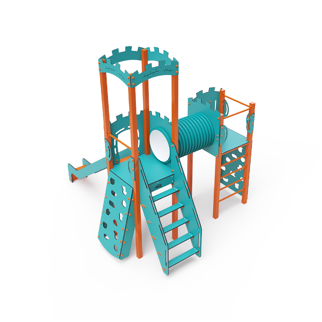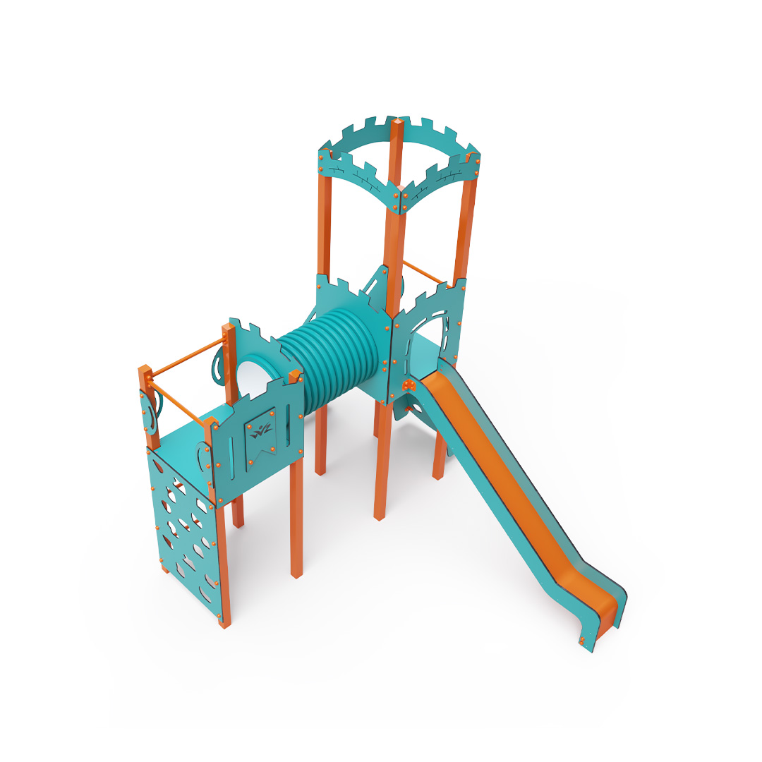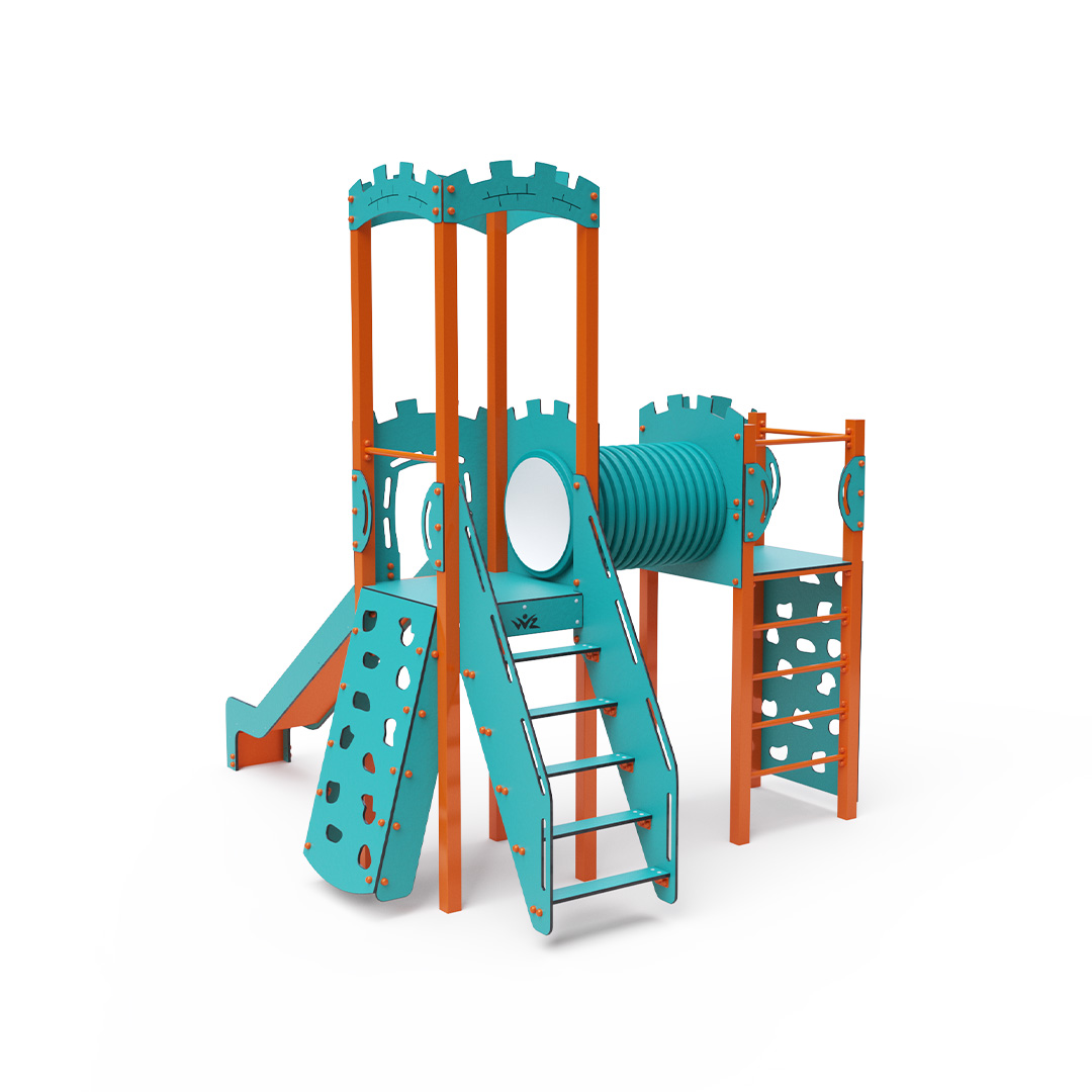 Dieses kombinierte Turmset besteht aus zwei Türmen: einem Turm mit Wänden und einem niedrigeren Turm, die durch einen Tunnel verbunden sind. Kinder können an einer vertikalen oder schrägen Kletterwand mit Griffen, über Stufen oder eine Leiter klettern und eine Rutsche hinuntersausen. Das türkis-orange Design lockt Kinder schon von Weitem zum Spielen an. Die Stahlkonstruktion ist dank Feuerverzinkung und strapazierfähiger Pulverbeschichtung witterungsbeständig. Das verwendete HPL-Material ist chemikalienbeständig, UV-beständig, farbecht, ungiftig, recycelbar und bruchfest. Es besteht keine Verletzungsgefahr durch scharfe Kanten oder Splitter. Alle Verbindungen sind aus Edelstahl und mit Kunststoffkappen versehen, um Langlebigkeit und Sicherheit zu erhöhen.