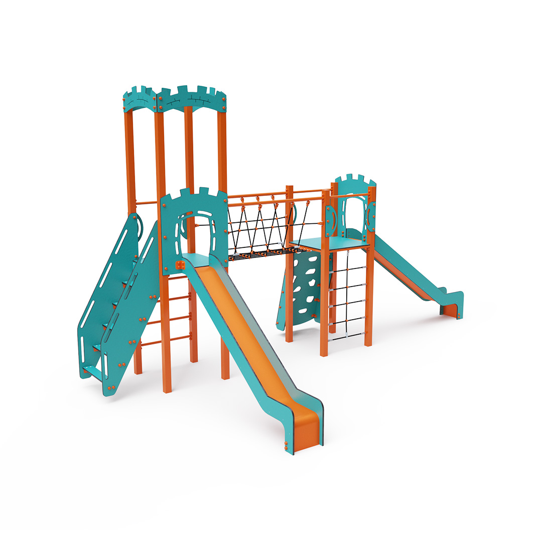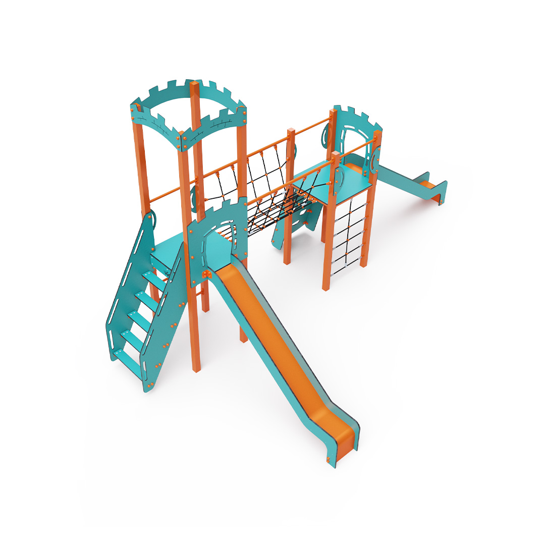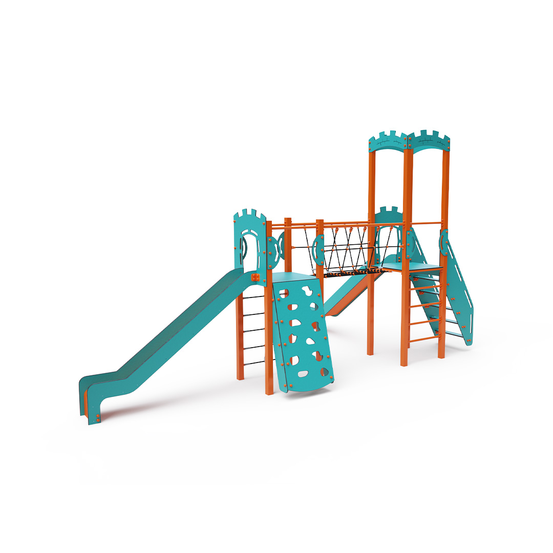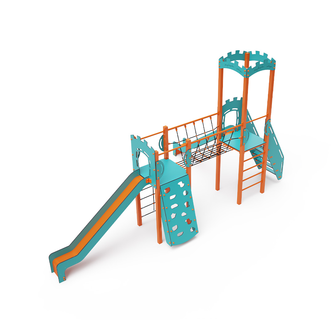 Kombiniertes Zwei-Turm-Set – zwei Türme, die durch eine Seilbrücke verbunden sind. Kinder können an einer Kletterwand mit Griffen, einer Leiter, einem Seilnetz oder Stufen klettern und eine der beiden Rutschen hinuntersausen. Das türkis-orange Design zieht schon von Weitem die Blicke auf sich. Die Stahlkonstruktion ist dank Feuerverzinkung und strapazierfähiger Pulverbeschichtung witterungsbeständig. Das verwendete HPL-Material ist chemikalienbeständig, UV-beständig, farbecht, ungiftig, recycelbar und bruchfest.
