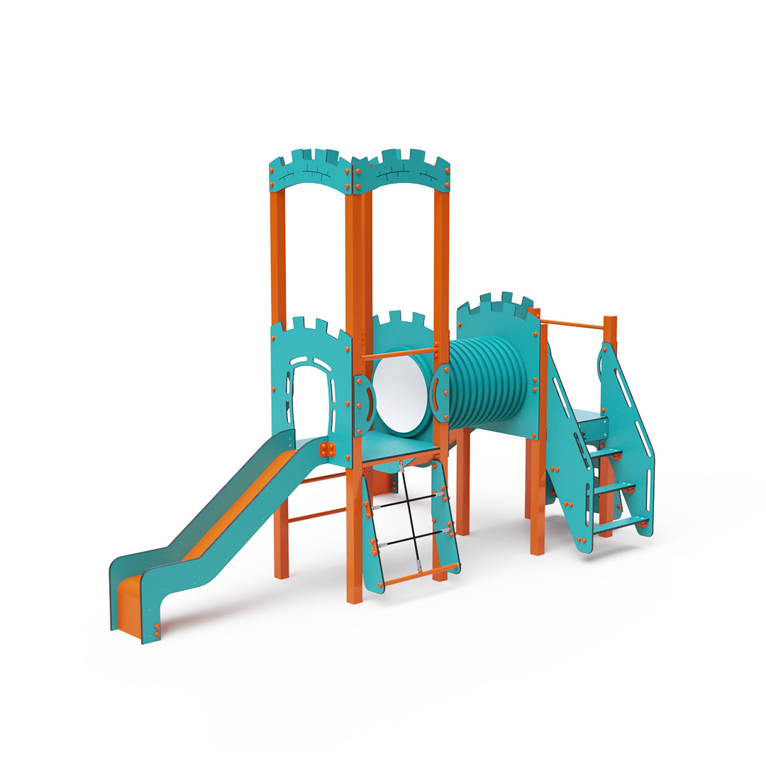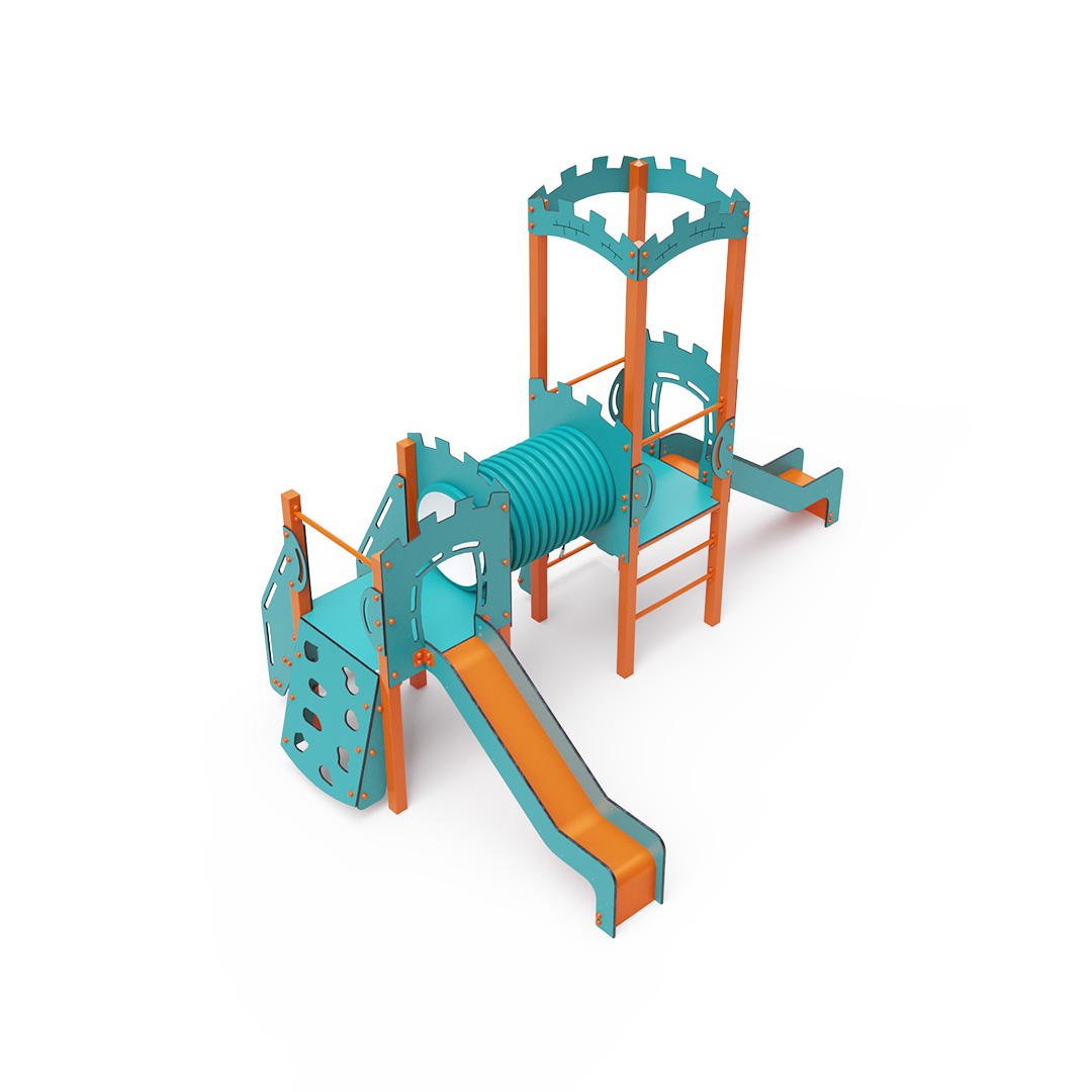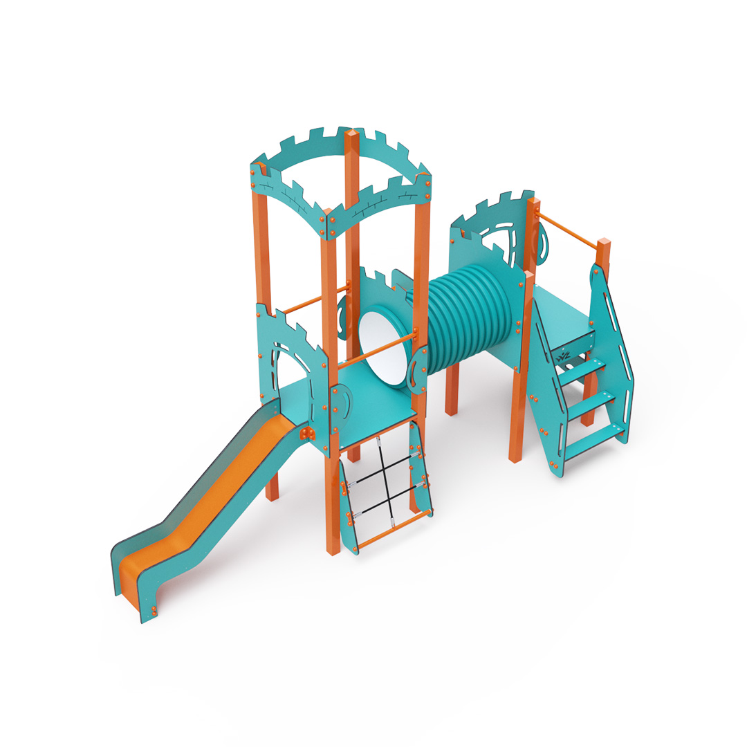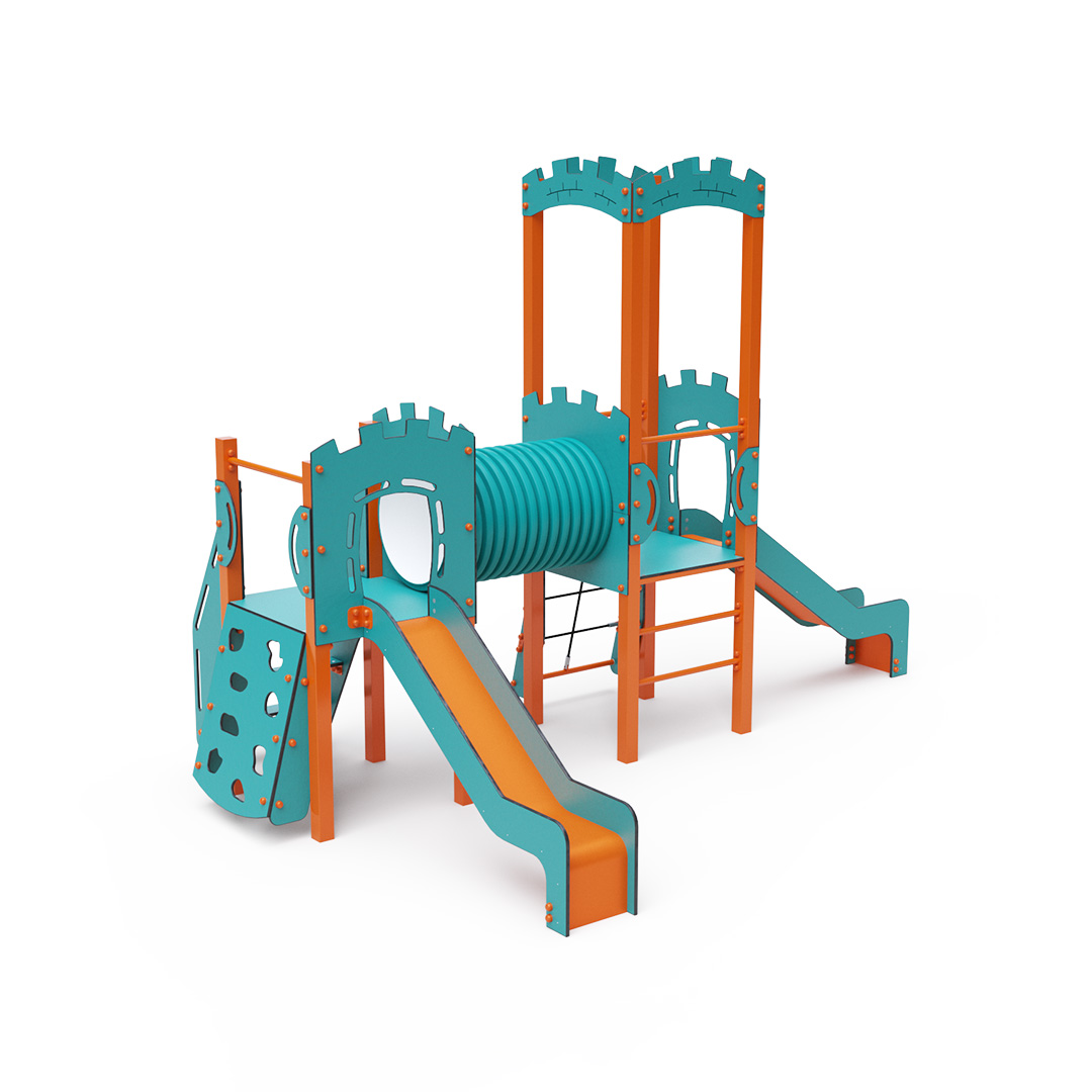 Kombiniertes Zwei-Turm-Set – zwei Türme, die durch einen Tunnel verbunden sind. Kinder können an der Kletterwand mit Griffen, einer Leiter, Stufen oder einem Seilnetz klettern und eine der beiden Rutschen hinuntersausen. Das türkis-orange Design zieht schon von Weitem die Blicke auf sich. Die Stahlkonstruktion ist dank Feuerverzinkung und strapazierfähiger Pulverbeschichtung witterungsbeständig. Das verwendete HPL-Material ist chemikalienbeständig, UV-beständig, farbecht, ungiftig, recycelbar und bruchfest. Es besteht keine Verletzungsgefahr durch scharfe Kanten oder Splitter. Die Seile bestehen aus Polyesterfasern, die um eine zentrale Verstärkung gewickelt sind. Diese Konstruktion erhöht die Festigkeit und Widerstandsfähigkeit gegen mechanische Belastung. Polyester ist resistent gegen Mikroorganismen, witterungsbeständig, schnelltrocknend, farbecht und zeichnet sich durch hohe Festigkeit aus. Alle Verbindungen sind aus Edelstahl und mit Kunststoffkappen versehen, um Langlebigkeit und Sicherheit zu erhöhen.
