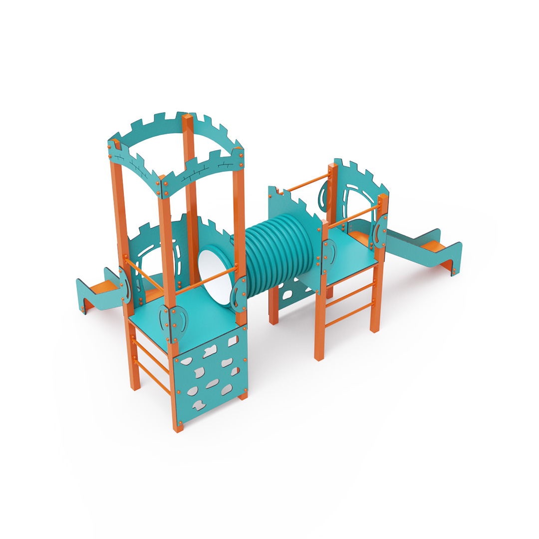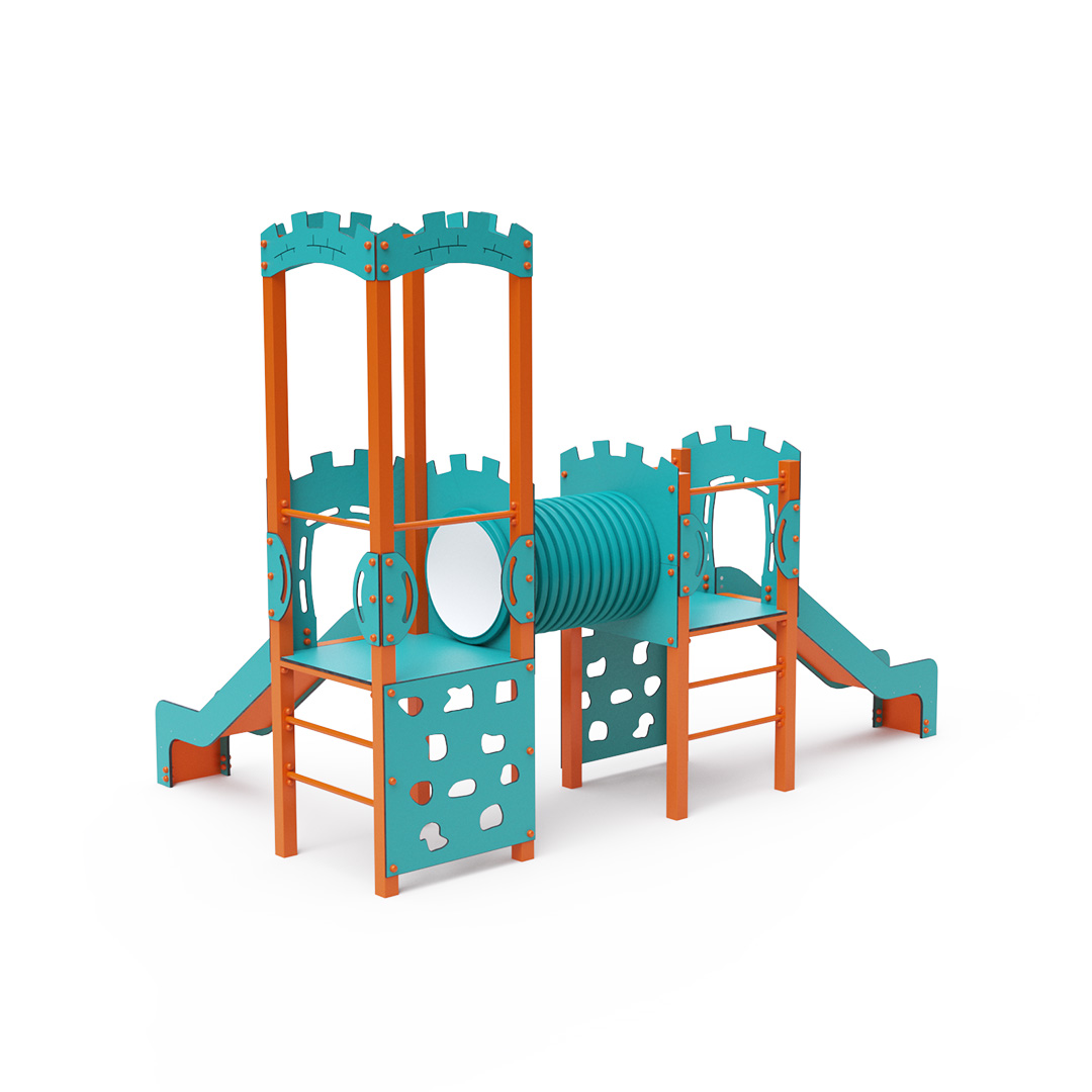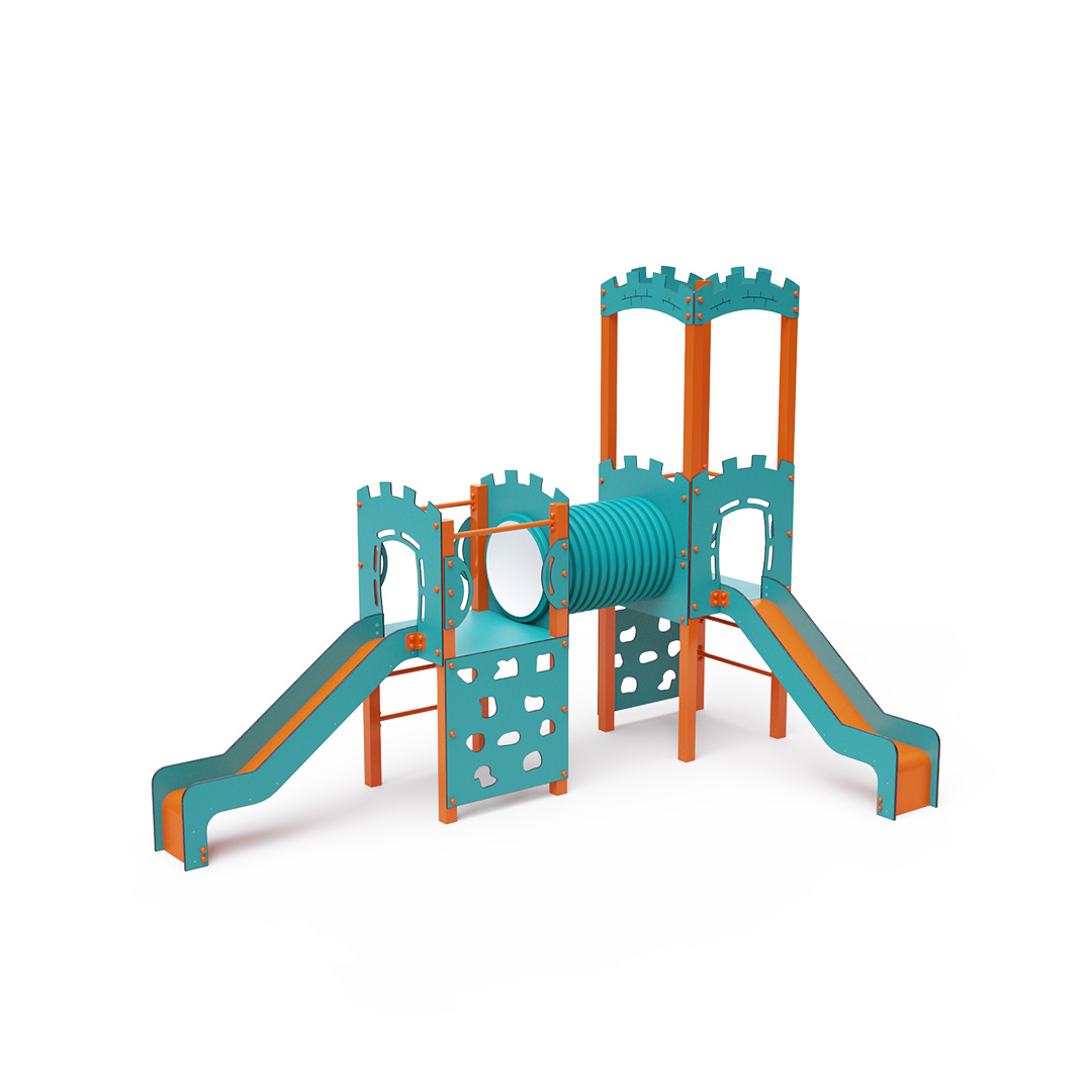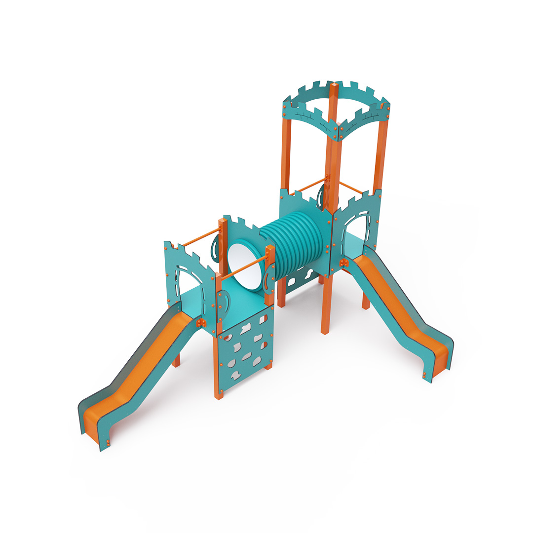Dieses kombinierte Turmset besteht aus zwei Türmen – einem Turm mit Wänden und einem niedrigeren, die durch einen Tunnel verbunden sind. Kinder können an einer Kletterwand mit Griffen, einer Leiter, Stufen oder einem Seilnetz klettern und eine der beiden Rutschen hinuntersausen. Das türkis-orange Design lockt Kinder schon von Weitem zum Spielen an. Die Stahlkonstruktion ist dank Feuerverzinkung und strapazierfähiger Pulverbeschichtung witterungsbeständig. Das verwendete HPL-Material ist chemikalienbeständig, UV-beständig, farbecht, ungiftig, recycelbar und bruchfest. Es besteht keine Verletzungsgefahr durch scharfe Kanten oder Splitter. Alle Verbindungen sind aus Edelstahl und mit Kunststoffkappen versehen, um Langlebigkeit und Sicherheit zu erhöhen.