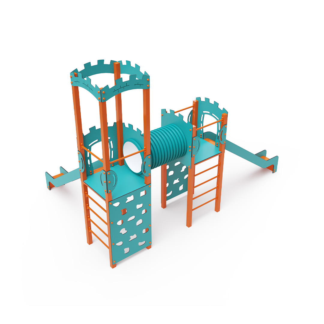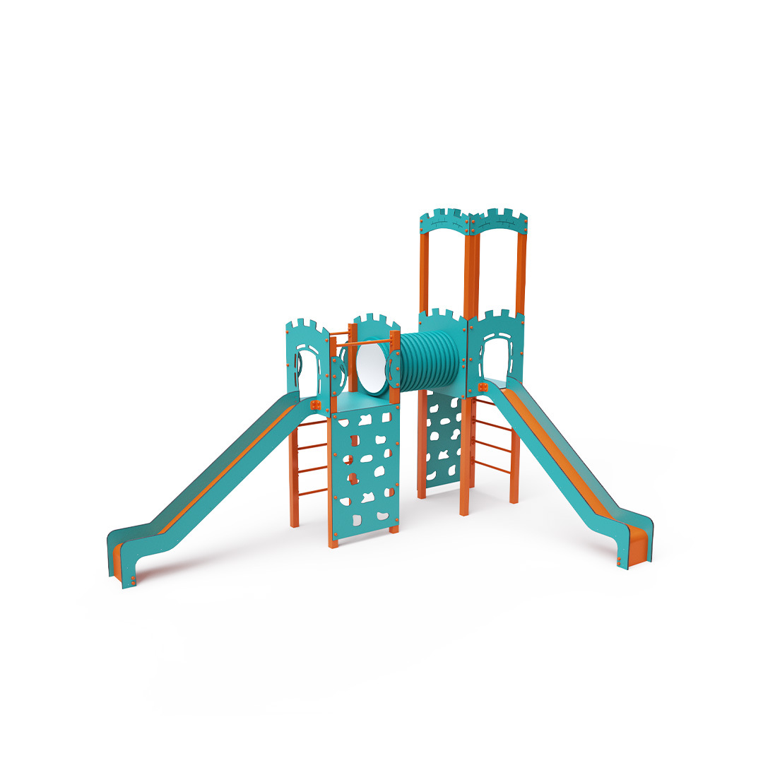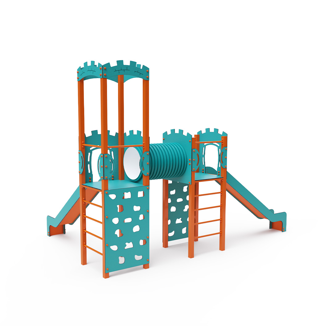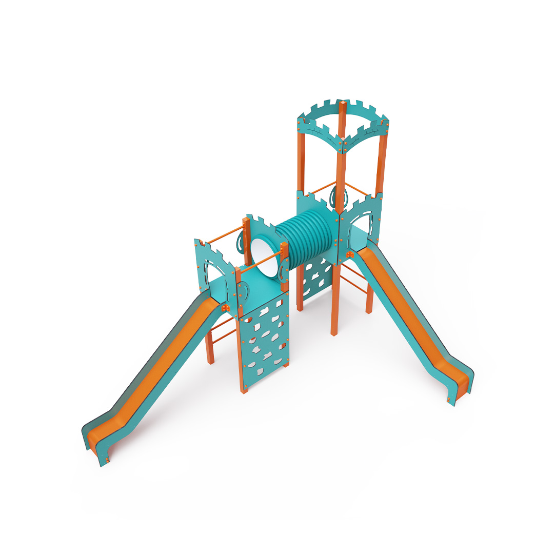 Dieses kombinierte Turmset besteht aus zwei Türmen – einem Turm mit Wänden und einem niedrigeren, die durch einen Tunnel verbunden sind. Kinder können an einer Kletterwand mit Griffen, einer Leiter, Stufen oder einem Seilnetz klettern und eine der beiden Rutschen hinuntersausen. Das türkis-orange Design zieht schon von Weitem die Blicke auf sich. Die Stahlkonstruktion ist dank Feuerverzinkung und strapazierfähiger Pulverbeschichtung witterungsbeständig. Das verwendete HPL-Material ist chemikalienbeständig, UV-beständig, farbecht, ungiftig, recycelbar und bruchfest. Es besteht keine Verletzungsgefahr durch scharfe Kanten oder Splitter. Alle Verbindungen sind aus Edelstahl und mit Kunststoffkappen versehen, um Haltbarkeit und Sicherheit zu erhöhen.