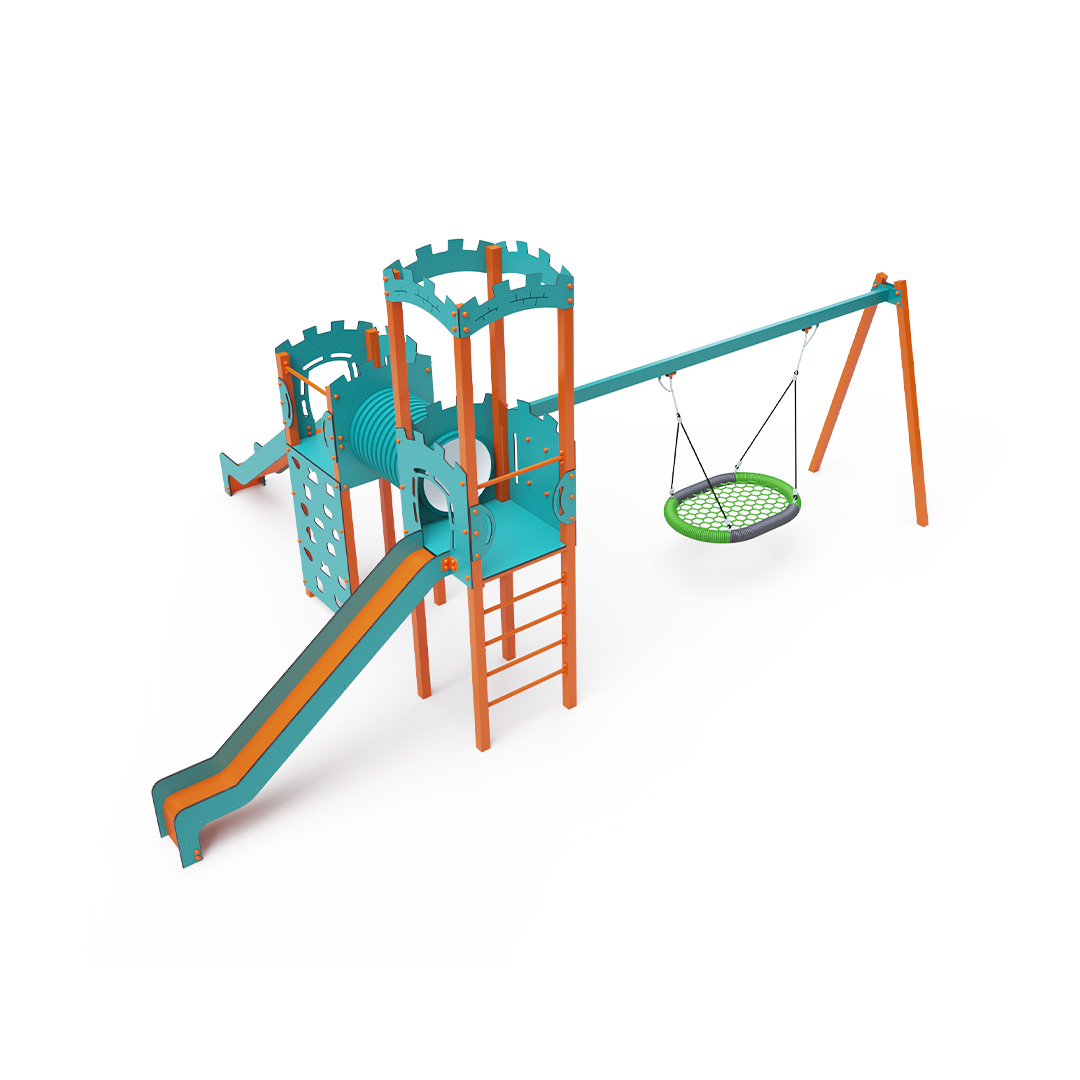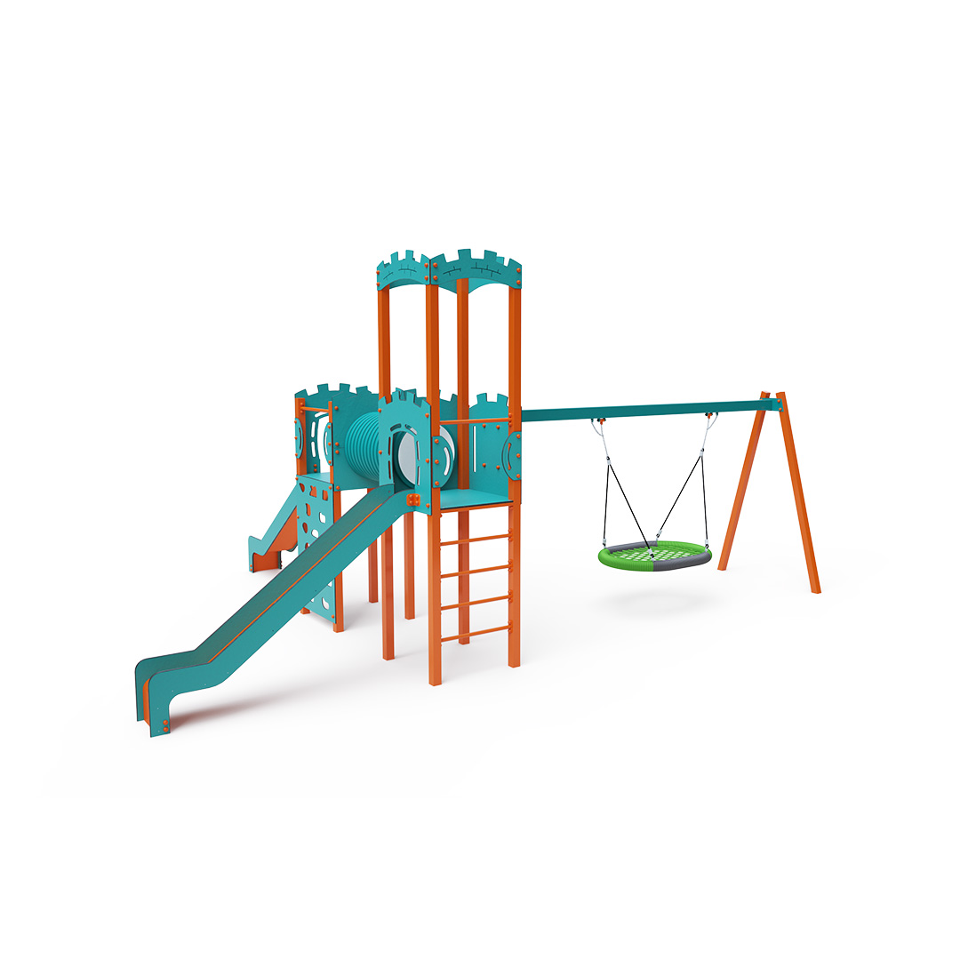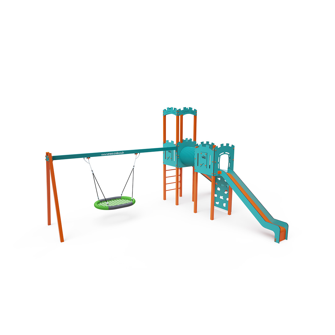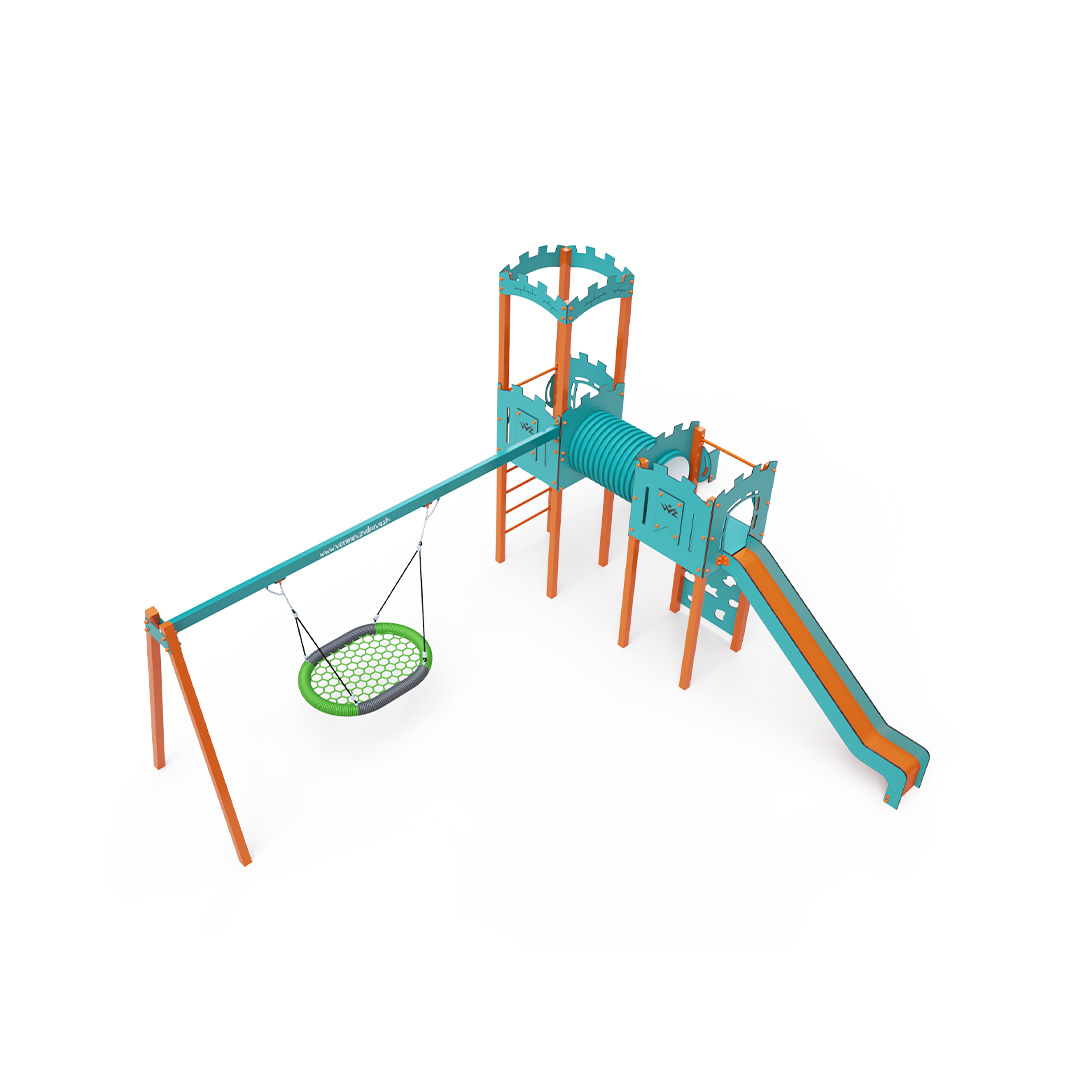 Das kombinierte Zwei-Turm-Set besteht aus einem Turm mit Wänden und einem niedrigeren Turm, die durch einen Tunnel verbunden sind. Kinder können an einer Kletterwand mit Griffen oder einer Leiter hochklettern und eine der beiden Rutschen hinuntersausen. Zum Spielset gehört auch ein Klettergerüst mit Nest. Das türkis-orange Design zieht schon von Weitem die Blicke auf sich. Die Stahlkonstruktion ist dank Feuerverzinkung und strapazierfähiger Pulverbeschichtung witterungsbeständig. Das verwendete HPL-Material ist chemikalienbeständig, UV-beständig, farbecht, ungiftig, recycelbar und bruchfest. Es besteht keine Verletzungsgefahr durch scharfe Kanten oder Splitter. Alle Verbindungen sind aus Edelstahl und mit Kunststoffkappen versehen, um Langlebigkeit und Sicherheit zu erhöhen.