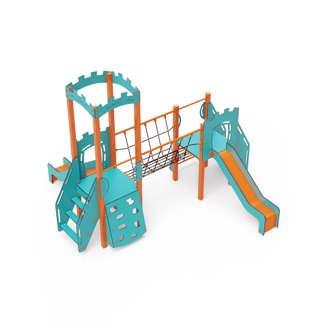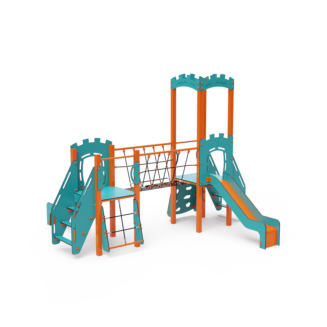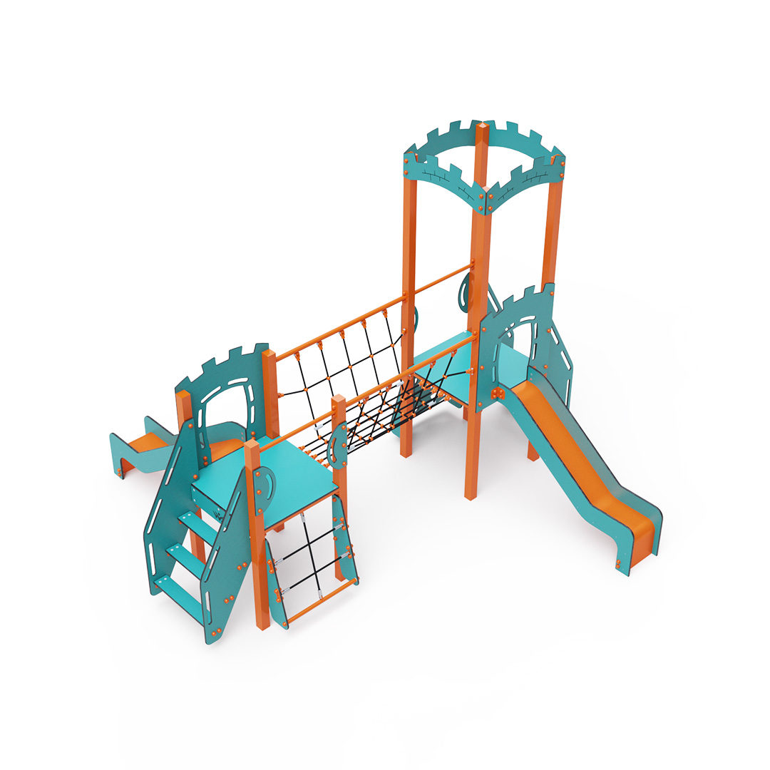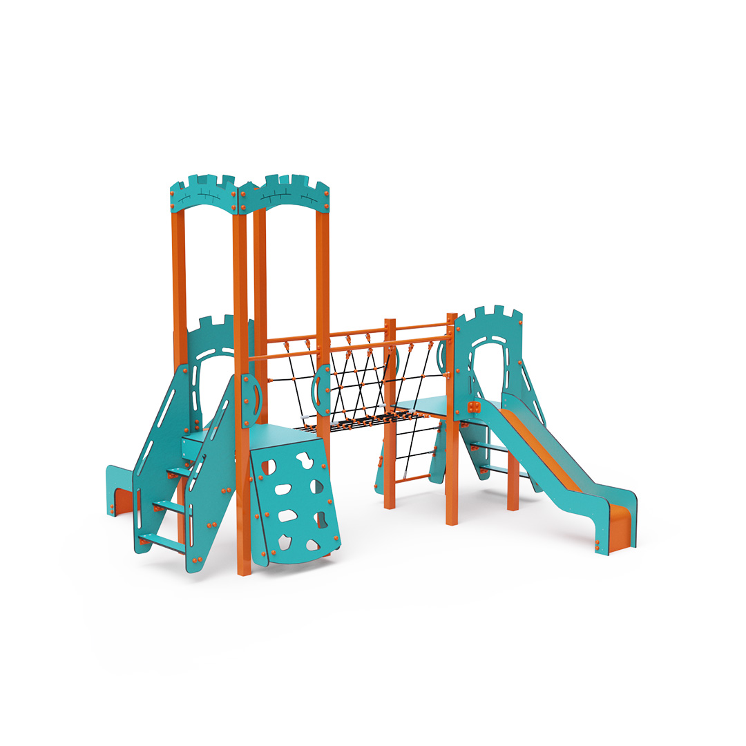 Kombiniertes Zwei-Turm-Set – zwei Türme, die durch eine Seilbrücke verbunden sind. Kinder können an einer schrägen Kletterwand mit Griffen, Stufen oder einem schrägen Seilnetz klettern und eine der beiden Rutschen hinuntersausen. Das türkis-orange Design lädt schon von Weitem zum Spielen ein. Die Stahlkonstruktion ist dank Feuerverzinkung und strapazierfähiger Pulverbeschichtung witterungsbeständig. Das verwendete HPL-Material ist chemikalienbeständig, UV-beständig, farbecht, ungiftig, recycelbar und bruchfest. Es besteht keine Verletzungsgefahr durch scharfe Kanten oder Splitter. Die Seile bestehen aus Polyesterfasern, die um die zentrale Verstärkung gewickelt sind. Diese Konstruktion erhöht die Festigkeit und Widerstandsfähigkeit der Seile gegen mechanische Belastung. Das Polyester selbst ist resistent gegen Mikroorganismen und Witterungseinflüsse, trocknet nach Regen schnell, ist farbecht und zeichnet sich durch hohe Festigkeit aus. Alle Verbindungen sind aus Edelstahl und mit Kunststoffkappen versehen, um Haltbarkeit und Sicherheit zu erhöhen.