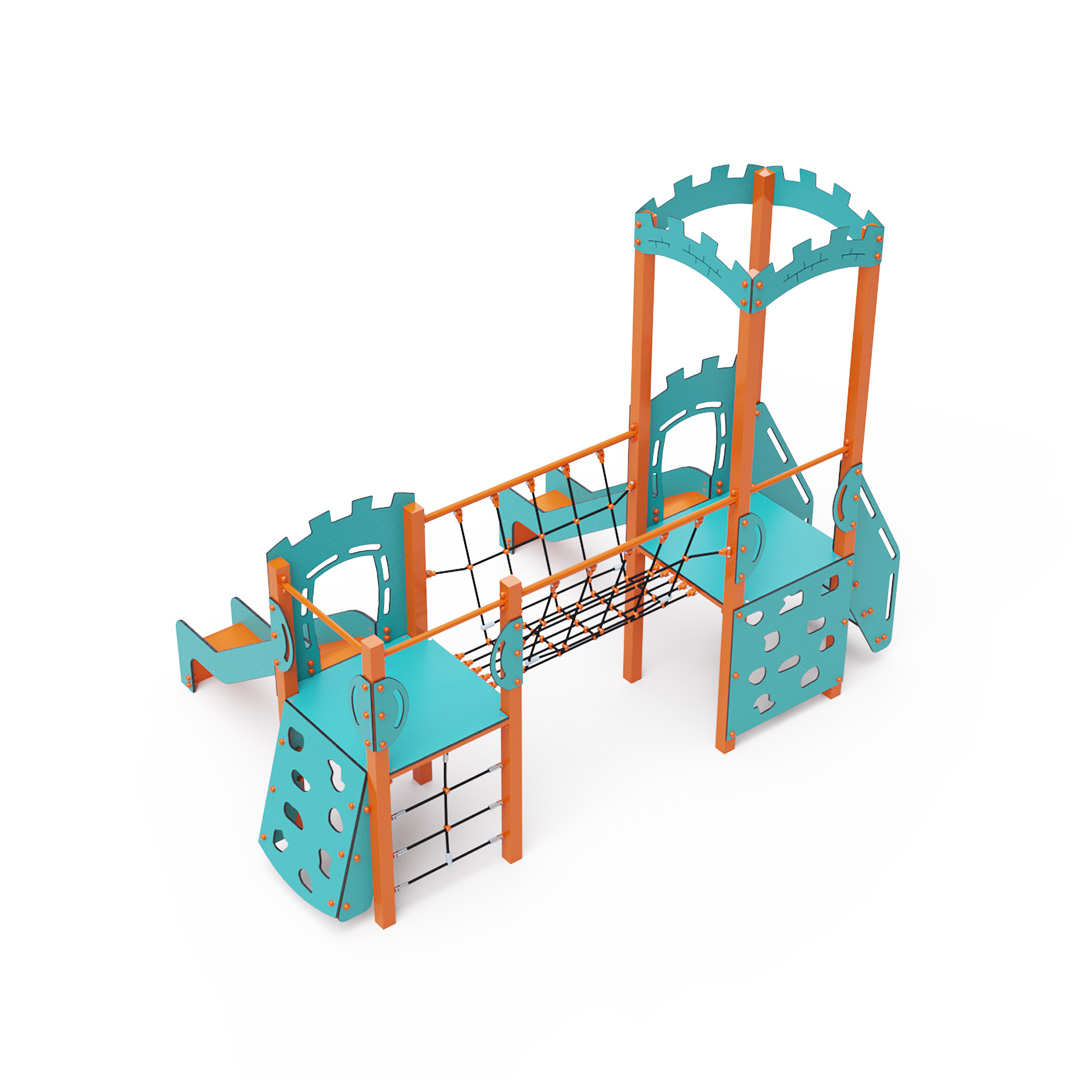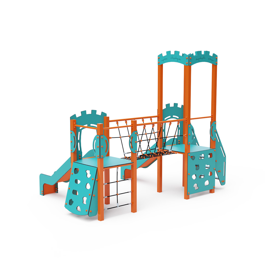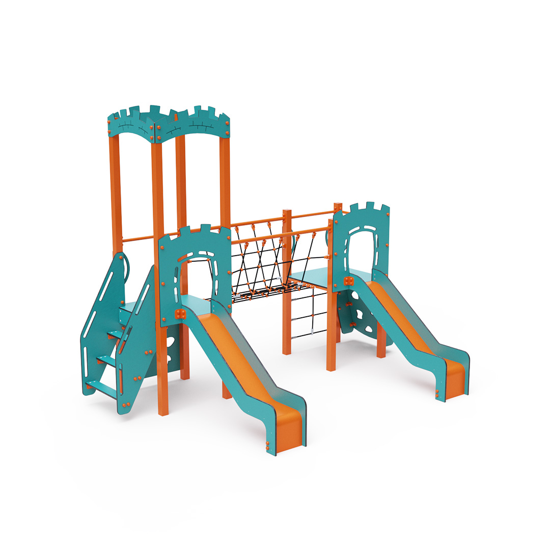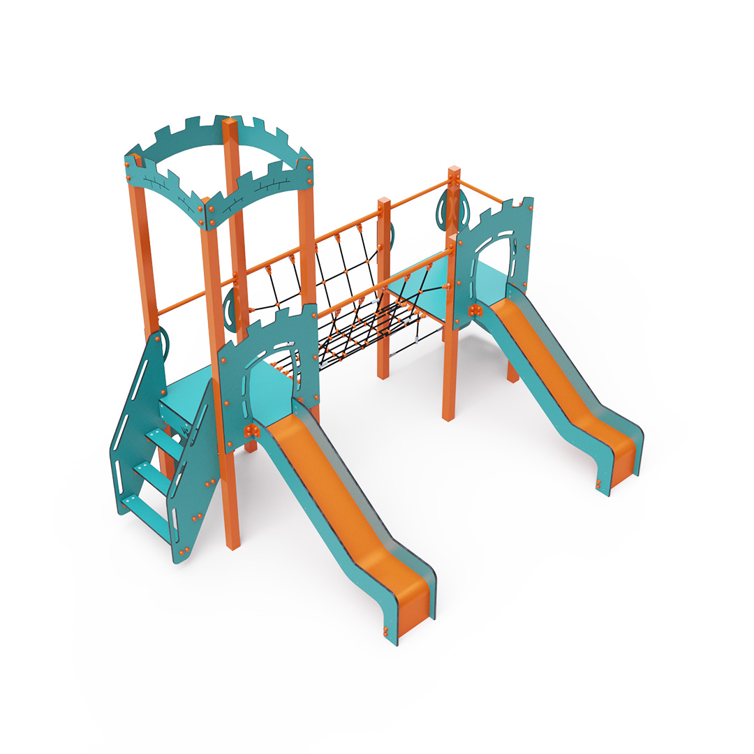 Kinder können das Set über Stufen, eine schräge oder senkrechte Kletterwand mit Griffen oder ein Seilnetz erklimmen und eine der beiden Rutschen hinuntersausen. Das türkis-orange Design zieht schon von Weitem die Blicke auf sich. Die Stahlkonstruktion ist dank Feuerverzinkung und strapazierfähiger Pulverbeschichtung witterungsbeständig. Das verwendete HPL-Material ist chemikalienbeständig, UV-beständig, farbecht, ungiftig, recycelbar und bruchfest. Es besteht keine Verletzungsgefahr durch scharfe Kanten oder Splitter. Die Seile bestehen aus Polyesterfasern, die um die zentrale Verstärkung gewickelt sind. Diese Konstruktion erhöht die Festigkeit und Widerstandsfähigkeit der Seile gegen mechanische Belastung. Das Polyester selbst ist resistent gegen Mikroorganismen und Witterungseinflüsse, trocknet schnell nach Regen, ist farbecht und zeichnet sich durch hohe Festigkeit aus. Alle Verbindungen sind aus Edelstahl und mit Kunststoffkappen versehen, um Langlebigkeit und Sicherheit zu erhöhen.