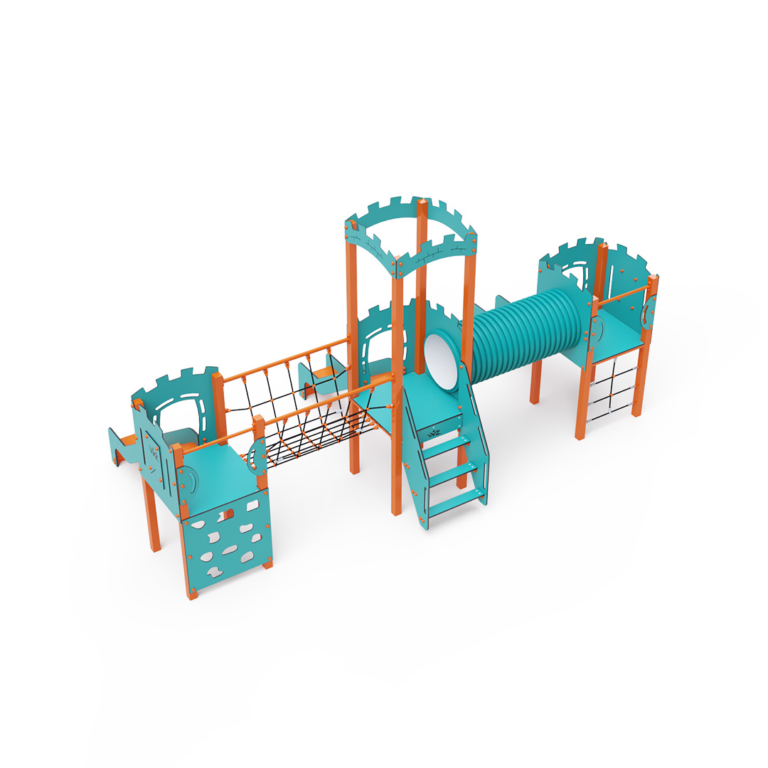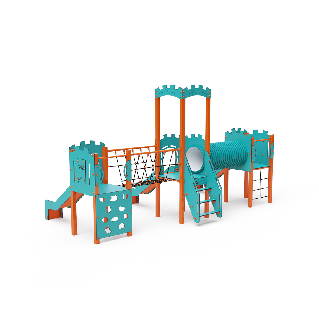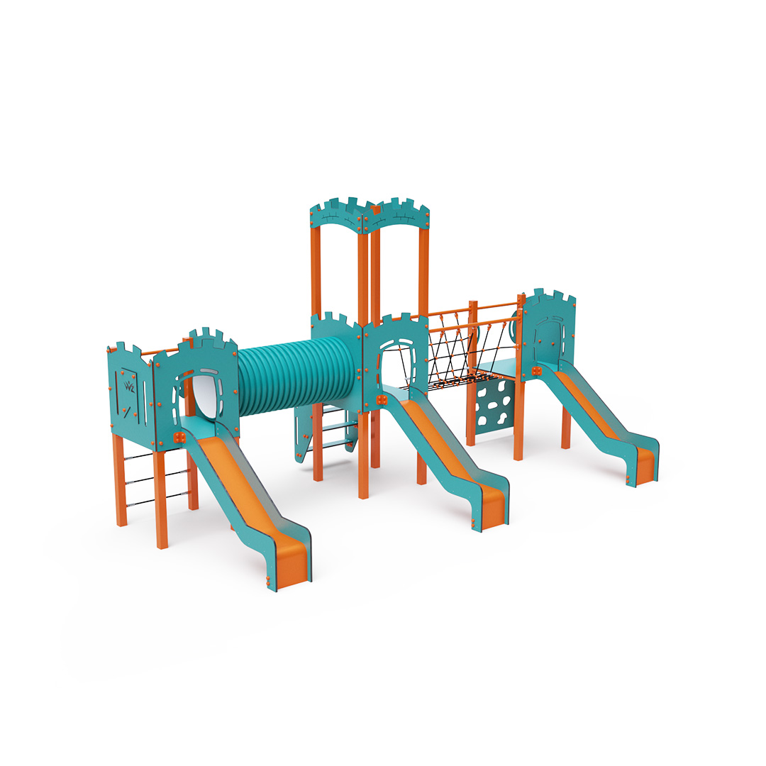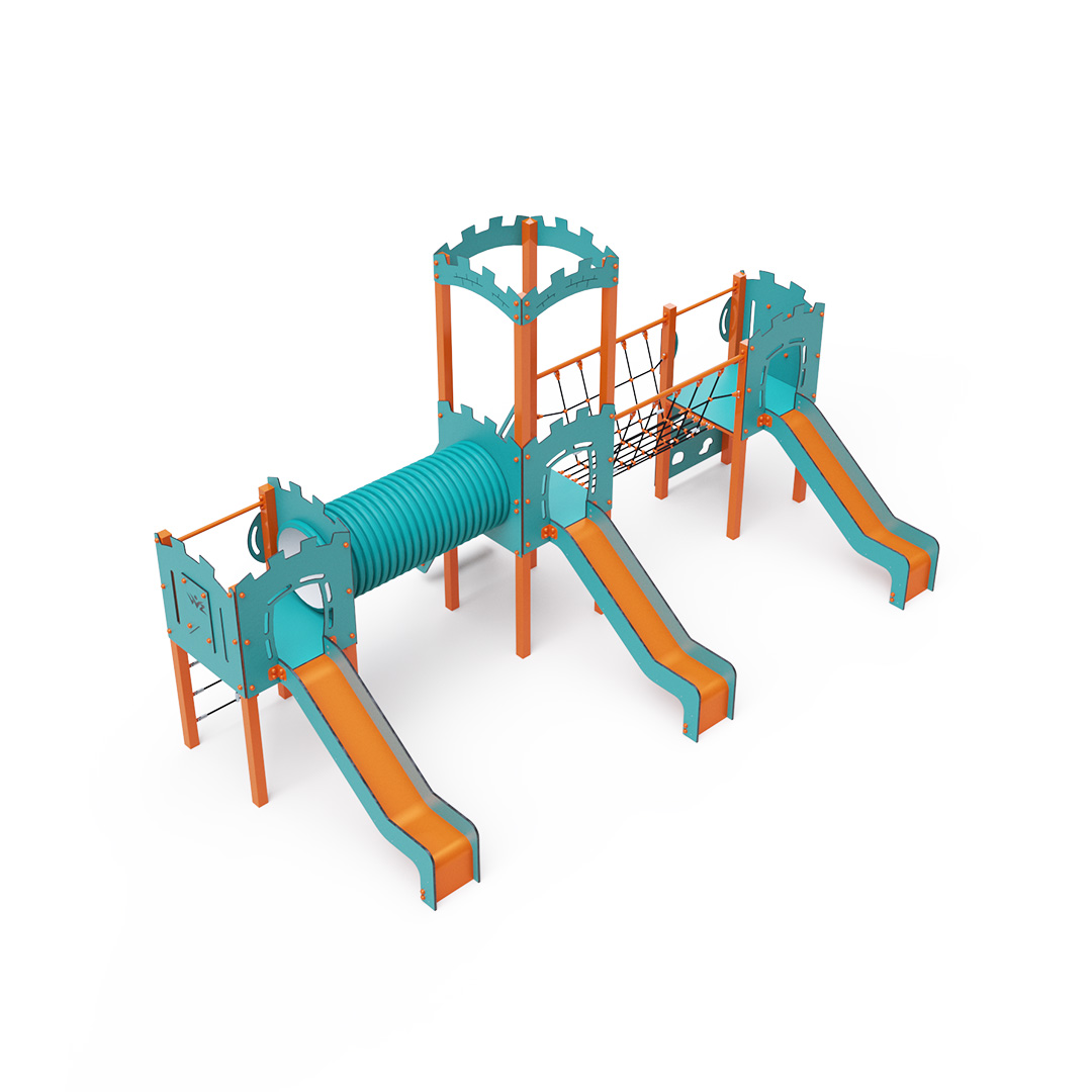 Das kombinierte Dreiturmset besteht aus zwei Türmen, die durch eine Seilbrücke und einen Tunnel mit dem mittleren Turm verbunden sind. Kinder können die Anlage über Stufen, eine vertikale Kletterwand mit Griffen oder ein Seilnetz erklimmen und eine der drei Rutschen hinuntersausen. Das türkis-orange Design zieht schon von Weitem die Blicke auf sich. Die Stahlkonstruktion ist dank Feuerverzinkung und strapazierfähiger Pulverbeschichtung witterungsbeständig. Das verwendete HPL-Material ist chemikalienbeständig, UV-beständig, farbecht, ungiftig, recycelbar und bruchfest. Es besteht keine Verletzungsgefahr durch scharfe Kanten oder Splitter. Die Seile bestehen aus Polyesterfasern, die um die zentrale Verstärkung gewickelt sind. Diese Konstruktion erhöht die Festigkeit und Widerstandsfähigkeit der Seile gegen mechanische Belastung. Das Polyester selbst ist resistent gegen Mikroorganismen und Witterungseinflüsse, trocknet schnell nach Regen, ist farbecht und zeichnet sich durch hohe Festigkeit aus. Alle Verbindungen sind aus Edelstahl und mit Kunststoffkappen versehen, um Langlebigkeit und Sicherheit zu erhöhen.