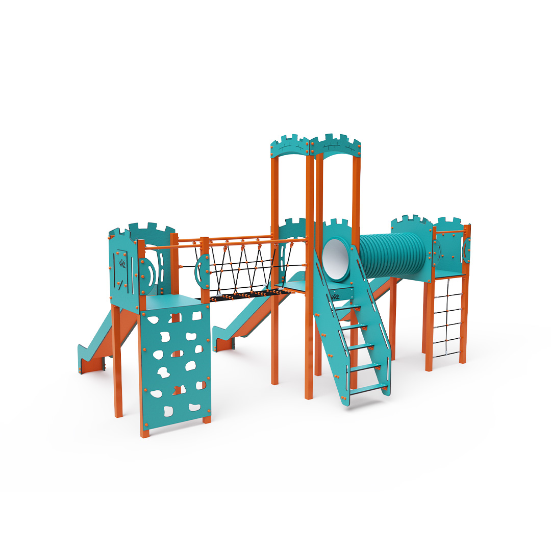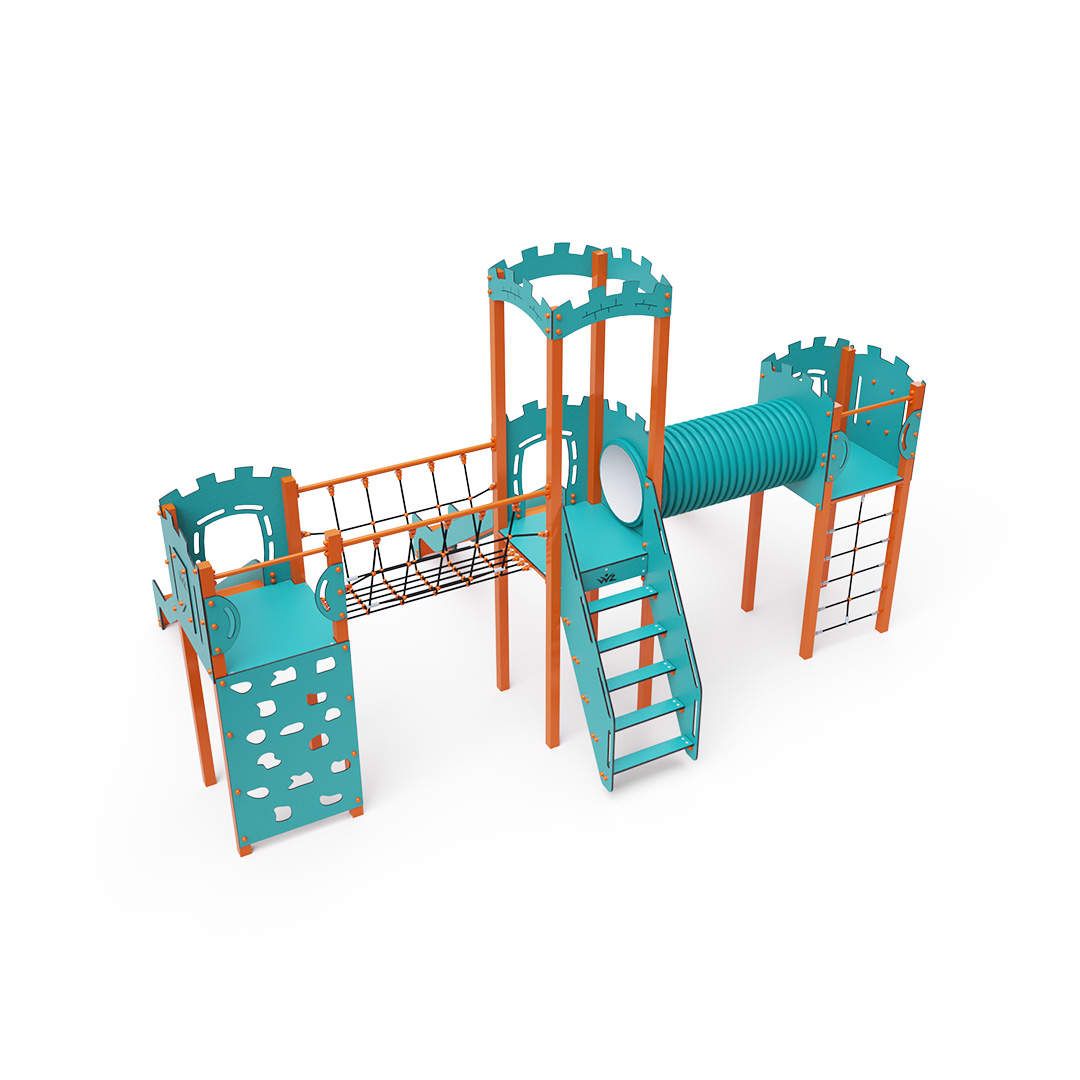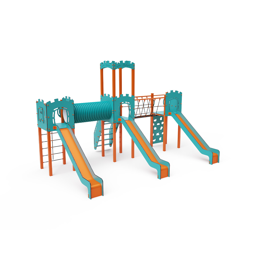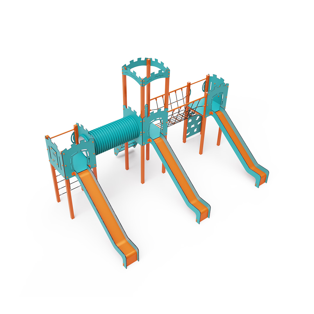 Das kombinierte Dreiturmset besteht aus zwei Türmen, die durch eine Seilbrücke und einen Tunnel mit dem mittleren Turm verbunden sind. Kinder können die Anlage über Stufen, eine vertikale Kletterwand mit Griffen oder ein Seilnetz erklimmen und eine der drei Rutschen hinuntersausen. Das türkis-orange Design zieht schon von Weitem die Blicke auf sich. Die Stahlkonstruktion ist dank Feuerverzinkung und strapazierfähiger Pulverbeschichtung witterungsbeständig. Das verwendete HPL-Material ist chemikalienbeständig, UV-beständig, farbecht, ungiftig, recycelbar und bruchfest. Es besteht keine Verletzungsgefahr durch scharfe Kanten oder Splitter. Die Seile bestehen aus Polyesterfasern, die um die zentrale Verstärkung gewickelt sind. Diese Konstruktion erhöht die Festigkeit und Widerstandsfähigkeit der Seile gegen mechanische Belastung. Das Polyester selbst ist resistent gegen Mikroorganismen und Witterungseinflüsse, trocknet schnell nach Regen, ist farbecht und zeichnet sich durch hohe Festigkeit aus. Alle Verbindungen sind aus Edelstahl und mit Kunststoffkappen versehen, um Langlebigkeit und Sicherheit zu erhöhen.