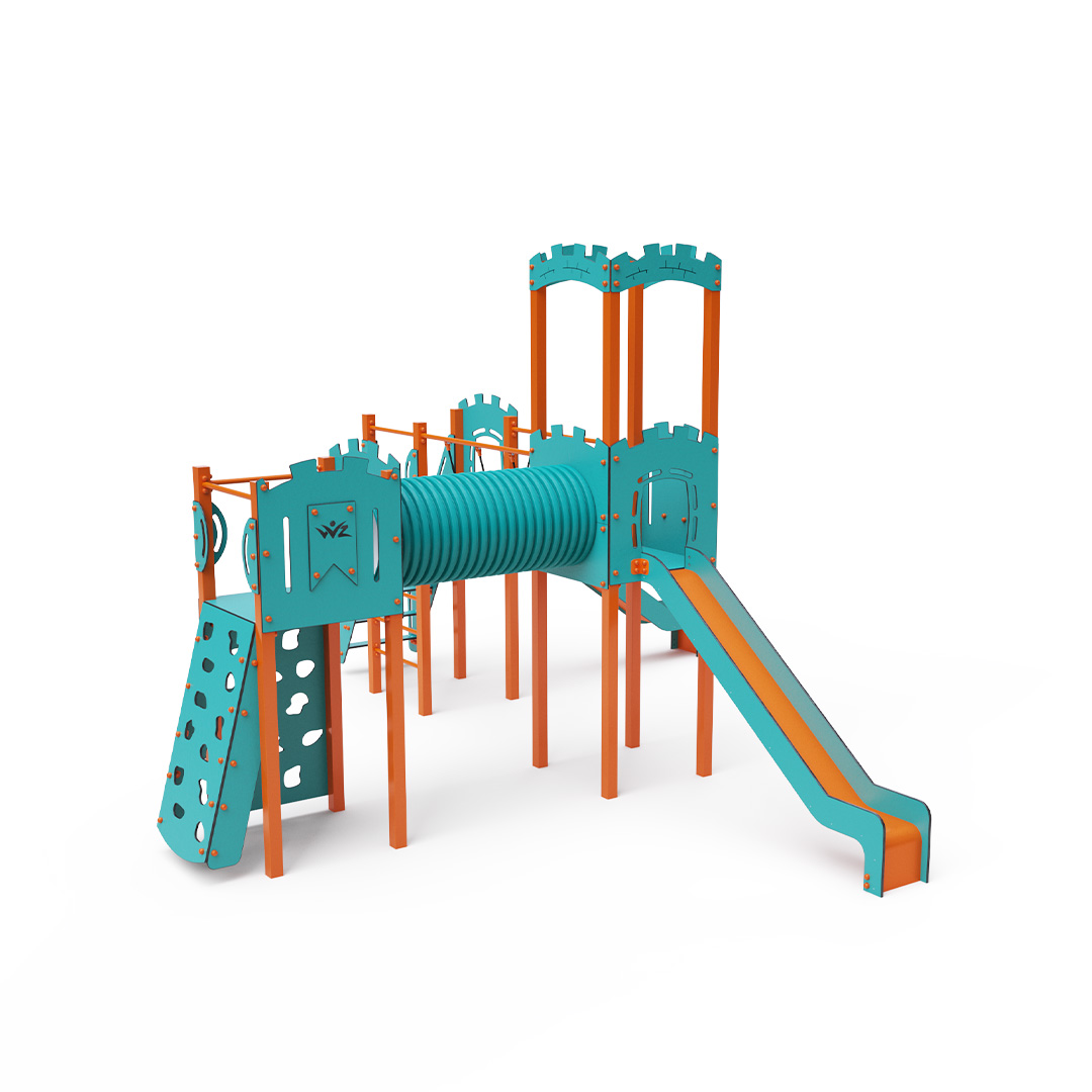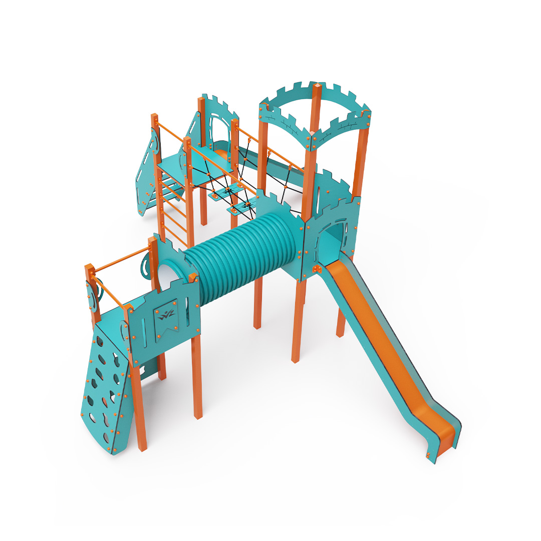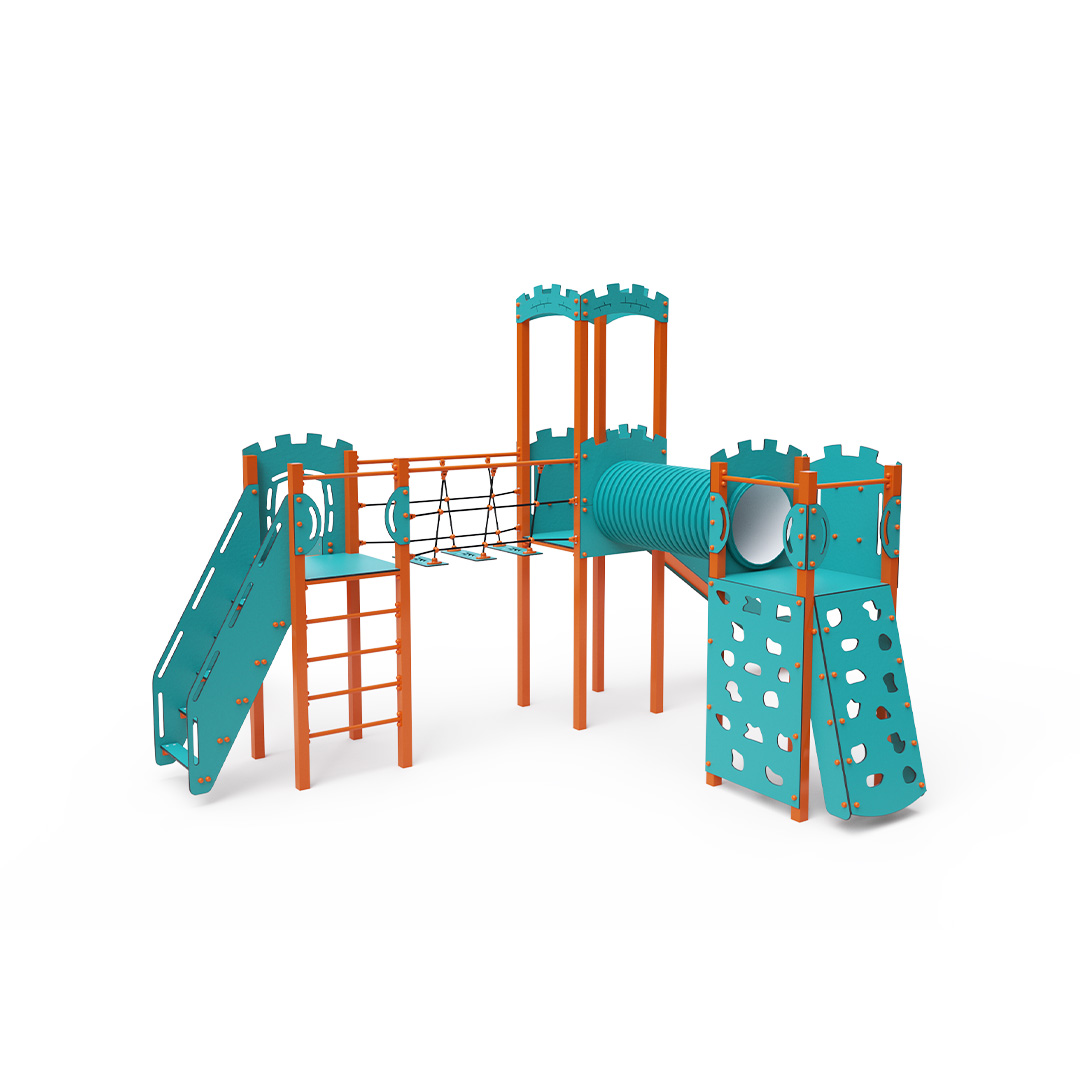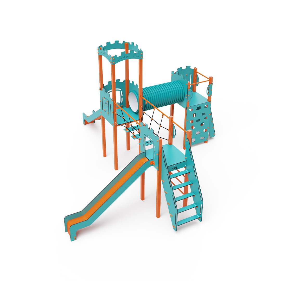 Ein kombiniertes Dreiturmset in L-Form. Die beiden Türme sind durch eine Seilbrücke und einen Tunnel mit dem mittleren Turm verbunden. Kinder können über Stufen, eine schräge Kletterwand mit Griffen oder eine Leiter klettern und eine der beiden Rutschen hinuntersausen. Das türkis-orange Design zieht schon von Weitem die Blicke auf sich. Die Stahlkonstruktion ist dank Feuerverzinkung und strapazierfähiger Pulverbeschichtung witterungsbeständig. Das verwendete HPL-Material ist chemikalienbeständig, UV-beständig, farbecht, ungiftig, recycelbar und bruchfest. Es besteht keine Verletzungsgefahr durch scharfe Kanten oder Splitter. Die Seile bestehen aus Polyesterfasern, die um die zentrale Verstärkung gewickelt sind. Diese Konstruktion erhöht die Festigkeit und Widerstandsfähigkeit der Seile gegen mechanische Belastung. Das Polyester selbst ist resistent gegen Mikroorganismen und Witterungseinflüsse, trocknet schnell nach Regen, ist farbecht und zeichnet sich durch hohe Festigkeit aus. Alle Verbindungen sind aus Edelstahl und mit Kunststoffkappen versehen, um Langlebigkeit und Sicherheit zu erhöhen.