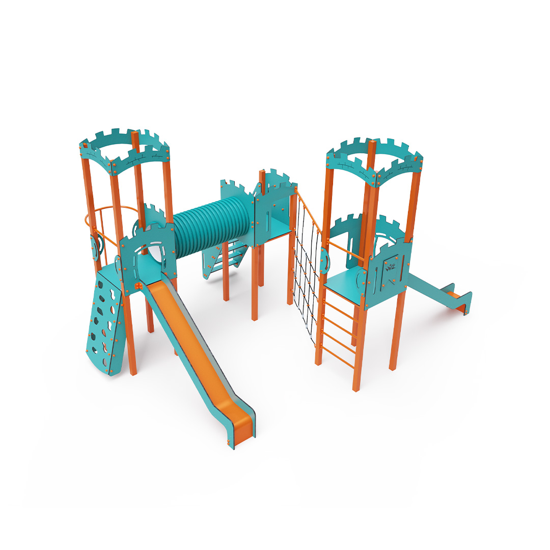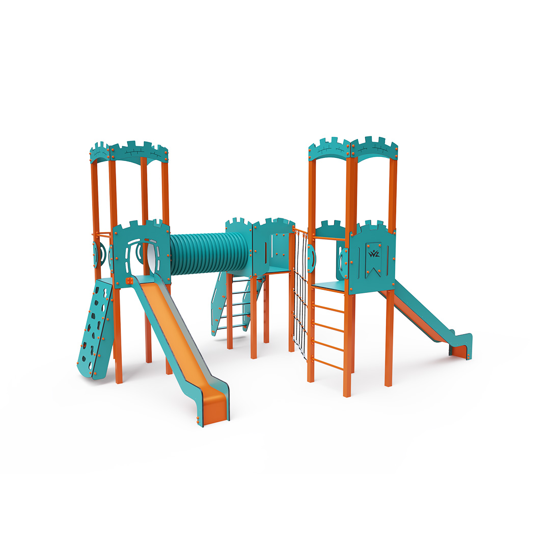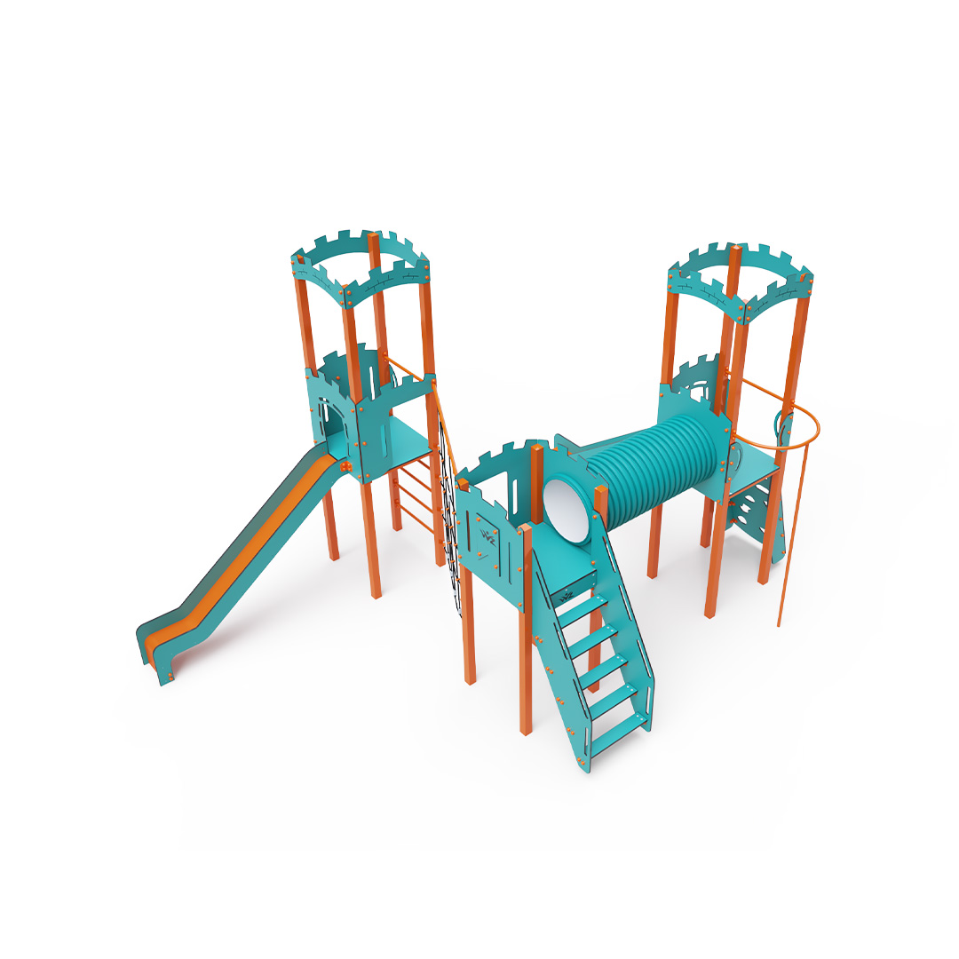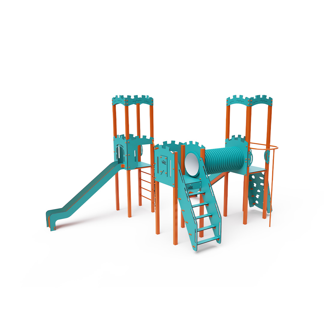 Dieses dreitürmige Kombinationsset in L-Form besteht aus zwei Türmen mit Wänden, die durch eine diagonale Seilwand und einen Tunnel mit dem mittleren Turm verbunden sind. Kinder können die Anlage über Stufen, eine geneigte Kletterwand mit Griffen, eine Kletterstange oder eine Leiter erklimmen und anschließend eine der beiden Rutschen oder eine Kletterstange hinuntersausen. Das türkis-orange Design lockt Kinder schon von Weitem zum Spielen an. Die Stahlkonstruktion ist dank Feuerverzinkung und strapazierfähiger Pulverbeschichtung witterungsbeständig. Das verwendete HPL-Material ist chemikalienbeständig, UV-beständig, farbecht, ungiftig, recycelbar und bruchfest. Es besteht keine Verletzungsgefahr durch scharfe Kanten oder Splitter. Die Seile bestehen aus Polyesterfasern, die um eine zentrale Verstärkung gewickelt sind. Diese Konstruktion erhöht die Festigkeit und Widerstandsfähigkeit der Seile gegen mechanische Belastung. Das Polyester selbst ist resistent gegen Mikroorganismen und Witterungseinflüsse, trocknet nach Regen schnell, ist farbecht und zeichnet sich durch hohe Festigkeit aus. Alle Verbindungen sind aus Edelstahl und mit Kunststoffkappen versehen, um Langlebigkeit und Sicherheit zu erhöhen.