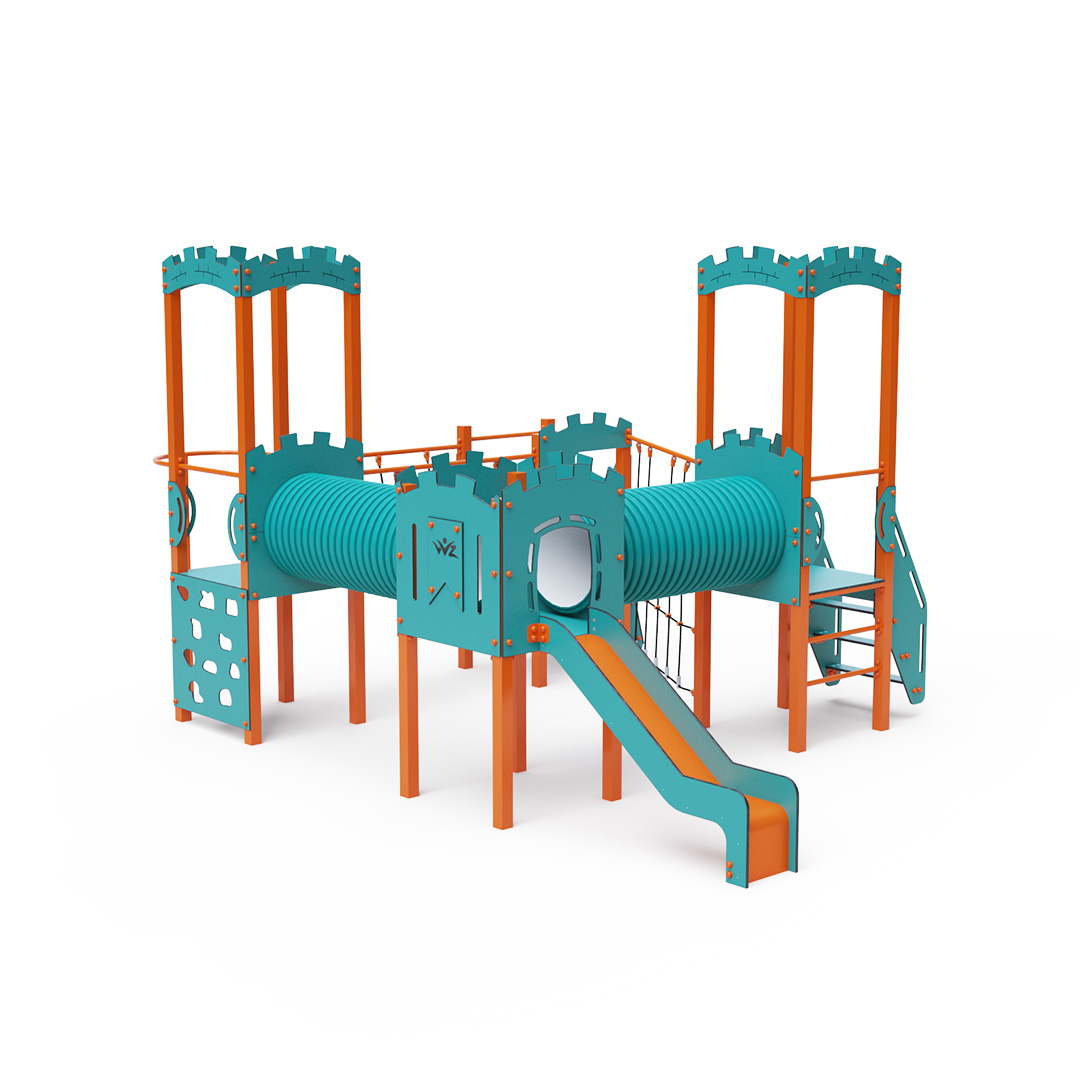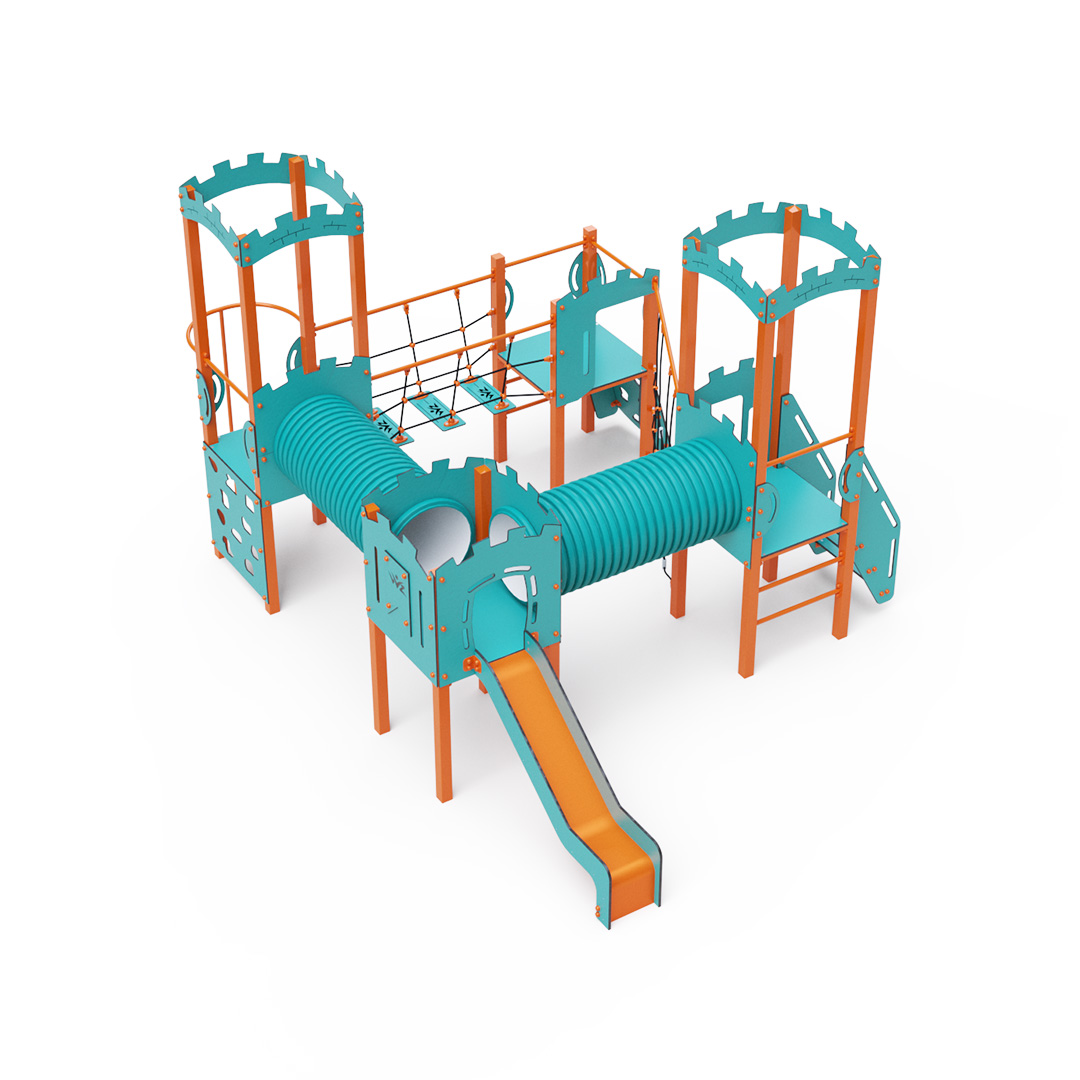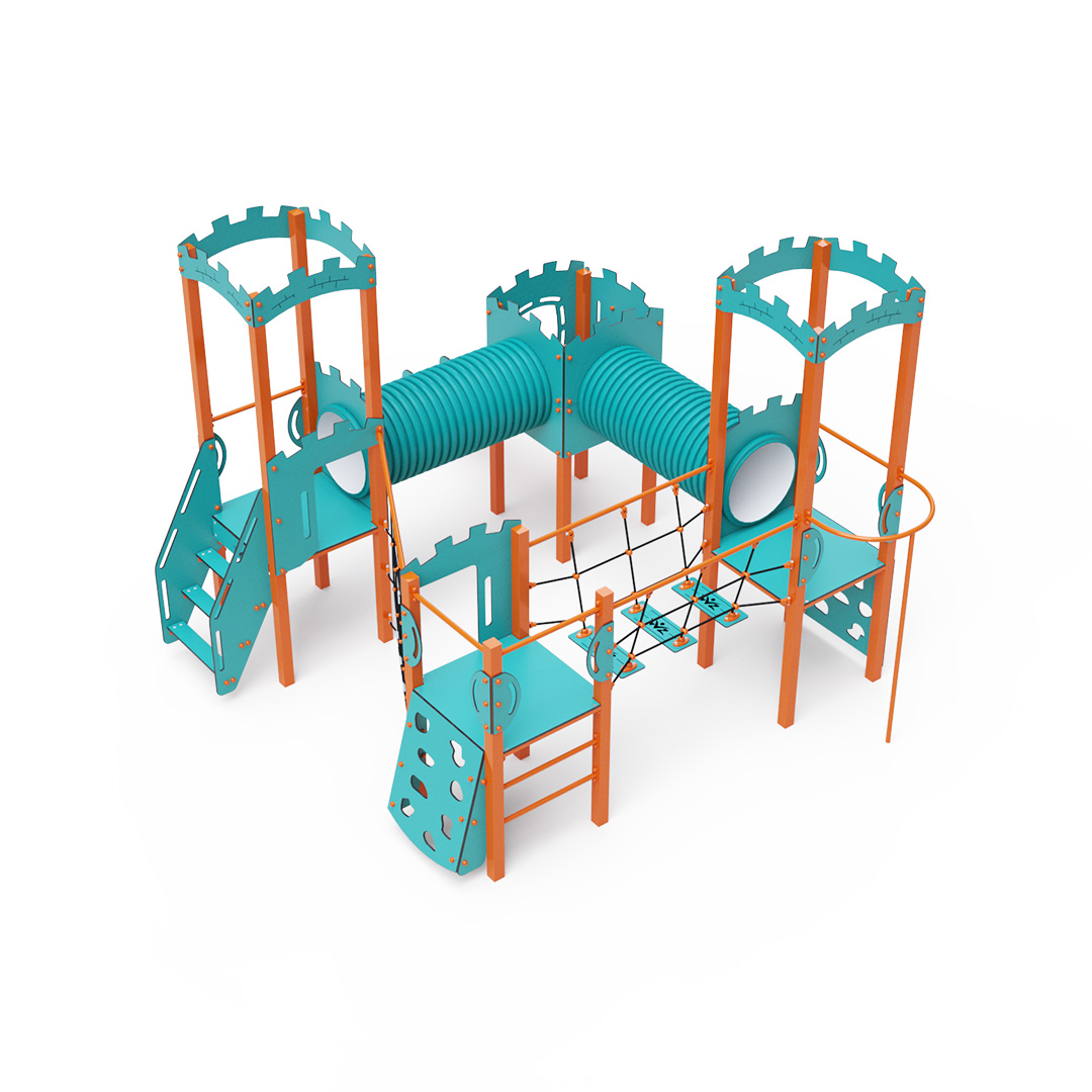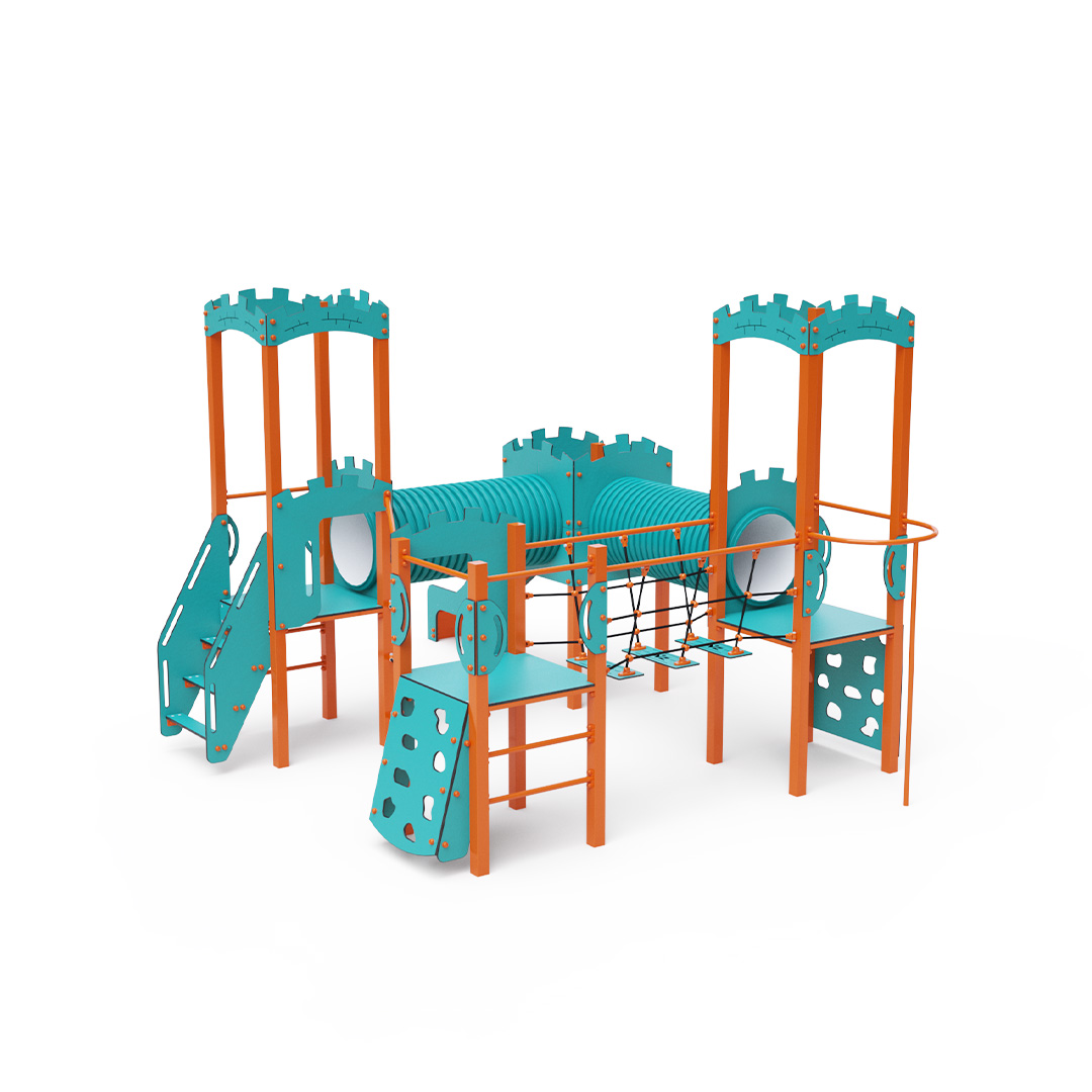 Kombiniertes Turmset mit vier Türmen. Zwei Türme mit Wänden und zwei niedrige Türme sind durch eine diagonale Seilwand, eine Seilbrücke und zwei Tunnel verbunden. Das Set beinhaltet Stufen, eine schräge Kletterwand, eine Kletterstange, ein schräges Seilnetz, Leitern und zwei Rutschen. Das türkis-orange Design lockt Kinder schon von Weitem zum Spielen an. Die Stahlkonstruktion ist dank Feuerverzinkung und strapazierfähiger Pulverbeschichtung witterungsbeständig. Das verwendete HPL-Material ist chemikalienbeständig, UV-beständig, farbecht, ungiftig, recycelbar und bruchfest. Es besteht keine Verletzungsgefahr durch scharfe Kanten oder Splitter. Die Seile bestehen aus Polyesterfasern, die um die zentrale Verstärkung gewickelt sind. Diese Konstruktion erhöht die Festigkeit und Widerstandsfähigkeit der Seile gegen mechanische Belastung. Das Polyester selbst ist resistent gegen Mikroorganismen und Witterungseinflüsse, trocknet schnell nach Regen, ist farbecht und zeichnet sich durch hohe Festigkeit aus. Alle Verbindungen sind aus Edelstahl und mit Kunststoffkappen versehen, um Haltbarkeit und Sicherheit zu erhöhen.