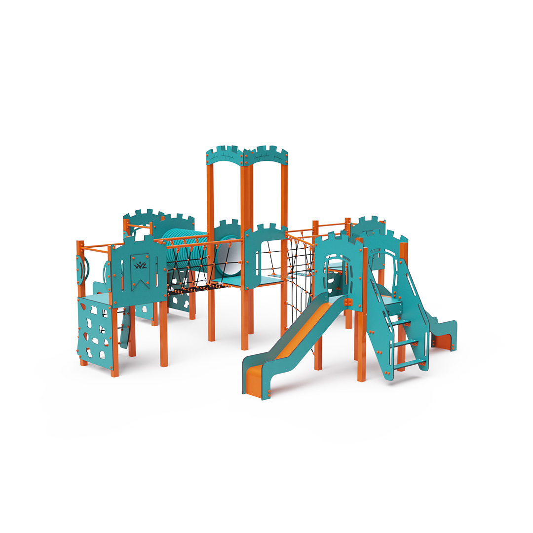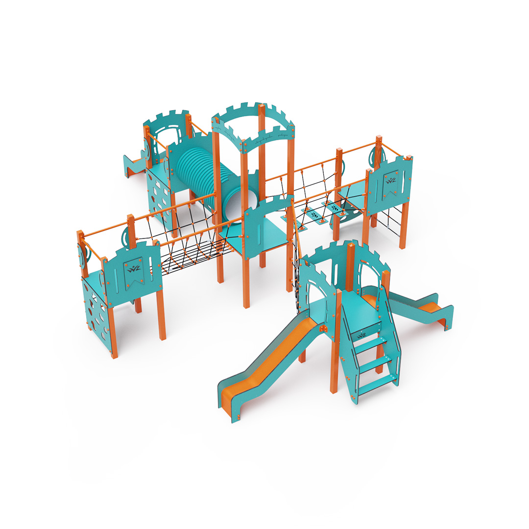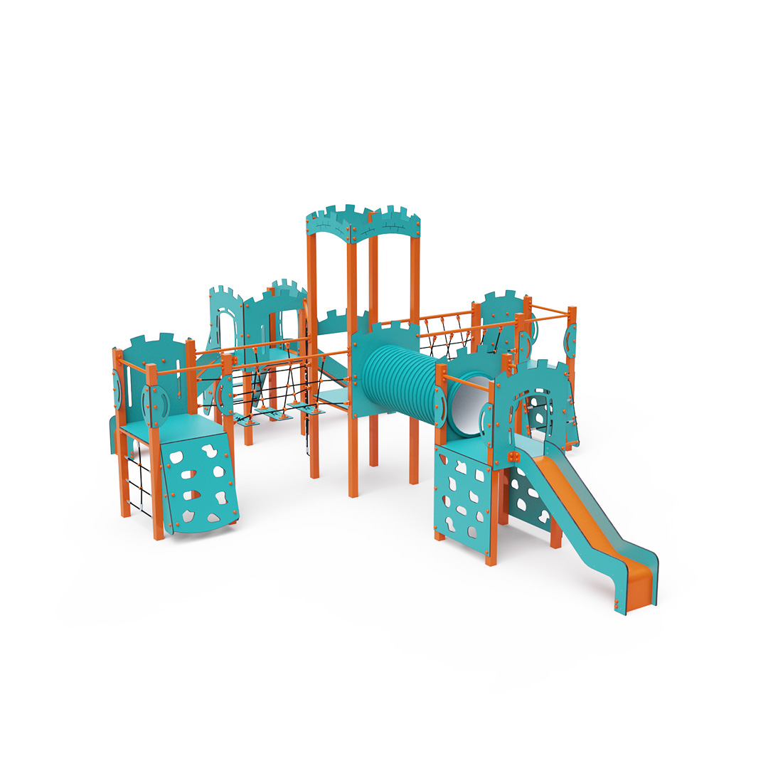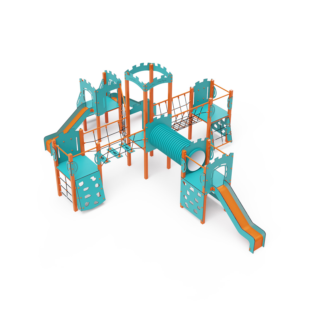 Kombiniertes Turmset mit fünf Türmen. Der zentrale Turm mit Mauern und vier niedrigere Türme sind durch eine Seilbrücke, eine Seilbalancierbrücke, eine diagonale Seilwand und einen Tunnel miteinander verbunden. Das Set beinhaltet Stufen, eine schräge Kletterwand, eine senkrechte Kletterwand, ein schräges Seilnetz, ein senkrechtes Seilnetz und drei Rutschen. Das türkis-orange Design lockt Kinder schon von Weitem zum Spielen an. Die Stahlkonstruktion ist dank Feuerverzinkung und widerstandsfähiger Pulverbeschichtung witterungsbeständig. Das verwendete HPL-Material ist chemikalienbeständig, UV-beständig, farbecht, ungiftig, recycelbar und bruchfest. Es besteht keine Verletzungsgefahr durch scharfe Kanten oder Splitter. Die Seile bestehen aus Polyesterfasern, die um eine zentrale Verstärkung gewickelt sind. Diese Konstruktion erhöht die Festigkeit und Widerstandsfähigkeit der Seile gegen mechanische Belastung. Das Polyester selbst ist resistent gegen Mikroorganismen und Witterungseinflüsse, trocknet nach Regen schnell, ist farbecht und zeichnet sich durch hohe Festigkeit aus. Alle Verbindungen sind aus Edelstahl und mit Kunststoffkappen versehen, um Haltbarkeit und Sicherheit zu erhöhen.