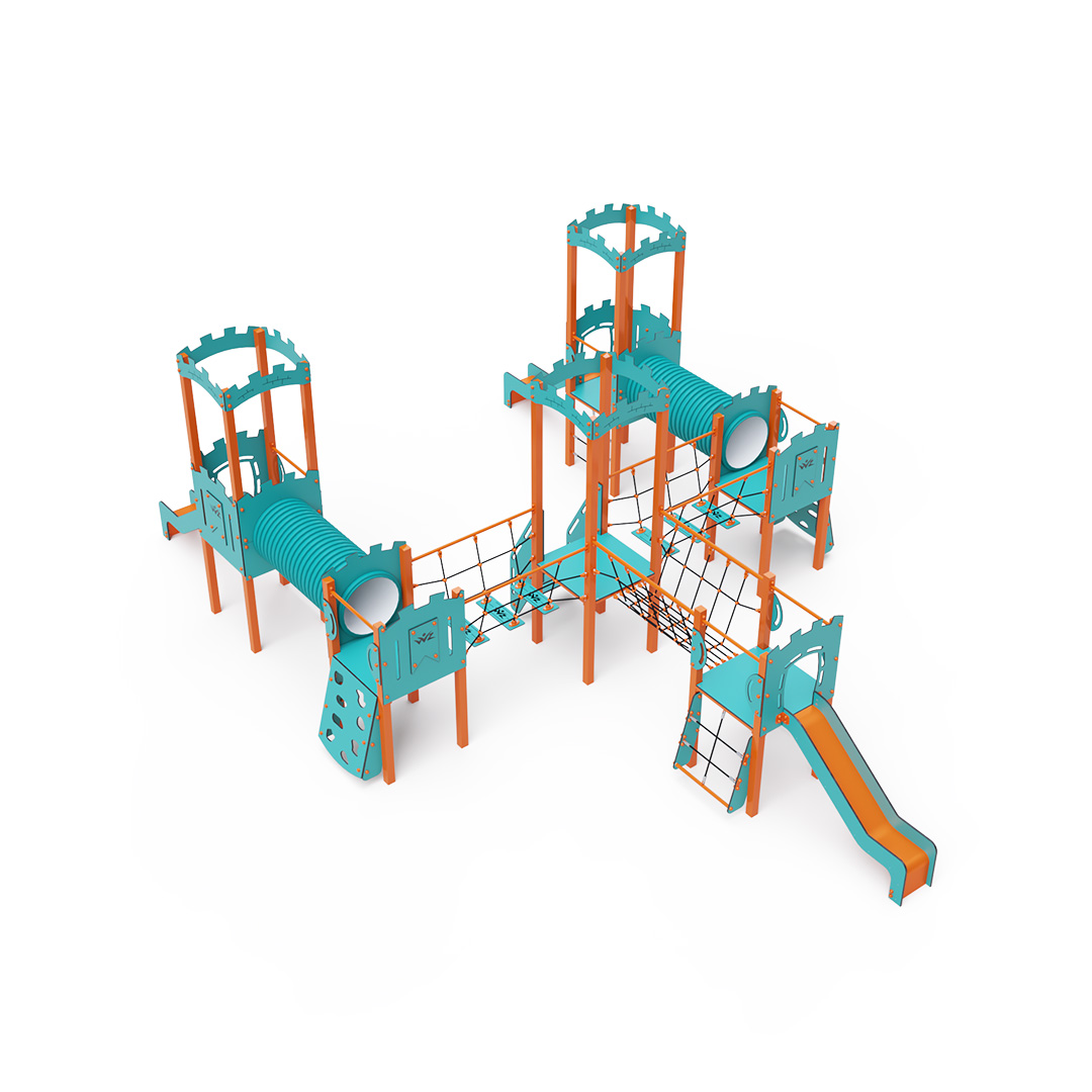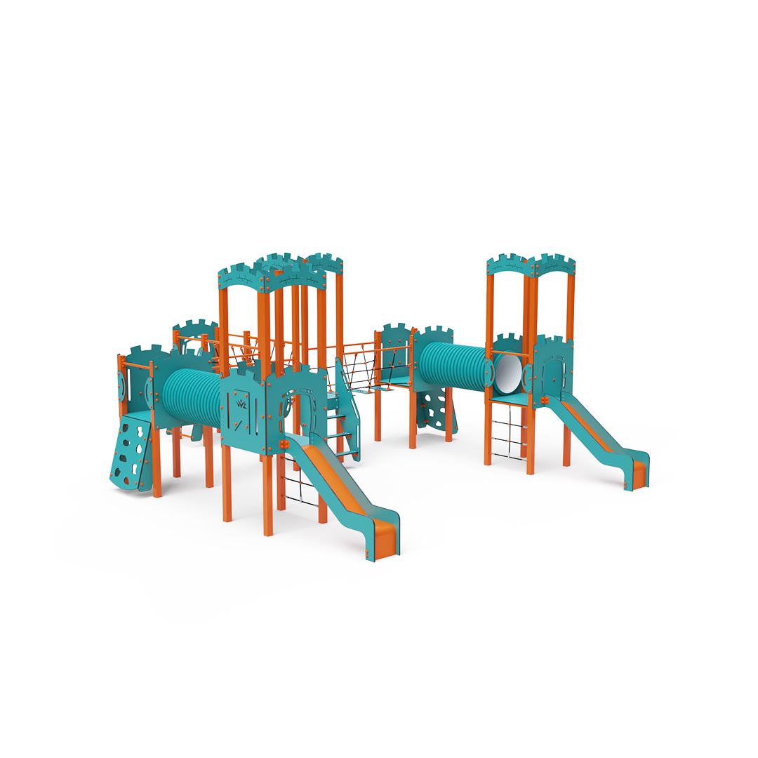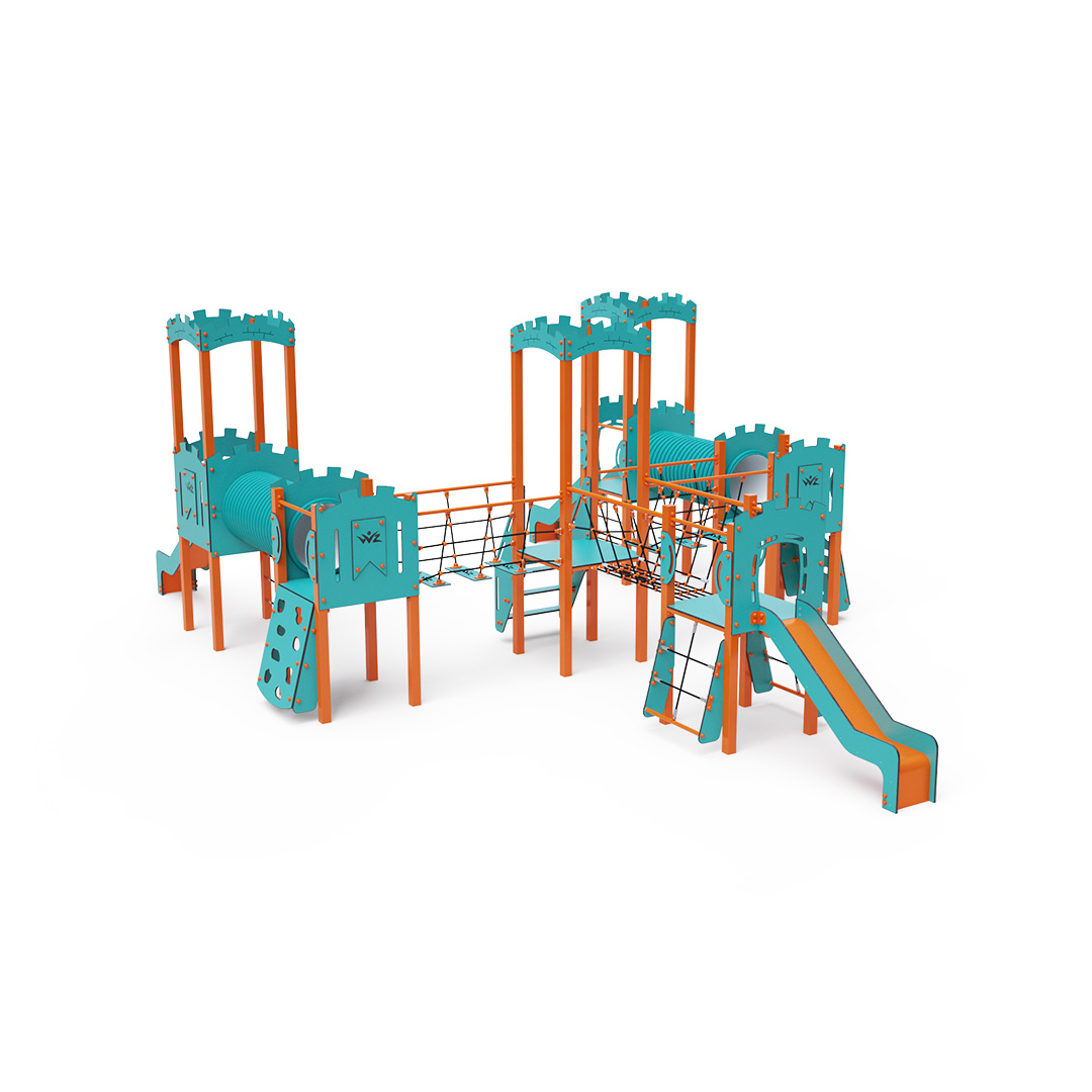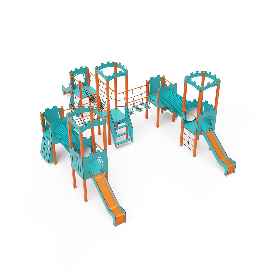 Sechstürmiges Kombi-Turmset. Drei Türme mit Wänden und drei niedrige Türme sind durch eine Seilbrücke, Seilbalancierbrücken und einen Tunnel verbunden. Das Set beinhaltet Treppen, schräge Kletterwände, schräge und senkrechte Seilnetze sowie drei Rutschen. Das türkis-orange Design lockt Kinder schon von Weitem zum Spielen an. Die Stahlkonstruktion ist dank Feuerverzinkung und strapazierfähiger Pulverbeschichtung witterungsbeständig. Das verwendete HPL-Material ist chemikalienbeständig, UV-beständig, farbecht, ungiftig, recycelbar und bruchfest. Es besteht keine Verletzungsgefahr durch scharfe Kanten oder Splitter. Die Seile bestehen aus Polyesterfasern, die um die zentrale Verstärkung gewickelt sind. Diese Konstruktion erhöht die Festigkeit und Widerstandsfähigkeit der Seile gegen mechanische Belastung. Das Polyester selbst ist resistent gegen Mikroorganismen und Witterungseinflüsse, trocknet schnell nach Regen, ist farbecht und zeichnet sich durch hohe Festigkeit aus. Alle Verbindungen sind aus Edelstahl und mit Kunststoffkappen versehen, um Haltbarkeit und Sicherheit zu erhöhen.