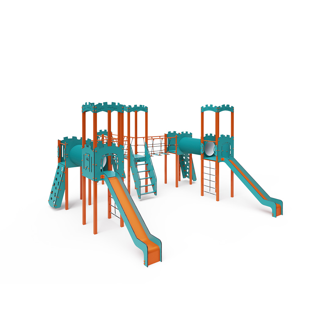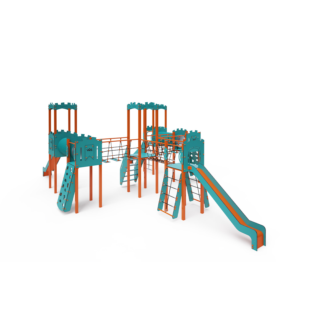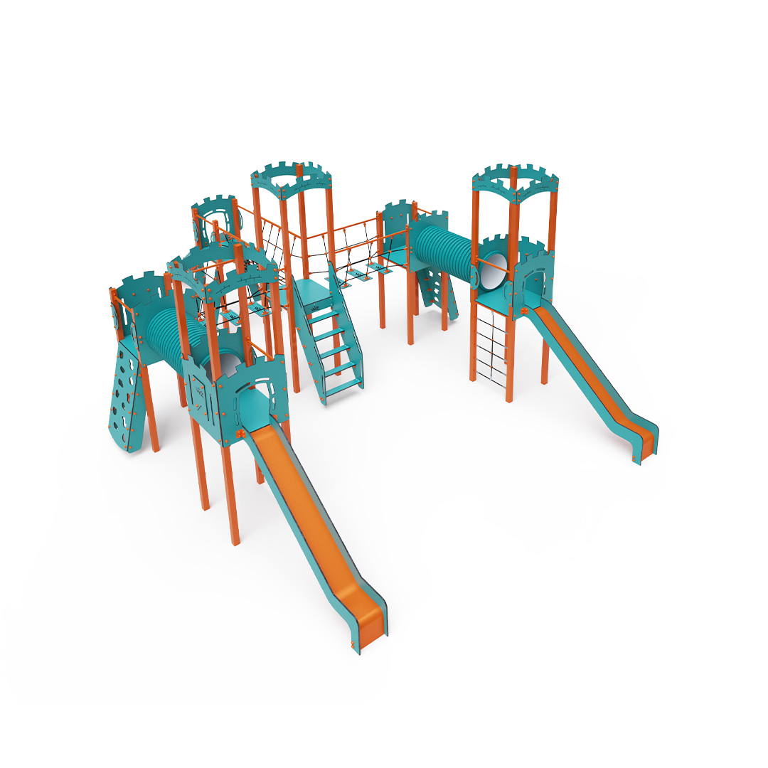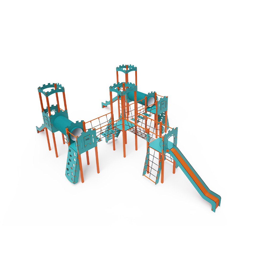 Sechstürmiges Kombi-Turmset. Drei Türme mit Wänden und drei niedrige Türme sind durch eine Seilbrücke, Seilbalancierbrücken und einen Tunnel verbunden. Das Set beinhaltet Treppen, schräge Kletterwände, schräge und senkrechte Seilnetze sowie drei Rutschen. Das türkis-orange Design lockt Kinder schon von Weitem zum Spielen an. Die Stahlkonstruktion ist dank Feuerverzinkung und robuster Pulverbeschichtung witterungsbeständig. Das verwendete HPL-Material ist chemikalienbeständig, UV-beständig, farbecht, ungiftig, recycelbar und bruchfest. Es besteht keine Verletzungsgefahr durch scharfe Kanten oder Splitter. Die Seile bestehen aus Polyesterfasern, die um die zentrale Verstärkung gewickelt sind. Diese Konstruktion erhöht die Festigkeit und Widerstandsfähigkeit der Seile gegen mechanische Belastung. Das Polyester selbst ist resistent gegen Mikroorganismen und Witterungseinflüsse, trocknet schnell nach Regen, ist farbecht und zeichnet sich durch hohe Festigkeit aus. Alle Verbindungen sind aus Edelstahl und mit Kunststoffkappen versehen, um Langlebigkeit und Sicherheit zu erhöhen.