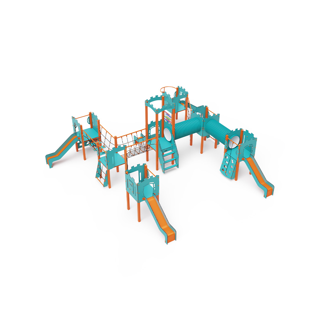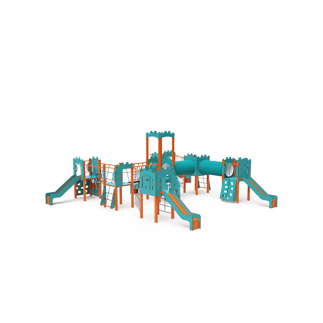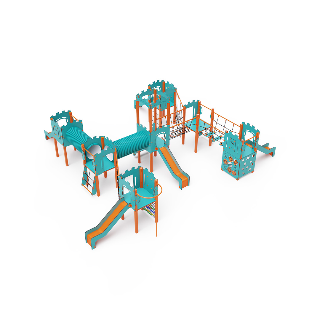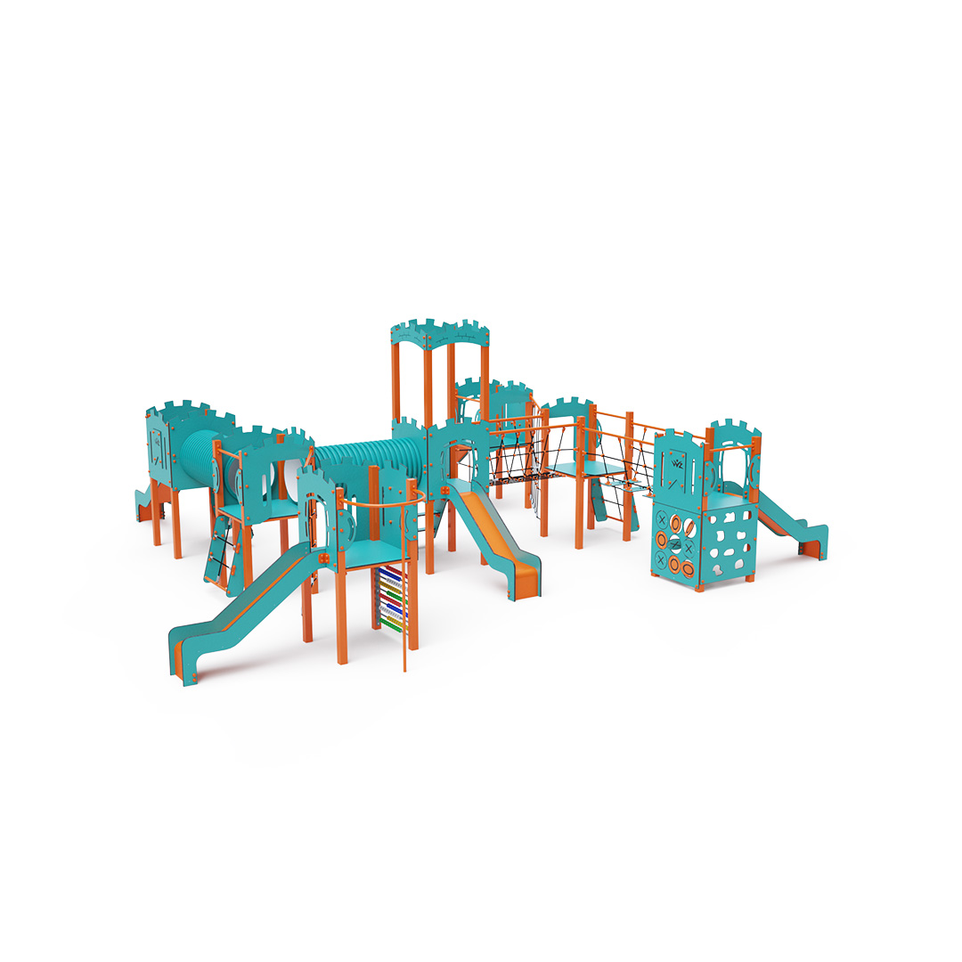Kombiniertes Turmset mit sieben Türmen. Der Hauptturm mit Mauern und sechs niedrigere Türme sind durch eine Seilbrücke, eine Seilbalancierbrücke, eine diagonale Seilwand und Tunnel miteinander verbunden. Das Set beinhaltet Treppen, eine schräge Kletterwand mit Seil, eine senkrechte Kletterwand, schräge Seilnetze, einen Zähler, ein Tic-Tac-Toe-Spiel und fünf Rutschen. Das türkis-orange Design lockt Kinder schon von Weitem zum Spielen an. Die Stahlkonstruktion ist dank Feuerverzinkung und widerstandsfähiger Pulverbeschichtung witterungsbeständig. Das verwendete HPL-Material ist chemikalienbeständig, UV-beständig, farbecht, ungiftig, recycelbar und bruchfest. Es besteht keine Verletzungsgefahr durch scharfe Kanten oder Splitter. Die Seile bestehen aus Polyesterfasern, die um eine zentrale Verstärkung gewickelt sind. Diese Konstruktion erhöht die Festigkeit und Widerstandsfähigkeit der Seile gegen mechanische Belastung. Das Polyester selbst ist resistent gegen Mikroorganismen und Witterungseinflüsse, trocknet nach Regen schnell, ist farbecht und zeichnet sich durch hohe Festigkeit aus. Alle Verbindungen sind aus Edelstahl und mit Kunststoffkappen versehen, um Haltbarkeit und Sicherheit zu erhöhen.