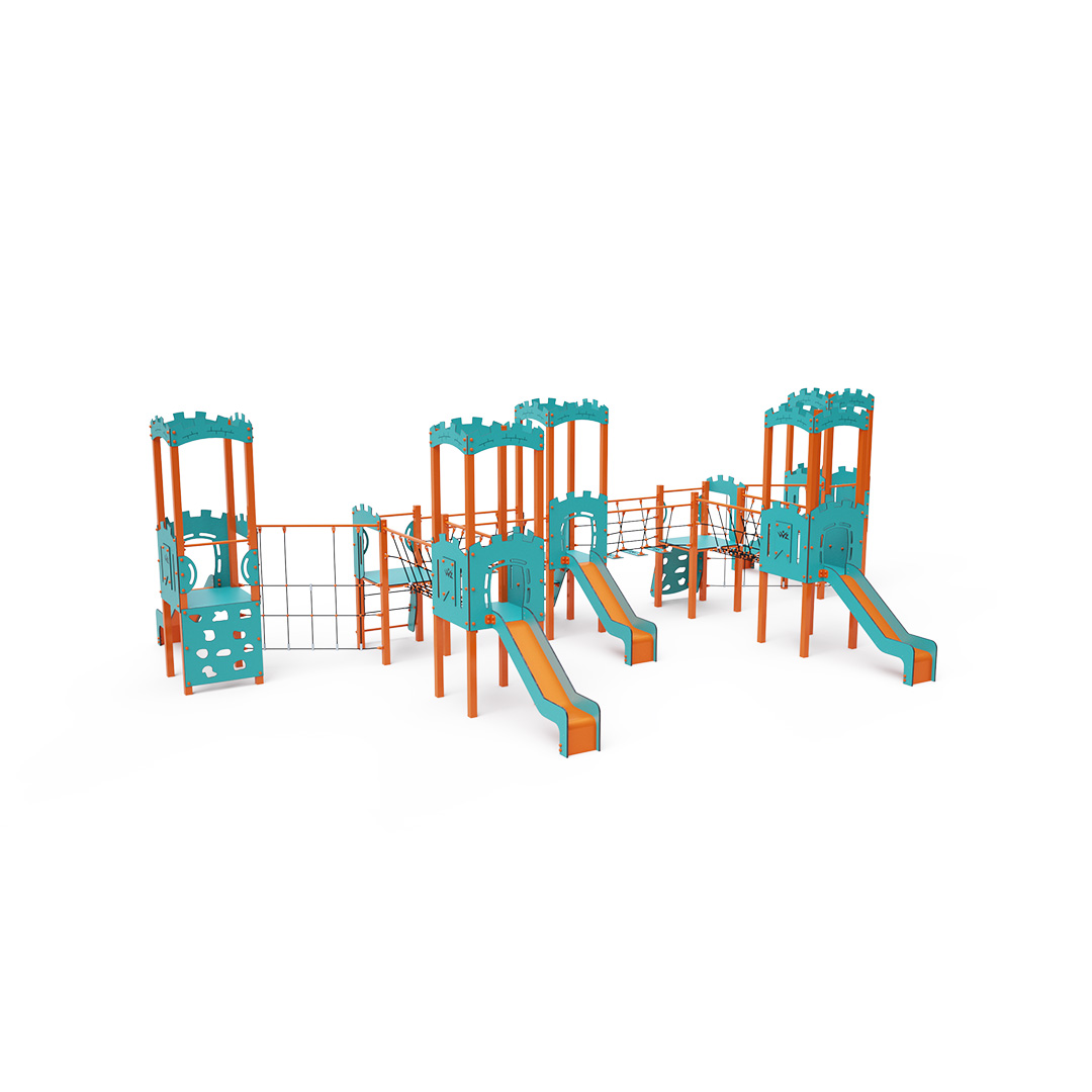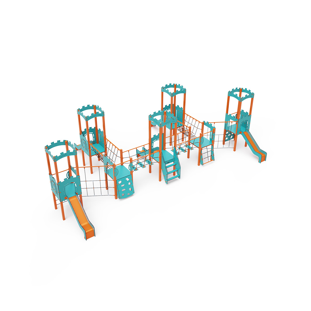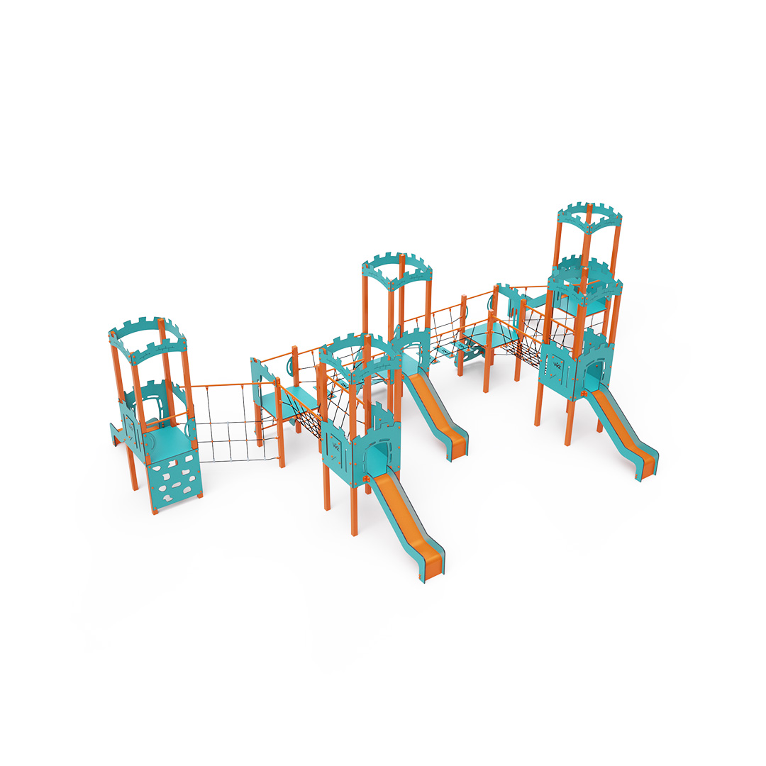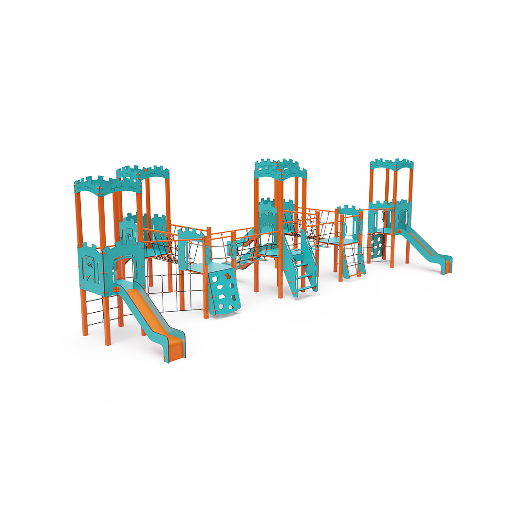 Kombiniertes Turmset mit sieben Türmen. Vier Türme mit Mauern und drei niedrige Türme sind durch eine Seilbrücke, eine Seilbalancierbrücke und eine diagonale Seilwand miteinander verbunden. Das Set beinhaltet Stufen, eine schräge Kletterwand, eine schräge Kletterwand mit Seil, eine vertikale Kletterwand, ein schräges Seilnetz, ein vertikales Seilnetz und fünf Rutschen. Das türkis-orange Design lockt Kinder schon von Weitem zum Spielen an. Die Stahlkonstruktion ist dank Feuerverzinkung und widerstandsfähiger Pulverbeschichtung witterungsbeständig. Das verwendete HPL-Material ist chemikalienbeständig, UV-beständig, farbecht, ungiftig, recycelbar und bruchfest. Es besteht keine Verletzungsgefahr durch scharfe Kanten oder Splitter. Die Seile bestehen aus Polyesterfasern, die um eine zentrale Verstärkung gewickelt sind. Diese Konstruktion erhöht die Festigkeit und Widerstandsfähigkeit der Seile gegen mechanische Belastung. Das Polyester selbst ist resistent gegen Mikroorganismen und Witterungseinflüsse, trocknet nach Regen schnell, ist farbecht und zeichnet sich durch hohe Festigkeit aus. Alle Verbindungen sind aus Edelstahl und mit Kunststoffkappen versehen, um Haltbarkeit und Sicherheit zu erhöhen.