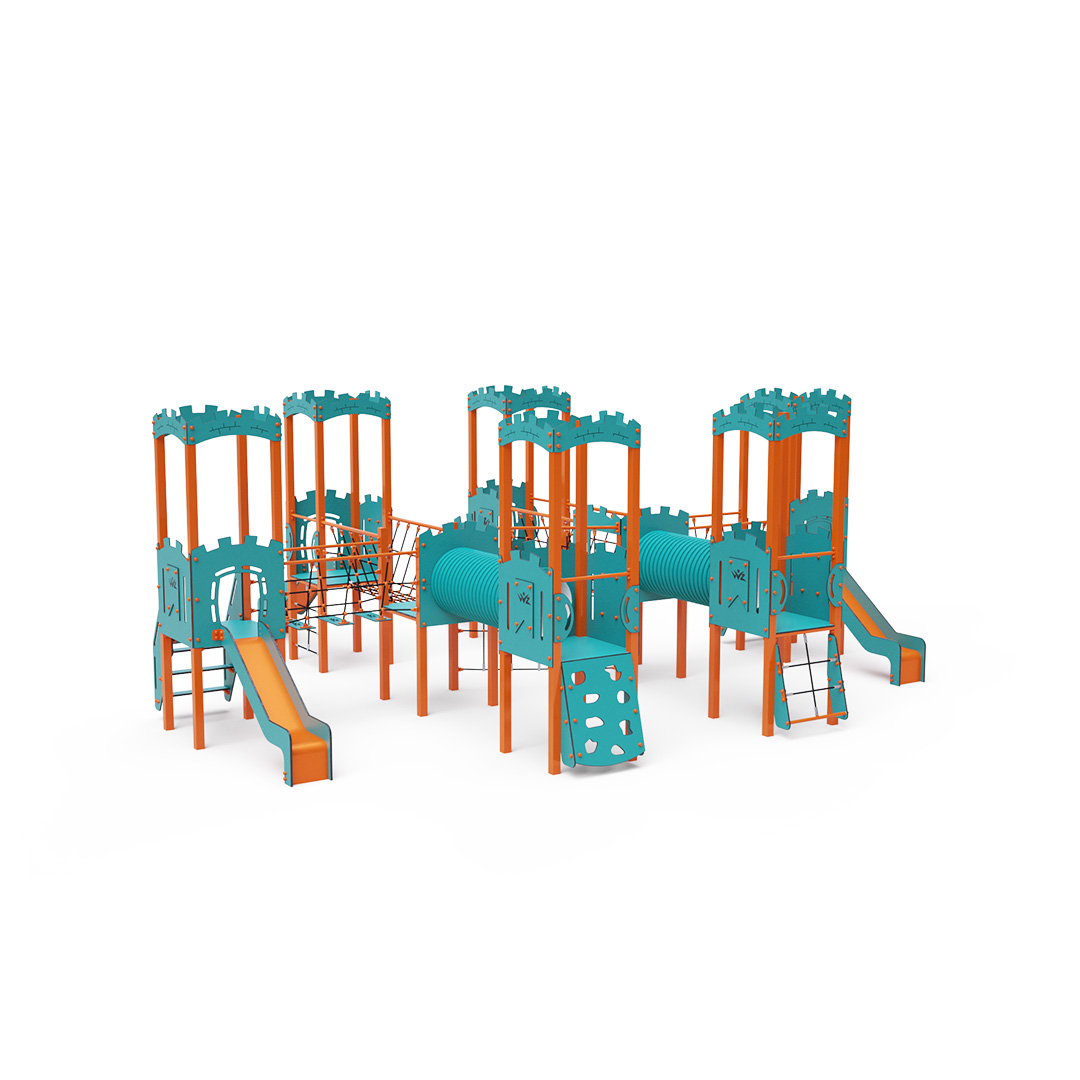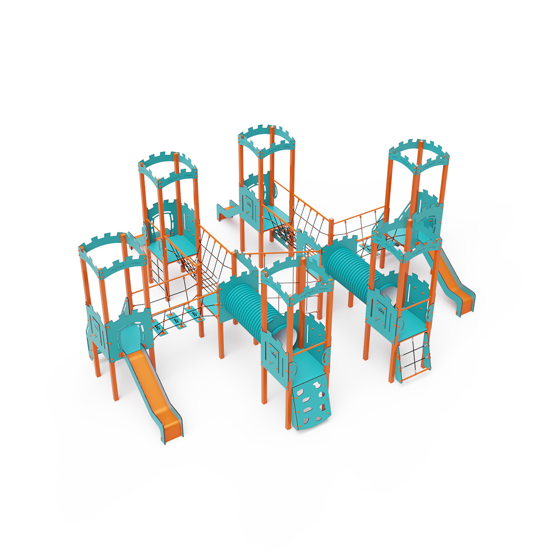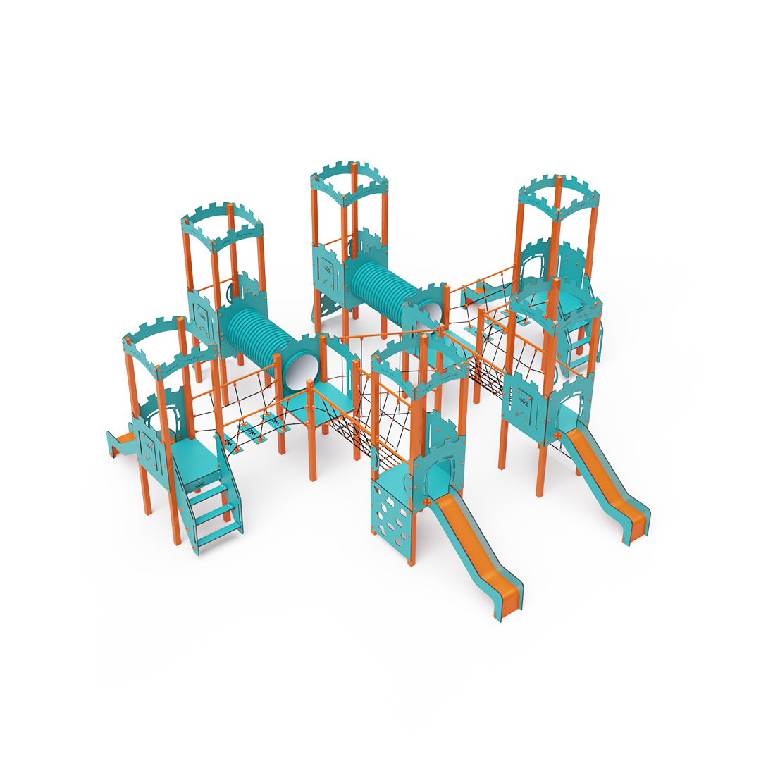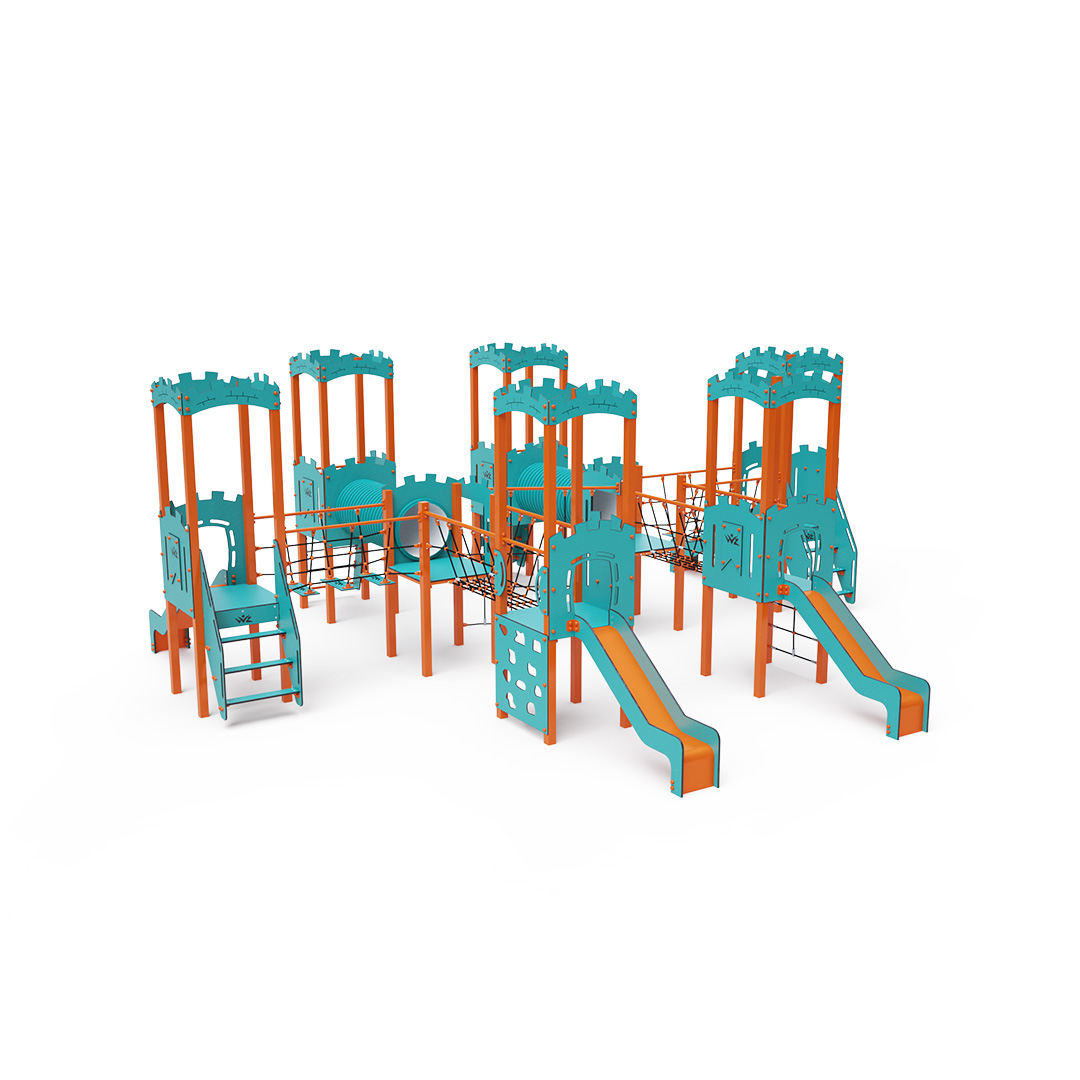 Acht-Turm-Kombinationsset. Sechs Türme mit Mauern und zwei niedrige Türme sind durch Seilbrücken, Seilbalancierbrücken, Tunnel und eine diagonale Seilwand miteinander verbunden. Das Set beinhaltet Treppen, eine schräge Kletterwand, eine vertikale Kletterwand, ein schräges Seilnetz, ein vertikales Seilnetz und vier Rutschen. Das türkis-orange Design lockt Kinder schon von Weitem zum Spielen an. Die Stahlkonstruktion ist dank Feuerverzinkung und strapazierfähiger Pulverbeschichtung witterungsbeständig. Das verwendete HPL-Material ist chemikalienbeständig, UV-beständig, farbecht, ungiftig, recycelbar und bruchfest. Es besteht keine Verletzungsgefahr durch scharfe Kanten oder Splitter. Die Seile bestehen aus Polyesterfasern, die um eine zentrale Verstärkung gewickelt sind. Diese Konstruktion erhöht die Festigkeit und Widerstandsfähigkeit der Seile gegen mechanische Belastung. Das Polyester selbst ist resistent gegen Mikroorganismen und Witterungseinflüsse, trocknet nach Regen schnell, ist farbecht und zeichnet sich durch hohe Festigkeit aus. Alle Verbindungen sind aus Edelstahl und mit Kunststoffkappen versehen, um Haltbarkeit und Sicherheit zu erhöhen.