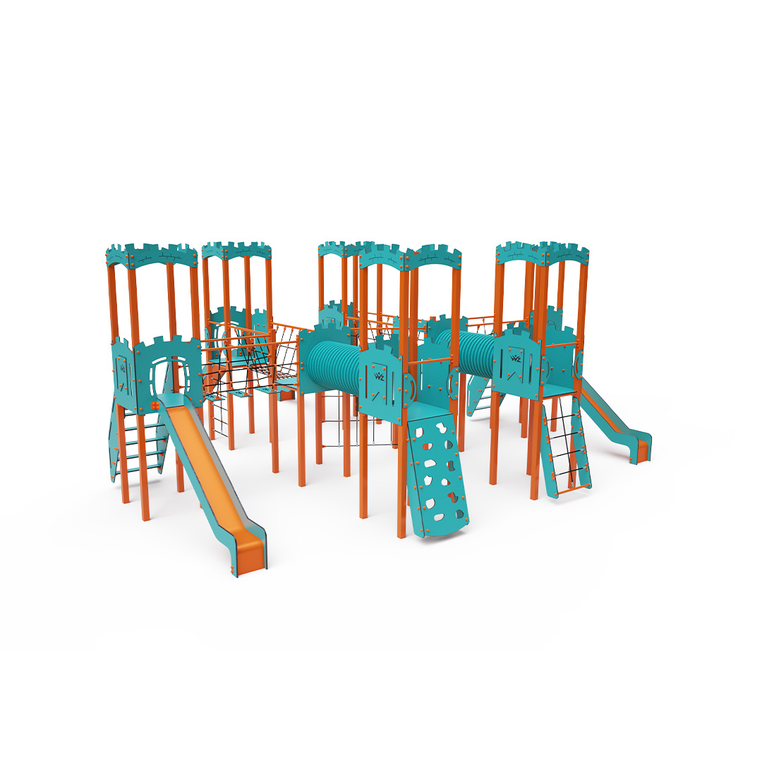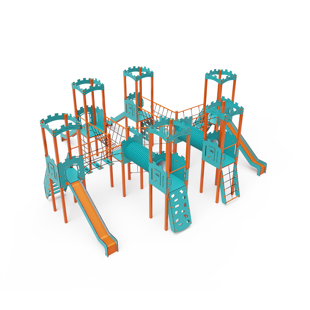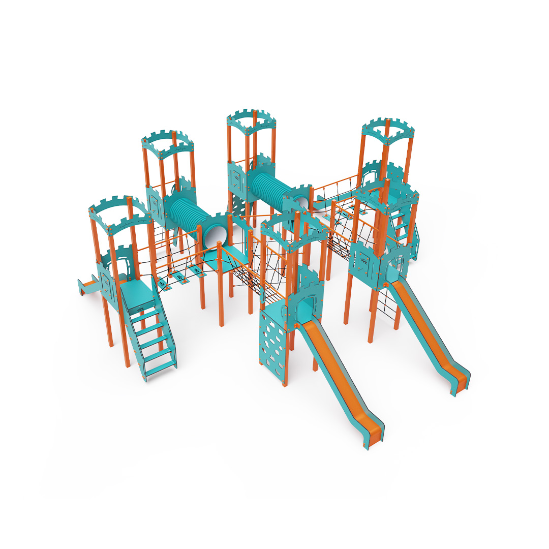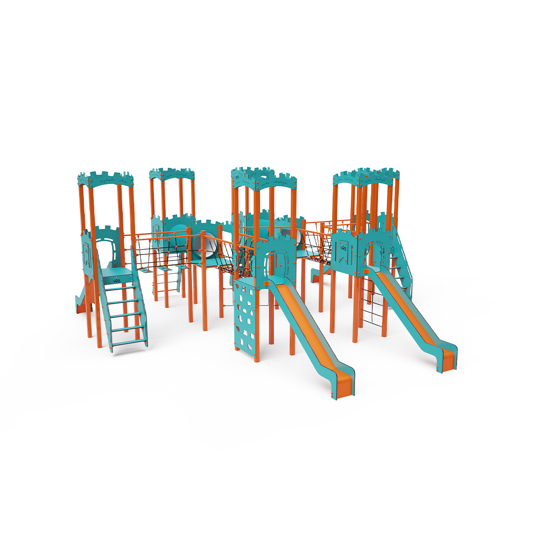 Acht-Turm-Kombinationsset. Sechs Türme mit Mauern und zwei niedrige Türme sind durch Seilbrücken, Seilbalancierbrücken, Tunnel und eine diagonale Seilwand miteinander verbunden. Das Set beinhaltet Treppen, eine schräge Kletterwand, eine senkrechte Kletterwand, ein schräges Seilnetz, ein senkrechtes Seilnetz und vier Rutschen. Das türkis-orange Design lockt Kinder schon von Weitem zum Spielen an. Die Stahlkonstruktion ist dank Feuerverzinkung und strapazierfähiger Pulverbeschichtung witterungsbeständig. Das verwendete HPL-Material ist chemikalienbeständig, UV-beständig, farbecht, ungiftig, recycelbar und bruchfest. Es besteht keine Verletzungsgefahr durch scharfe Kanten oder Splitter. Die Seile bestehen aus Polyesterfasern, die um eine zentrale Verstärkung gewickelt sind. Diese Konstruktion erhöht die Festigkeit und Widerstandsfähigkeit der Seile gegen mechanische Belastung. Das Polyester selbst ist resistent gegen Mikroorganismen und Witterungseinflüsse, trocknet nach Regen schnell, ist farbecht und zeichnet sich durch hohe Festigkeit aus. Alle Verbindungen sind aus Edelstahl und mit Kunststoffkappen versehen, um Langlebigkeit und Sicherheit zu erhöhen.
