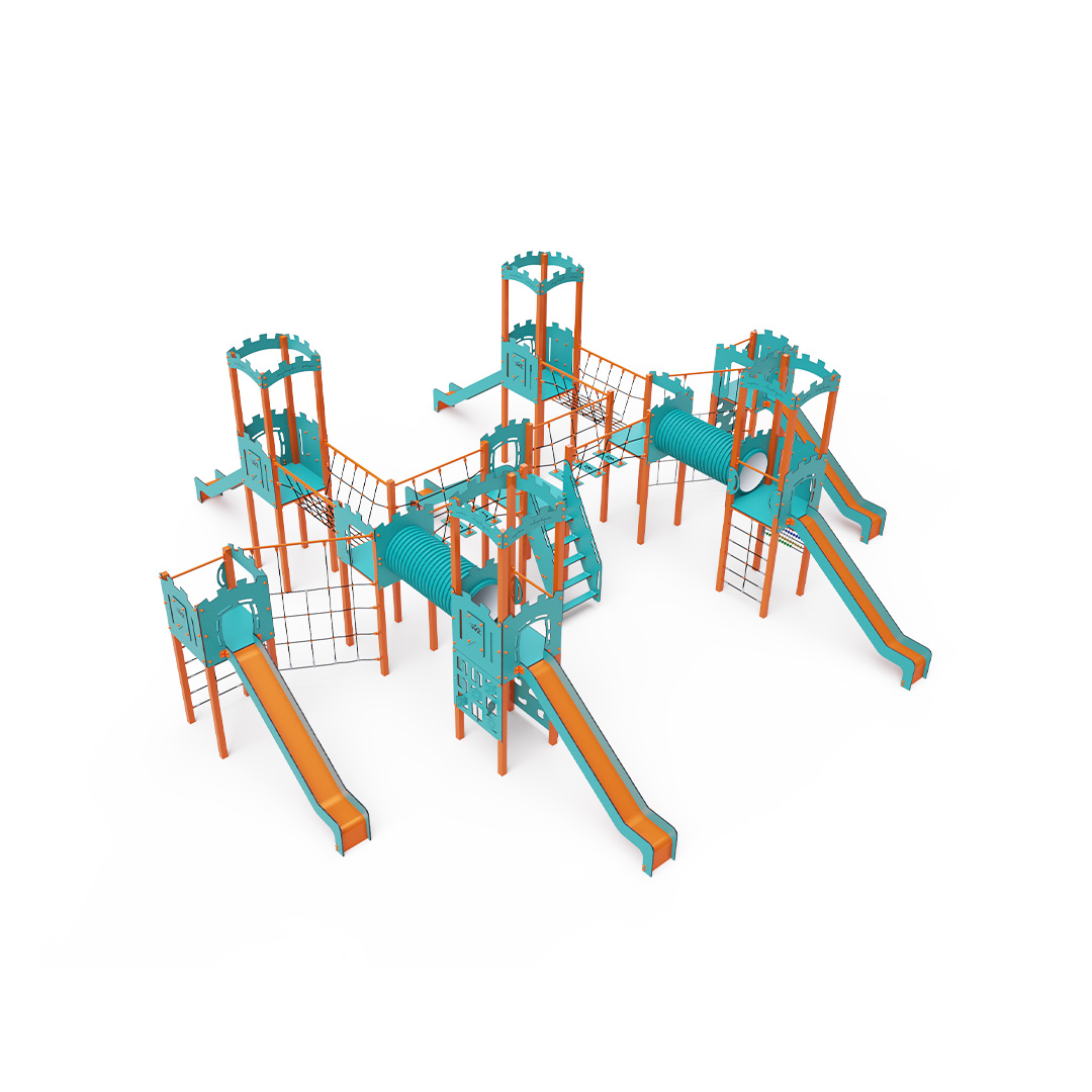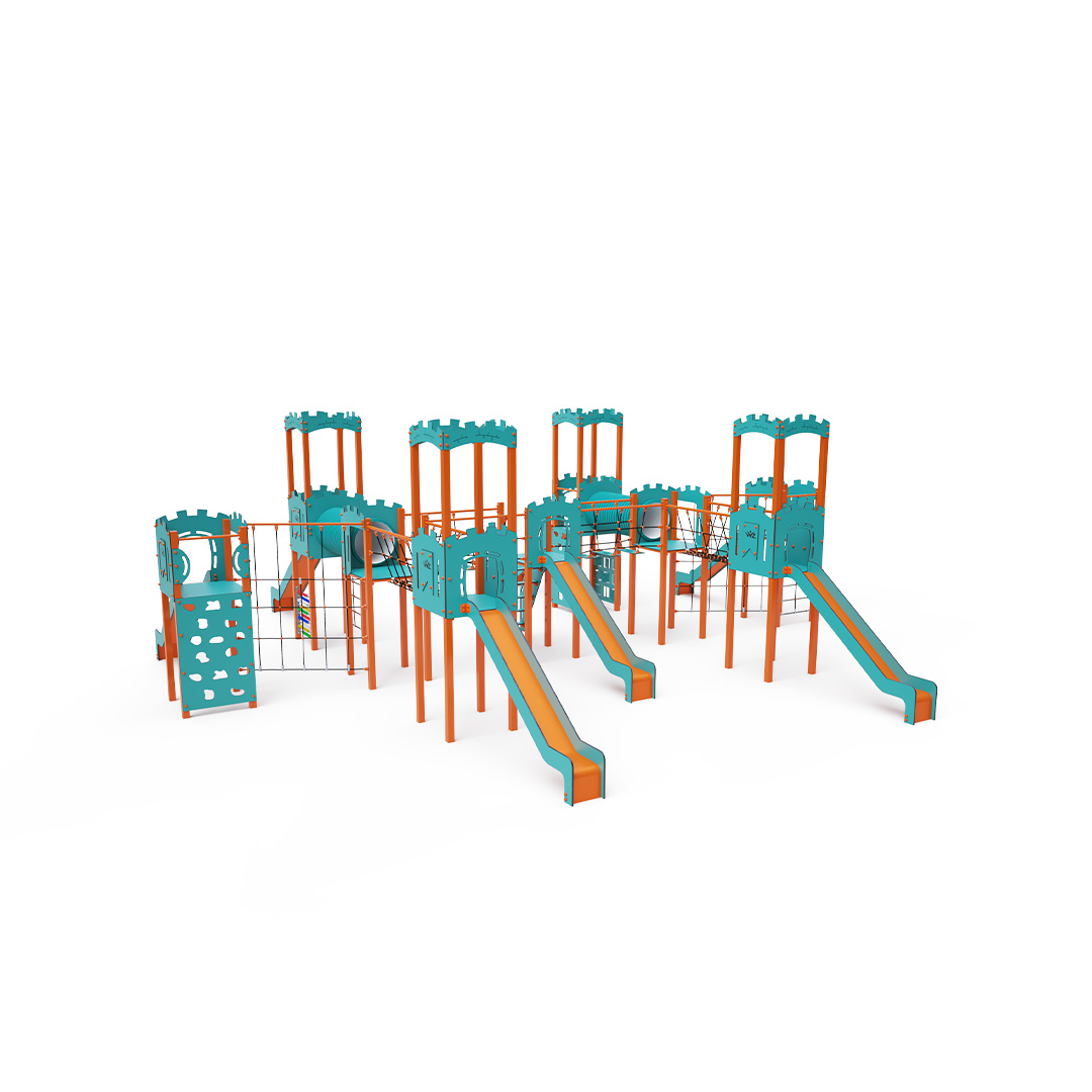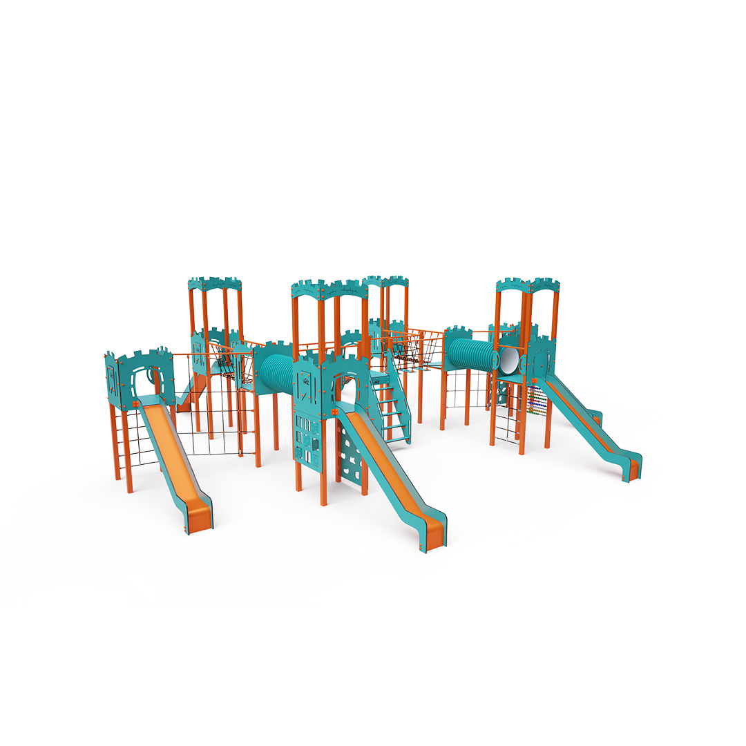 Ein kombiniertes Turmset mit neun Türmen. Vier Türme mit Mauern und fünf niedrige Türme sind durch Seilbrücken, Seilbalancierbrücken und diagonale Seilwände miteinander verbunden. Das Set beinhaltet Stufen, eine vertikale Kletterwand, ein vertikales Seilnetz, ein Tic-Tac-Toe-Spiel, einen Zähler und sieben Rutschen. Das türkis-orange Design lädt Kinder schon von Weitem zum Spielen ein. Die Stahlkonstruktion ist dank Feuerverzinkung und robuster Pulverbeschichtung witterungsbeständig. Das verwendete HPL-Material ist chemikalienbeständig, UV-beständig, farbecht, ungiftig, recycelbar und bruchfest. Es besteht keine Verletzungsgefahr durch scharfe Kanten oder Splitter. Die Seile bestehen aus Polyesterfasern, die um eine zentrale Verstärkung gewickelt sind. Diese Konstruktion erhöht die Festigkeit und Widerstandsfähigkeit der Seile gegen mechanische Belastung. Das Polyester selbst ist resistent gegen Mikroorganismen und Witterungseinflüsse, trocknet schnell nach Regen, ist farbecht und zeichnet sich durch hohe Festigkeit aus. Alle Verbindungen sind aus Edelstahl und mit Kunststoffkappen versehen, um Langlebigkeit und Sicherheit zu erhöhen.