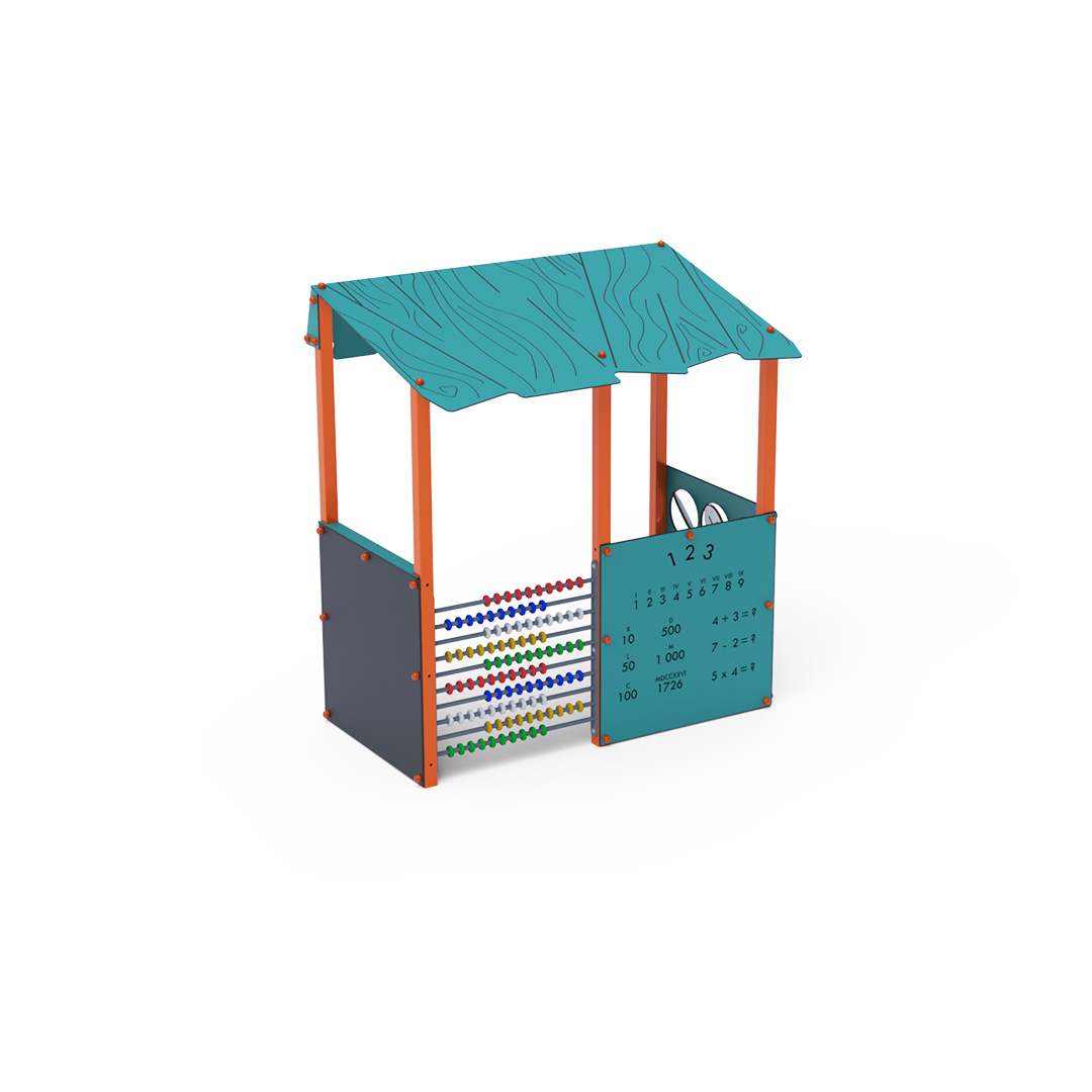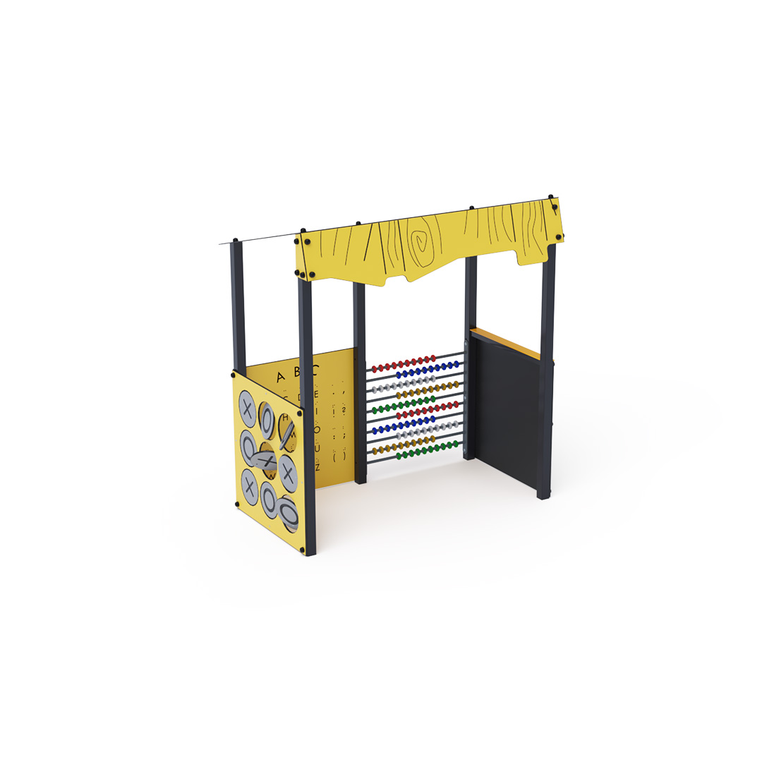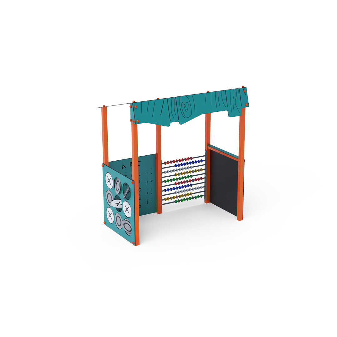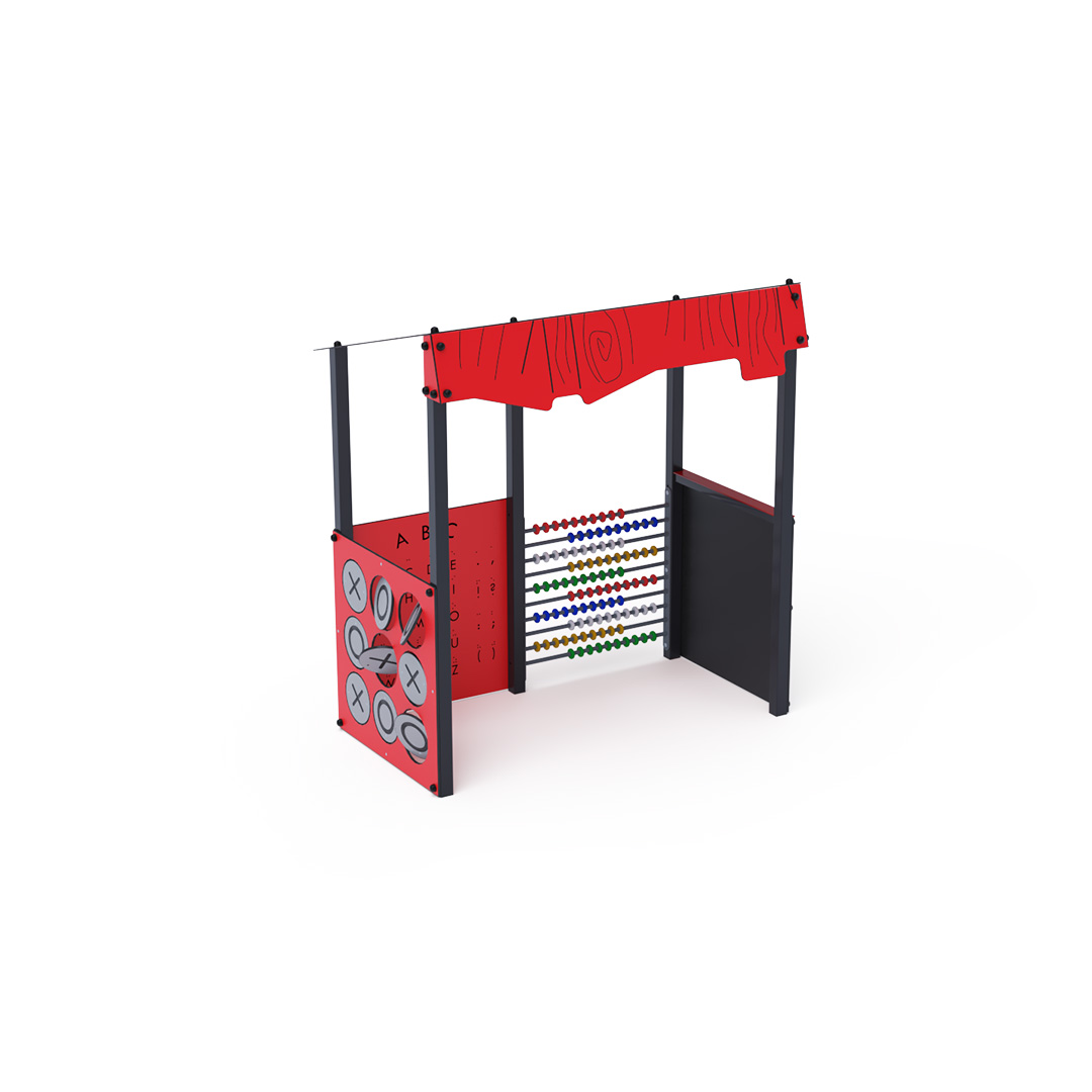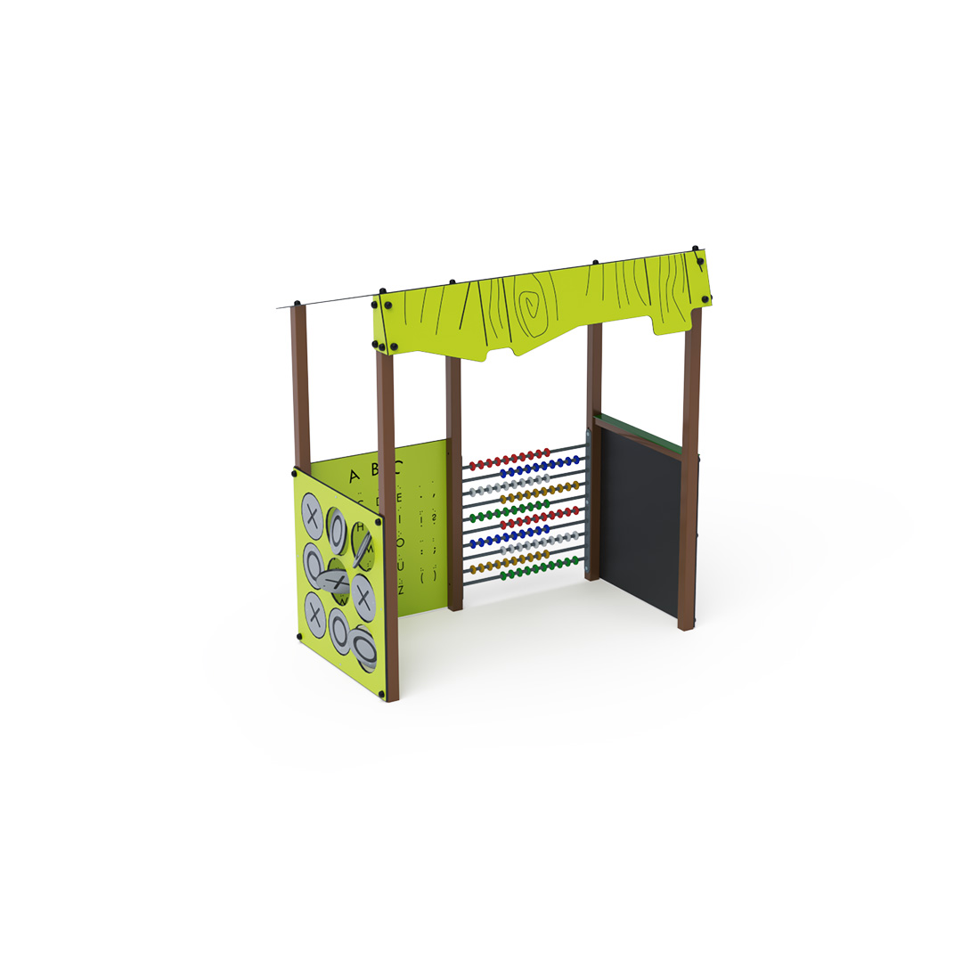 Ein unterhaltsames Lernhaus, das Kindern nicht nur Neues beibringt, sondern sie auch begeistert. Das Haus mit seinem schrägen Dach in Holzoptik ist mit einer Zeichentafel, HPL-Tic-Tac-Toe-Steinen, einem Edelstahlzähler bis 100 und einer doppelseitigen Lerntafel ausgestattet. Diese enthält auf der einen Seite das lateinische Alphabet und Blindenschrift, auf der anderen Seite arabische und römische Ziffern. Die Hauskonstruktion besteht aus verzinktem und pulverbeschichtetem Stahl, alle Tafeln aus UV-beständigem, farbechtem, ungiftigem und bruchfestem HPL-Material. Alle Verbindungen sind aus Edelstahl und mit Kunststoffkappen abgedeckt.