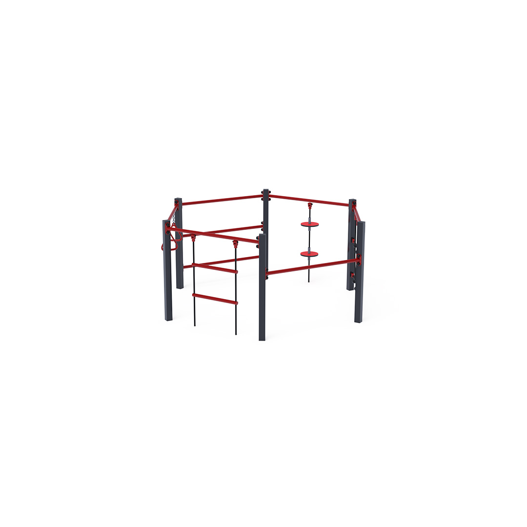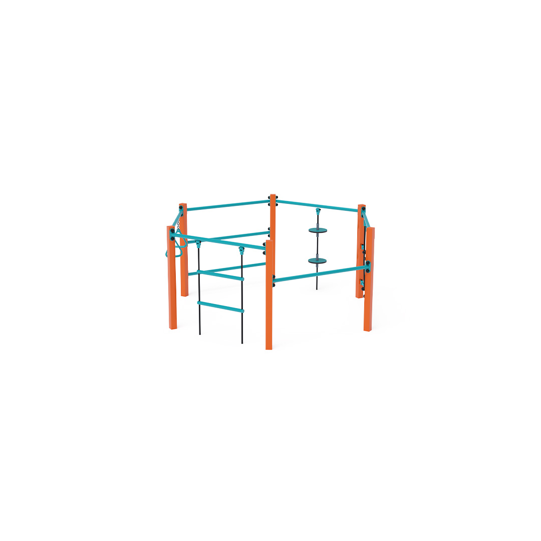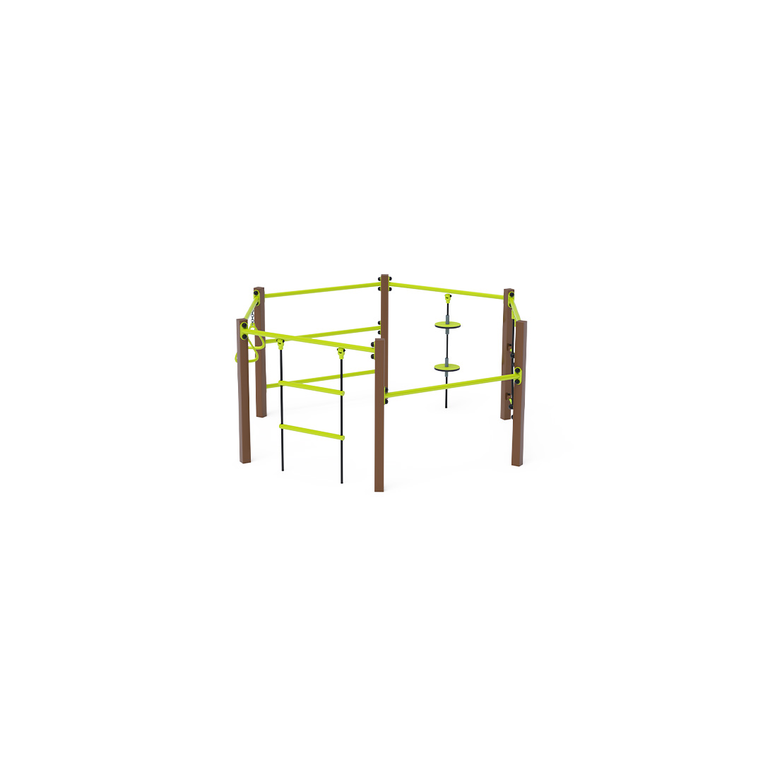 Eine Mini-Turnanlage ist ein Sechseck, bestehend aus einer Stange, Turnringen, einem Seil mit Balanceplatten, einem Kletternetz, einer Leiter und einem Trapez. Die Spielelemente sind aus feuerverzinktem Stahl mit hochwertiger Oberflächenveredelung gefertigt. Die Verbindungen bestehen aus Edelstahl und sind mit Kunststoffkappen versehen, um die Sicherheit und Langlebigkeit zu erhöhen. Die Seile bestehen aus Polyesterfasern, die um den Kern gewickelt sind. Diese Konstruktion erhöht die Festigkeit und Widerstandsfähigkeit gegen mechanische Belastung. Polyester selbst besitzt viele positive Eigenschaften: Es ist resistent gegen Mikroorganismen und Witterungseinflüsse, trocknet schnell nach Regen, ist farbecht und zeichnet sich durch hohe Festigkeit aus. Das Mini-Turncenter VVZ-MGYM005 ist nach der Norm STN EN 1176 zertifiziert.