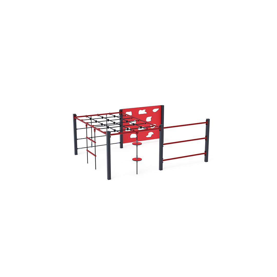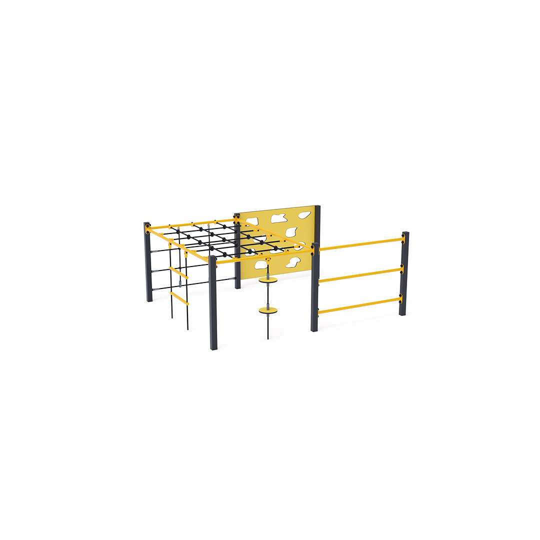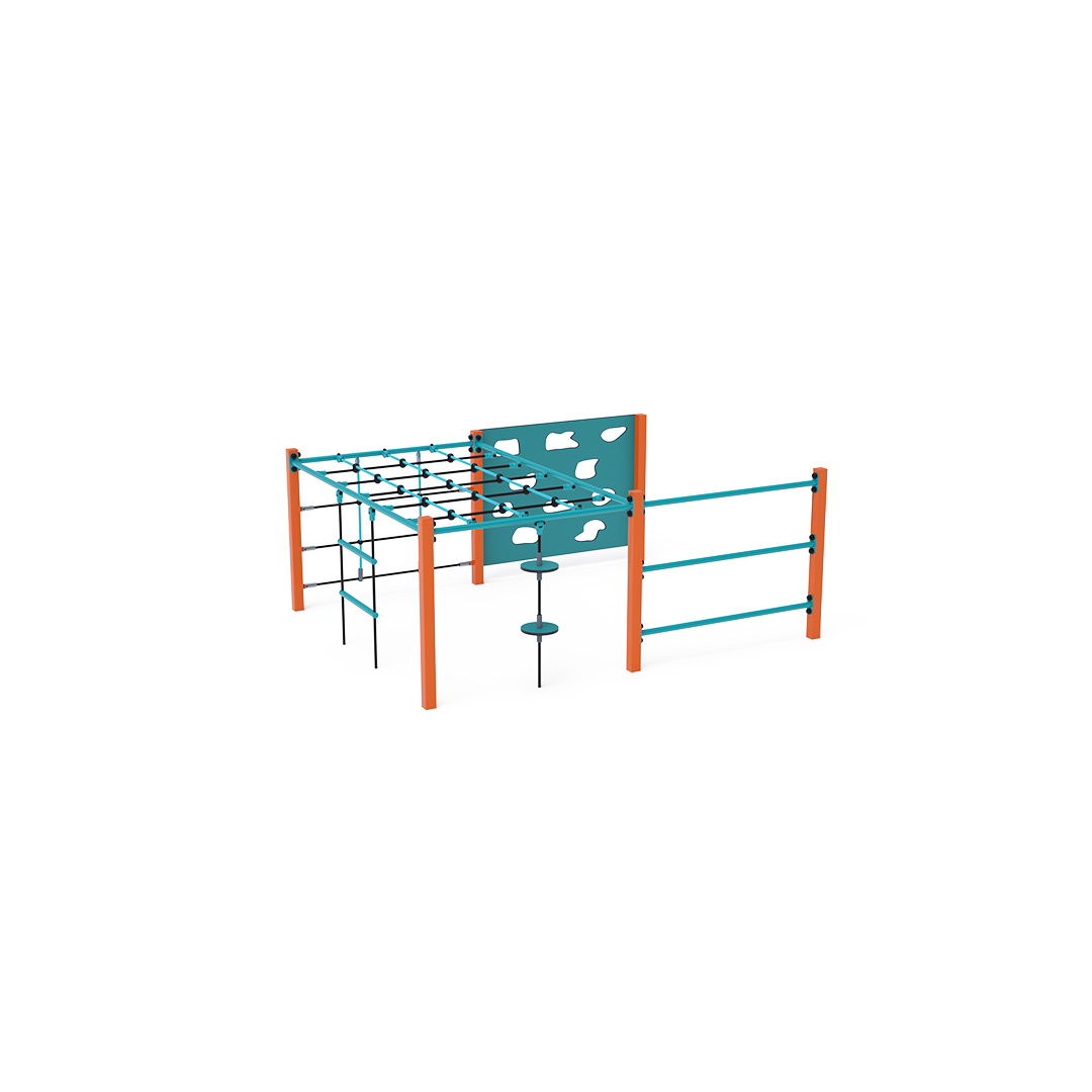 Die Mini-Turnhalle in Quaderform besteht aus sechs Segmenten: Rippen, Seilen mit Balanceplatten, Seilwand, Leiter und Kletternetz. Die Spielelemente sind aus feuerverzinktem Stahl mit hochwertiger Oberflächenveredelung gefertigt. Die Verbindungen bestehen aus Edelstahl und sind mit Kunststoffkappen versehen, um Sicherheit und Langlebigkeit zu gewährleisten. Die Seile sind aus Polyesterfasern gefertigt, die um den Kern gewickelt sind. Diese Konstruktion erhöht die Festigkeit und Widerstandsfähigkeit gegen mechanische Belastung. Polyester besitzt viele positive Eigenschaften: Es ist resistent gegen Mikroorganismen und Witterungseinflüsse, trocknet schnell nach Regen, ist farbecht und zeichnet sich durch hohe Festigkeit aus. Das Mini-Turmcenter VVZ-MGYM006 ist nach der Norm STN EN 1176 zertifiziert.