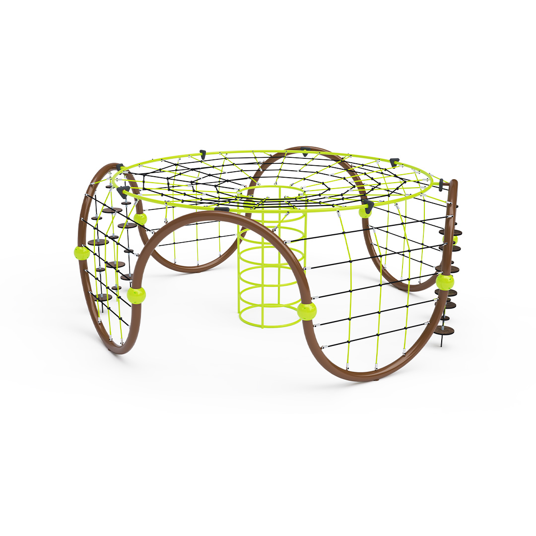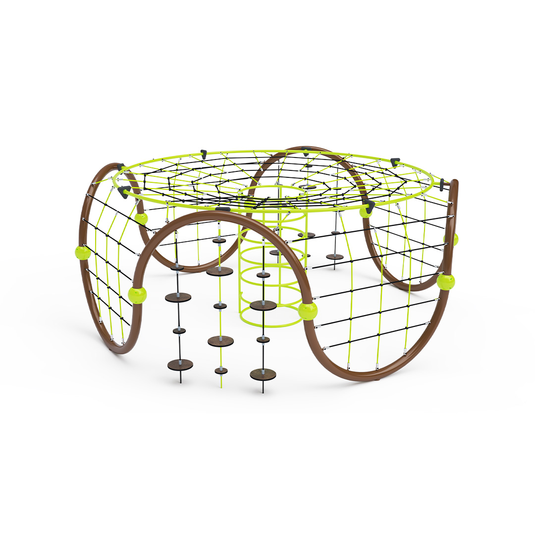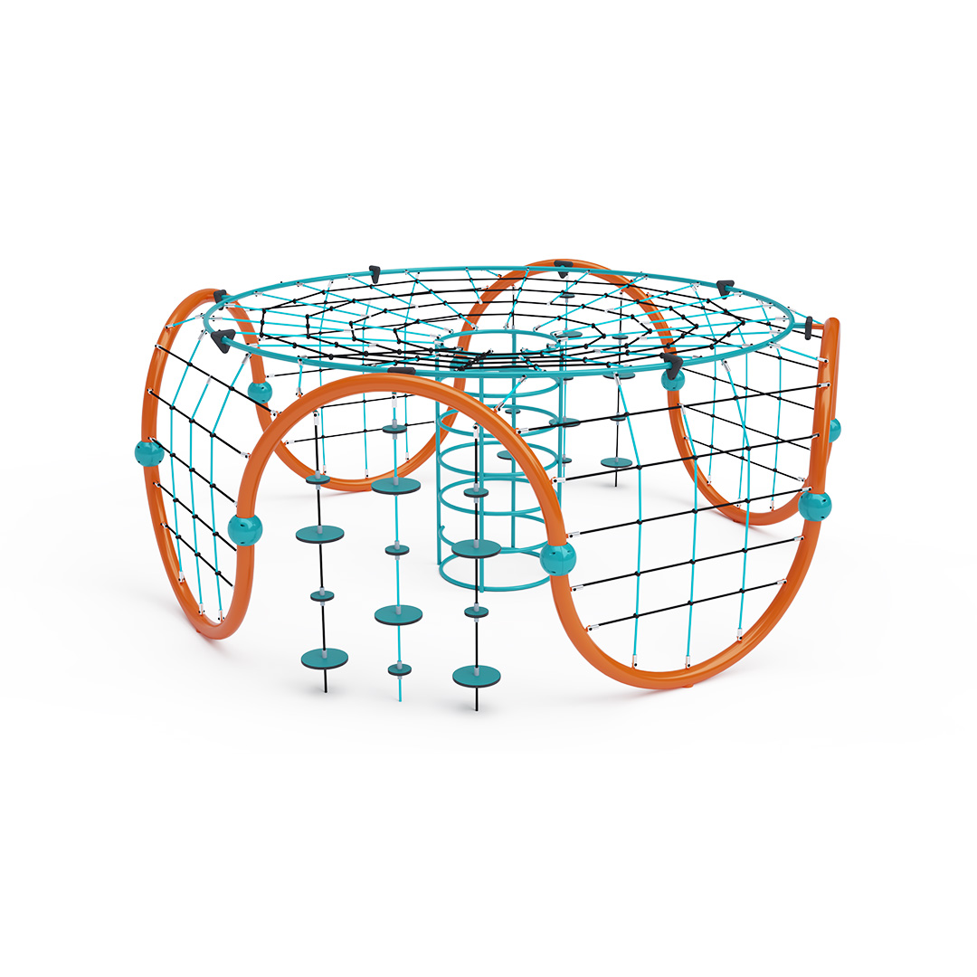 Ein mittelgroßes Seiliglu mit vier Kletternetzen und einem zentralen Tunnel wird durch zwei Sets hängender Balanciersteine ergänzt. Das Spielelement besteht aus verzinktem Stahl mit einer hochwertigen Pulverbeschichtung. Die Verbindungen sind aus Edelstahl und mit Kunststoffkappen versehen, um die Sicherheit und Langlebigkeit zu erhöhen. Die Seile bestehen aus Polyesterfasern mit einem Stahlkern, der um die Mitte gewickelt ist. Diese Konstruktion erhöht die Festigkeit und Widerstandsfähigkeit gegen mechanische Belastung. Polyester selbst besitzt viele positive Eigenschaften: Es ist resistent gegen Mikroorganismen und Witterungseinflüsse, trocknet schnell nach Regen, ist farbecht und zeichnet sich durch hohe Festigkeit aus.