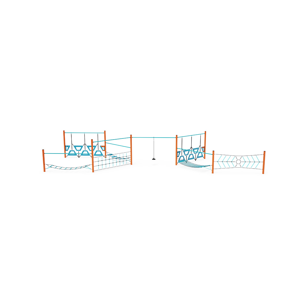 Der Affenparcours besteht aus acht Elementen: Spinnennetz, Hängematte, trapezförmigen Wänden, frei hängendem Seil, vertikalem Netz mit Hilfsstange, Balancierleiter und pädagogischen Balancierstufen. Die Spielelemente sind aus verzinktem Stahl mit hochwertiger Pulverbeschichtung gefertigt. Die Verbindungsstücke bestehen aus Edelstahl und sind mit Kunststoffkappen versehen, um Sicherheit und Langlebigkeit zu gewährleisten. Die Seile bestehen aus Polyesterfasern mit einem Stahlkern, der um die Mitte gewickelt ist. Diese Konstruktion erhöht die Festigkeit und Widerstandsfähigkeit der Seile gegen mechanische Belastung. Polyester besitzt viele positive Eigenschaften. Es ist resistent gegen Mikroorganismen und Witterungseinflüsse, trocknet schnell nach Regen, ist farbecht und zeichnet sich durch hohe Festigkeit aus.