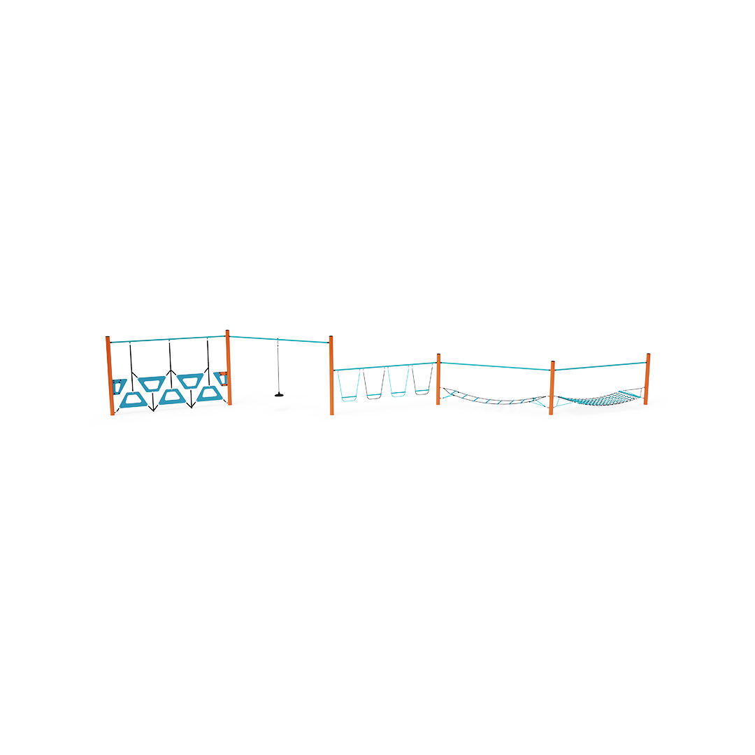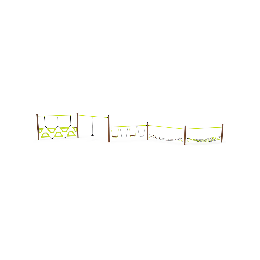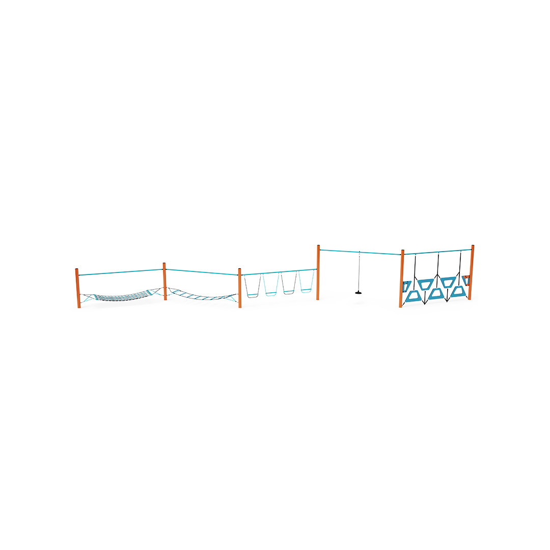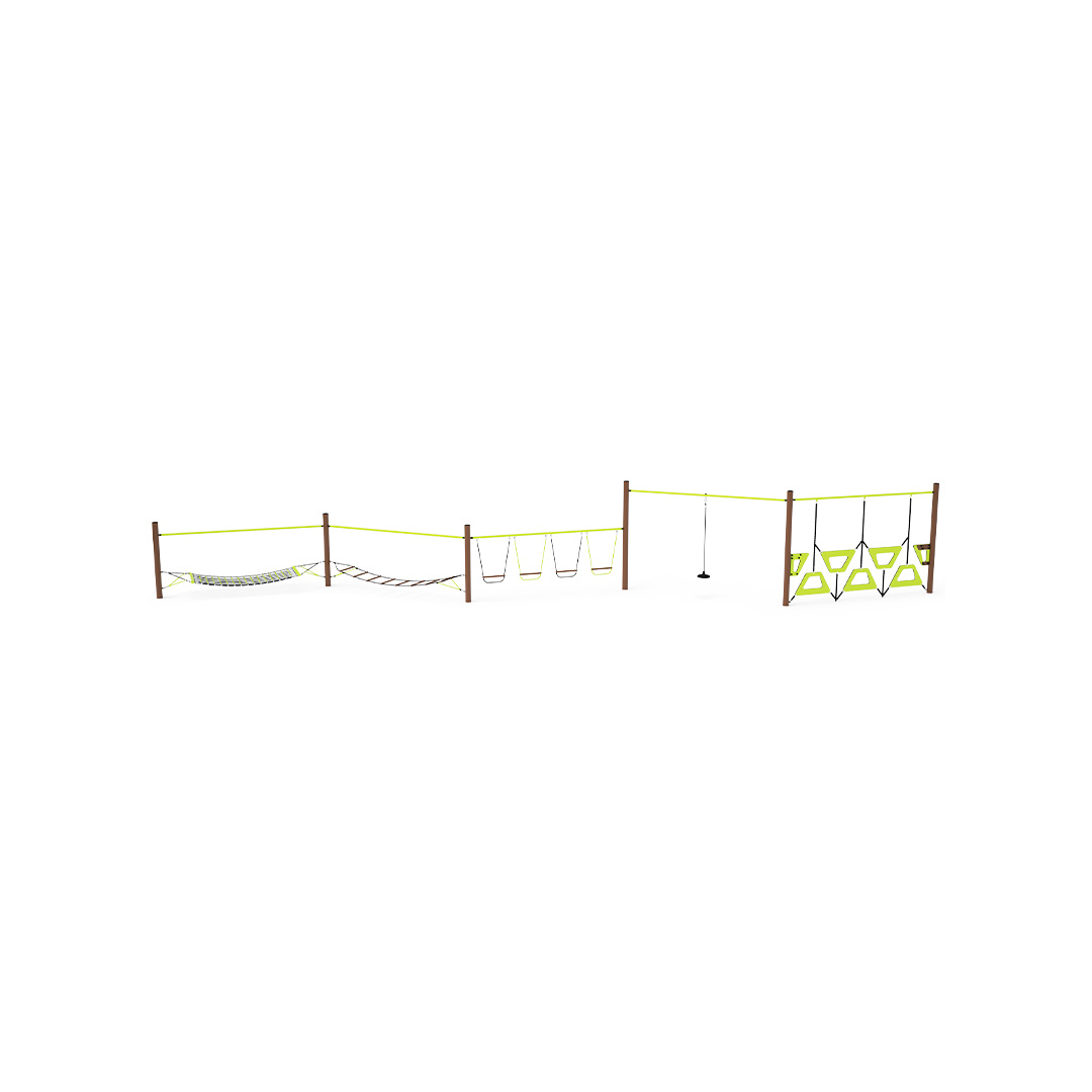 Eine Kletterstange, bestehend aus fünf Elementen: einer trapezförmigen Wand, einem frei hängenden Seil, hängenden Schaukelstufen, einer Balancierleiter und einem Seilnetz. Das Spielelement ist aus verzinktem Stahl gefertigt und hochwertig pulverbeschichtet. Die Verbindungen bestehen aus Edelstahl und sind mit Kunststoffkappen versehen, um Sicherheit und Langlebigkeit zu erhöhen. Die Seile bestehen aus Polyesterfasern mit einem Stahlkern, der um die Mitte gewickelt ist. Diese Konstruktion erhöht die Festigkeit und Widerstandsfähigkeit des Seils gegen mechanische Belastung. Polyester besitzt viele positive Eigenschaften. Es ist resistent gegen Mikroorganismen und Witterungseinflüsse, trocknet schnell nach Regen, ist farbecht und zeichnet sich durch hohe Festigkeit aus.