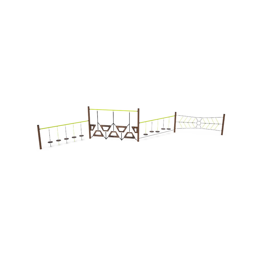 Ein Affenparcours, der aus vier Elementen besteht: Balancescheiben, einer trapezförmigen Wand, frei hängenden Scheiben und einem Spinnennetz. Die Spielelemente sind aus verzinktem Stahl gefertigt und hochwertig pulverbeschichtet. Die Verbindungsstücke bestehen aus Edelstahl und sind mit Kunststoffkappen versehen, um die Sicherheit und Langlebigkeit zu erhöhen. Die Seile bestehen aus Polyesterfasern mit einem Stahlkern, der um die Mitte gewickelt ist. Diese Konstruktion erhöht die Festigkeit und Widerstandsfähigkeit gegen mechanische Belastung. Polyester besitzt viele positive Eigenschaften. Es ist resistent gegen Mikroorganismen und Witterungseinflüsse, trocknet schnell nach Regen, ist farbecht und zeichnet sich durch hohe Festigkeit aus.