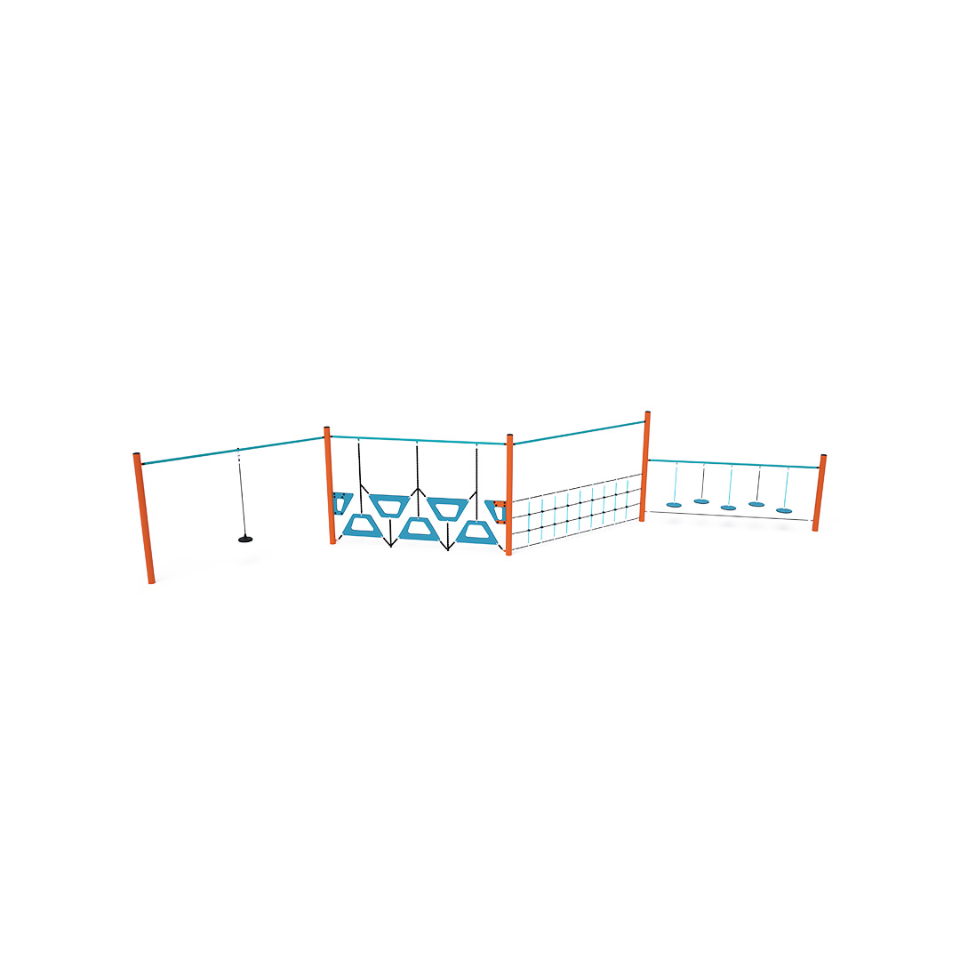 Ein Affenparcours, der aus vier Elementen besteht: einer frei hängenden Scheibe, einer trapezförmigen Wand, einer Seilwand mit Hilfsstange und frei hängenden Scheiben. Das Spielelement ist aus verzinktem Stahl gefertigt und hochwertig pulverbeschichtet. Die Verbindungsstücke sind aus Edelstahl und mit Kunststoffkappen versehen, um Sicherheit und Langlebigkeit zu erhöhen. Die Seile bestehen aus Polyesterfasern mit einem Stahlkern, der um die Mitte gewickelt ist. Diese Konstruktion erhöht die Festigkeit und Widerstandsfähigkeit gegen mechanische Belastung. Polyester besitzt viele positive Eigenschaften. Es ist resistent gegen Mikroorganismen und Witterungseinflüsse, trocknet schnell nach Regen, ist farbecht und zeichnet sich durch hohe Festigkeit aus.