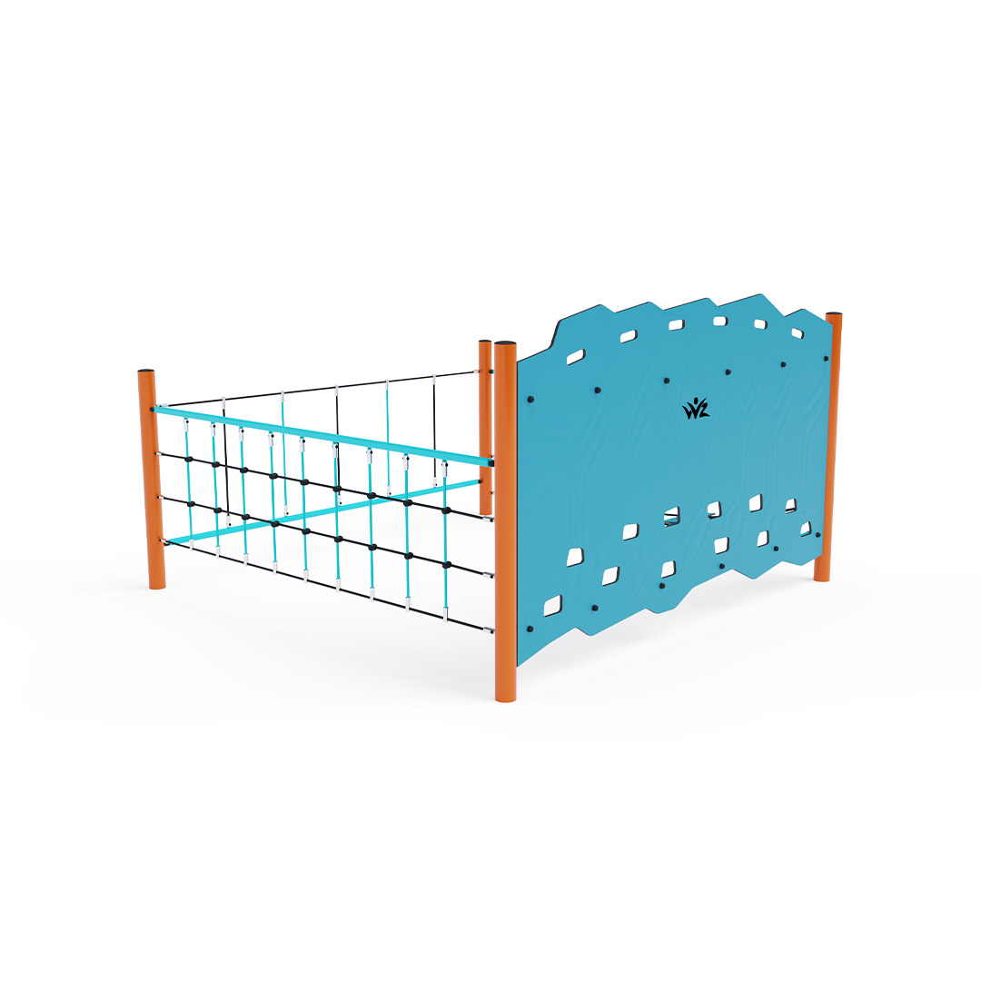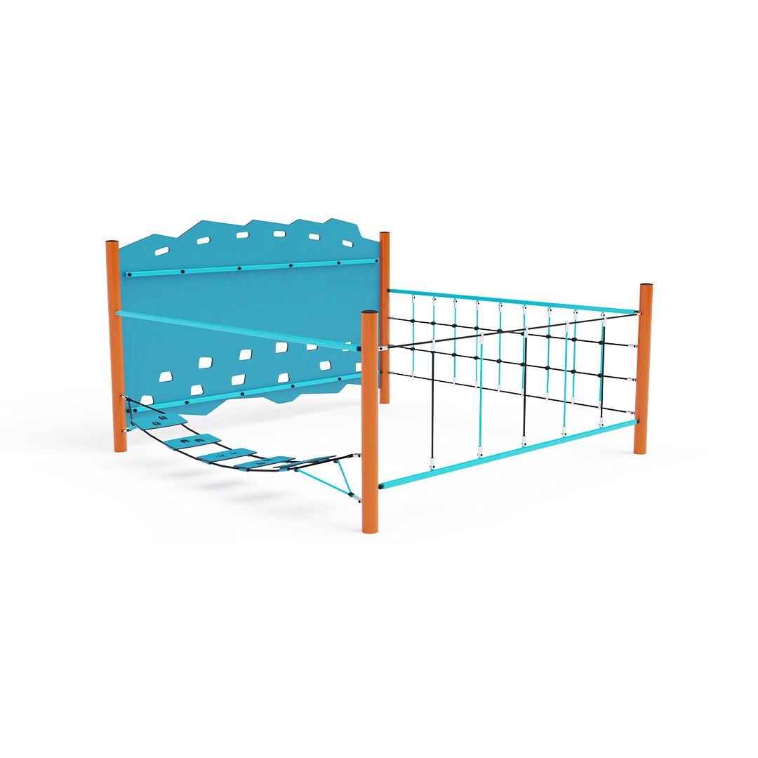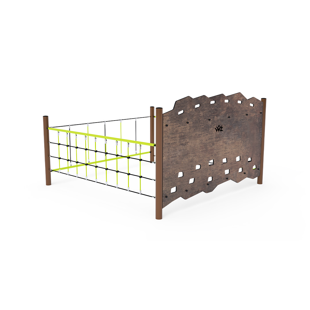 Ein Affenparcours, der aus vier Elementen besteht. Ein Teil dient zum Festhalten an den Seiten. Ein weiterer Teil besteht aus einem vertikalen Seilnetz, das die Handkraft der Kinder testet. Ein dritter Teil bildet eine vertikale Wand. Ein vierter Teil besteht aus HPL-Balancestufen, die nicht nur den Gleichgewichtssinn der Kinder trainieren, sondern ihnen auch zeigen, welche Spuren verschiedene Tiere hinterlassen. Die Spielelemente sind aus feuerverzinktem Stahl mit einer hochwertigen Oberflächenveredelung gefertigt. Die Verbindungsstücke bestehen aus Edelstahl und sind mit Kunststoffkappen versehen, um die Sicherheit und Langlebigkeit zu erhöhen. Die Seile bestehen aus Polyesterfasern, die um den Kern gewickelt sind. Diese Konstruktion erhöht die Festigkeit und Widerstandsfähigkeit der Seile gegen mechanische Belastung. Polyester besitzt viele positive Eigenschaften. Es ist resistent gegen Mikroorganismen und Witterungseinflüsse, trocknet schnell nach Regen, ist farbecht und zeichnet sich durch hohe Festigkeit aus.