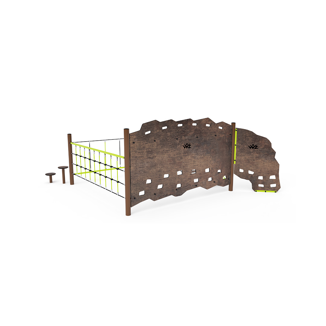 Ein Affenparcours, der aus vier Elementen besteht. Ein Teil dient zum Festhalten an den Seiten. Ein weiterer Teil besteht aus einem vertikalen Seilnetz, das die Handkraft der Kinder testet. Ein dritter Teil bildet eine vertikale Wand. Ein vierter Teil besteht aus HPL-Balancestufen, die nicht nur den Gleichgewichtssinn der Kinder trainieren, sondern ihnen auch zeigen, welche Spuren verschiedene Tiere hinterlassen. Die Spielelemente sind aus feuerverzinktem Stahl mit einer hochwertigen Oberflächenveredelung gefertigt. Die Verbindungsstücke bestehen aus Edelstahl und sind mit Kunststoffkappen versehen, um die Sicherheit und Langlebigkeit zu erhöhen. Die Seile bestehen aus Polyesterfasern, die um den Kern gewickelt sind. Diese Konstruktion erhöht die Festigkeit und Widerstandsfähigkeit der Seile gegen mechanische Belastung. Polyester besitzt viele positive Eigenschaften. Es ist resistent gegen Mikroorganismen und Witterungseinflüsse, trocknet schnell nach Regen, ist farbecht und zeichnet sich durch hohe Festigkeit aus.