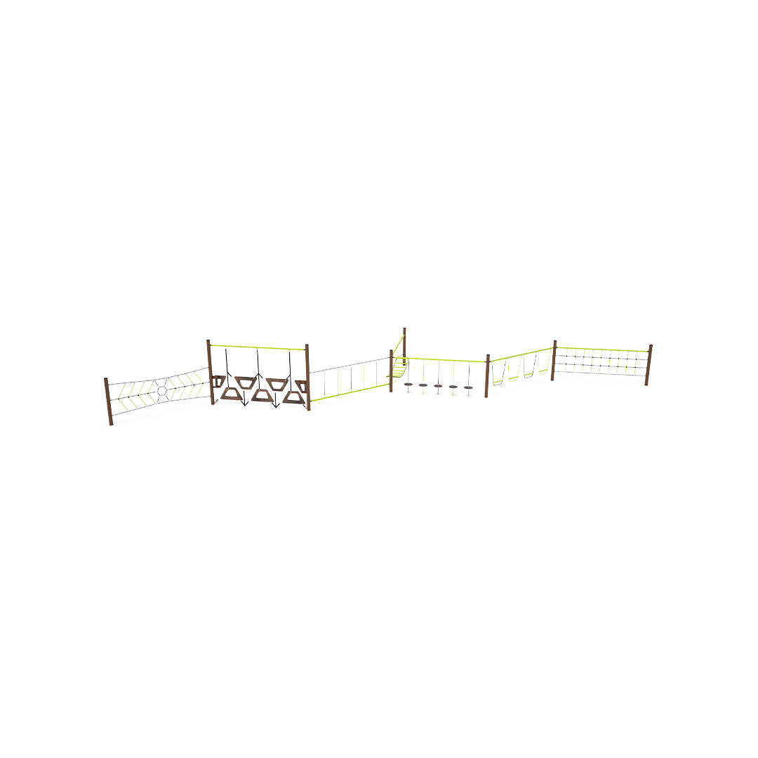 Eine Kletterstange, die aus sieben Teilen besteht: einem Seilnetz, vertikalen Stangen, hängenden Balanciersteinen, einem horizontalen Netz mit Stangen, einem Griffsegment, einer trapezförmigen Wand und einem vertikalen Spinnennetz. Das Spielelement ist aus verzinktem Stahl mit einer hochwertigen Pulverbeschichtung gefertigt. Die Verbindungen bestehen aus Edelstahl und sind mit Kunststoffkappen versehen, um die Sicherheit und Langlebigkeit zu erhöhen. Die Seile bestehen aus Polyesterfasern mit einem Stahlkern, der um die Mitte gewickelt ist. Diese Konstruktion erhöht die Festigkeit und Widerstandsfähigkeit der Seile gegen mechanische Belastung. Polyester besitzt viele positive Eigenschaften. Es ist resistent gegen Mikroorganismen und Witterungseinflüsse, trocknet schnell nach Regen, ist farbecht und zeichnet sich durch hohe Festigkeit aus.