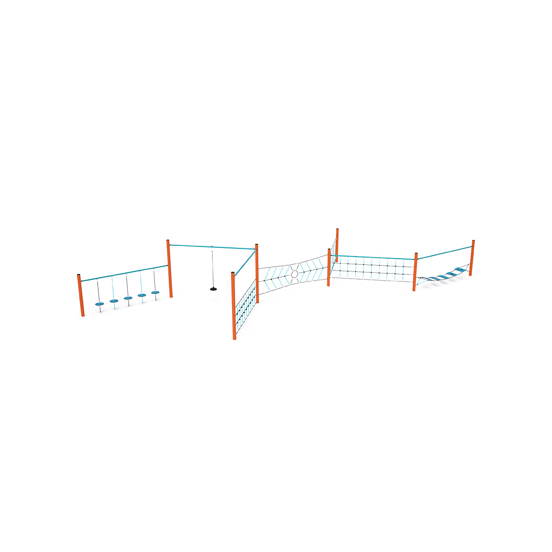 Eine Kletterstange, die aus sieben Teilen besteht: Balanciersteine, ein frei hängendes Seil, ein vertikales Seilnetz, ein Spinnennetz, eine Balancierstange, ein vertikales Seilnetz mit Hilfsstange und pädagogische Balancierstufen. Das Spielelement ist aus feuerverzinktem Stahl mit hochwertiger Oberflächenveredelung gefertigt. Die Verbindungen bestehen aus Edelstahl und sind mit Kunststoffkappen versehen, um die Sicherheit und Langlebigkeit zu erhöhen. Die Seile bestehen aus Polyesterfasern, die um den Kern gewickelt sind. Diese Konstruktion erhöht die Festigkeit und Widerstandsfähigkeit des Seils gegen mechanische Belastung. Polyester besitzt viele positive Eigenschaften. Es ist resistent gegen Mikroorganismen und Witterungseinflüsse, trocknet schnell nach Regen, ist farbecht und zeichnet sich durch hohe Festigkeit aus.