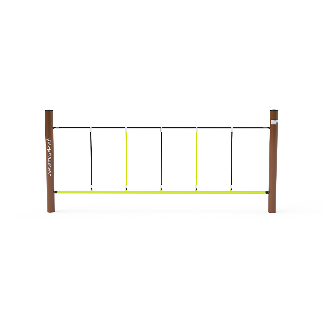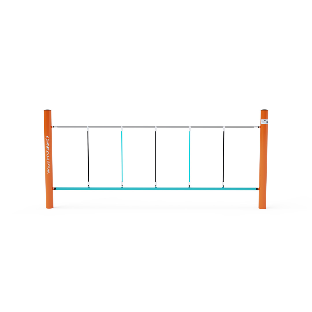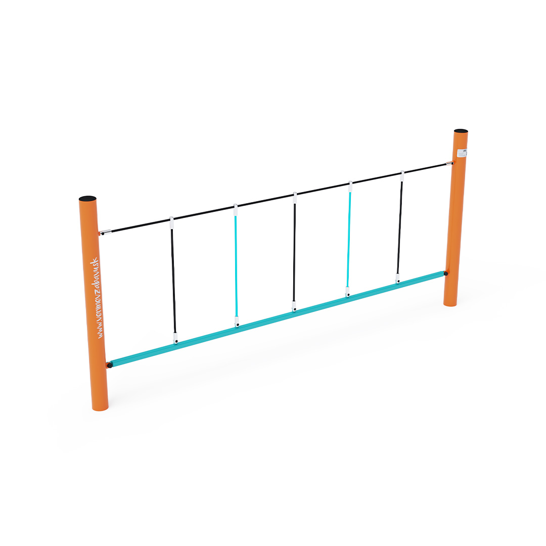 Ein Affenpfad, der sich zum seitlichen Klettern eignet. Obwohl das Kind auf einer stabilen Stange steht, muss es sich am Seil festhalten, das nicht mehr so stark ist. Das Spielelement besteht aus feuerverzinktem Stahl mit einer hochwertigen Oberflächenveredelung. Die Verbindungsstücke sind aus Edelstahl und mit Kunststoffkappen versehen, um die Sicherheit und Haltbarkeit zu erhöhen. Die Seile bestehen aus Polyesterfasern, die um den Kern gewickelt sind. Diese Konstruktion erhöht die Festigkeit und Widerstandsfähigkeit des Seils gegen mechanische Belastung. Polyester besitzt viele positive Eigenschaften. Es ist resistent gegen Mikroorganismen, witterungsbeständig, trocknet schnell nach Regen, ist farbecht und zeichnet sich durch hohe Festigkeit aus.