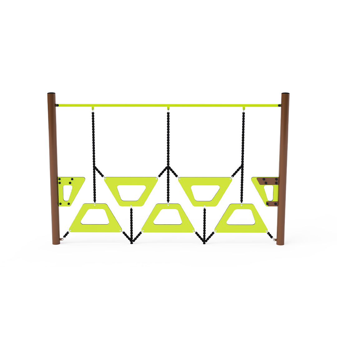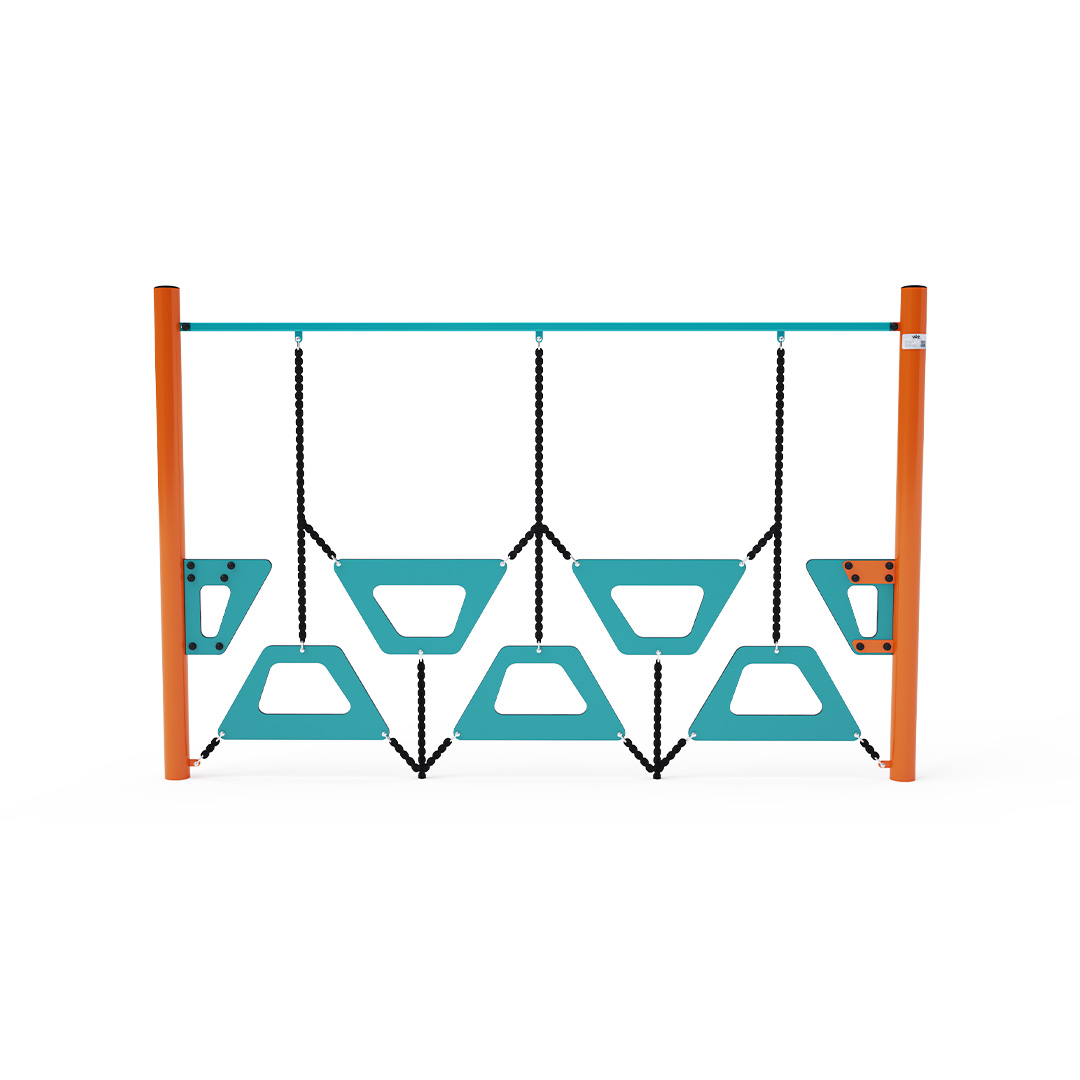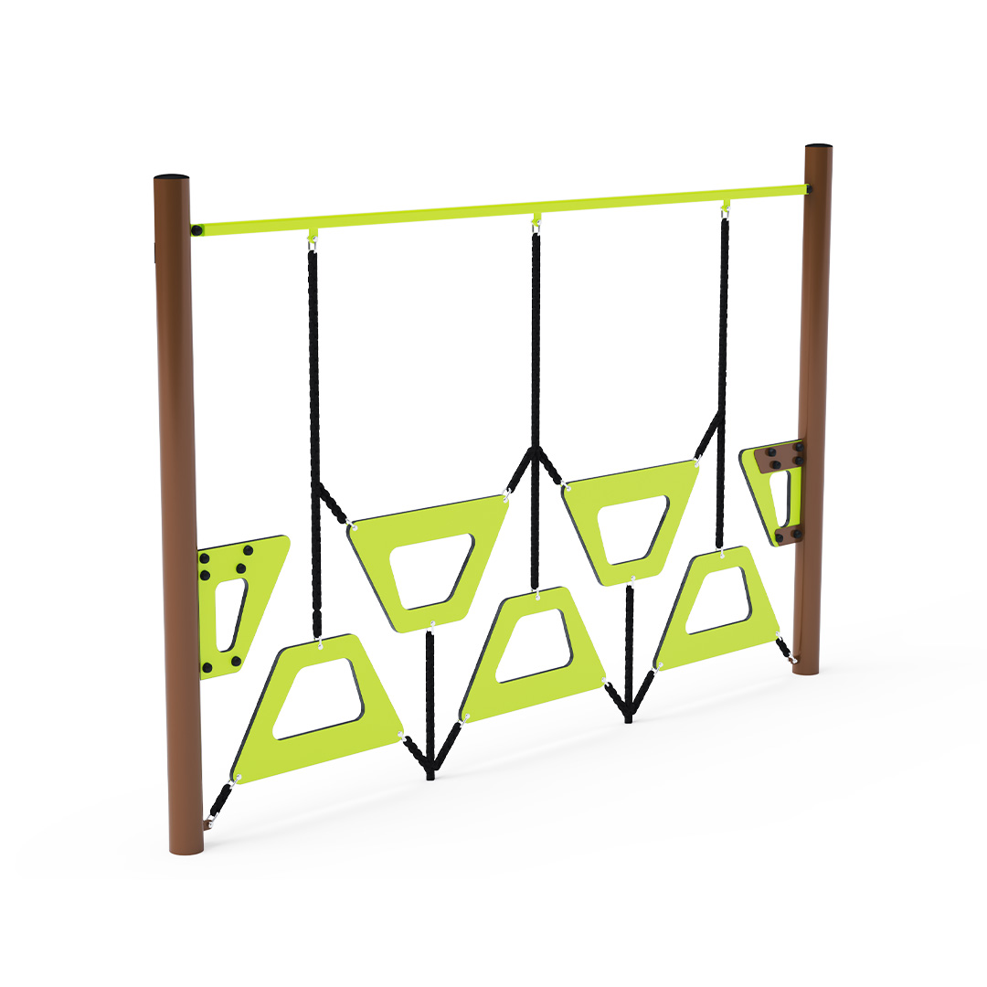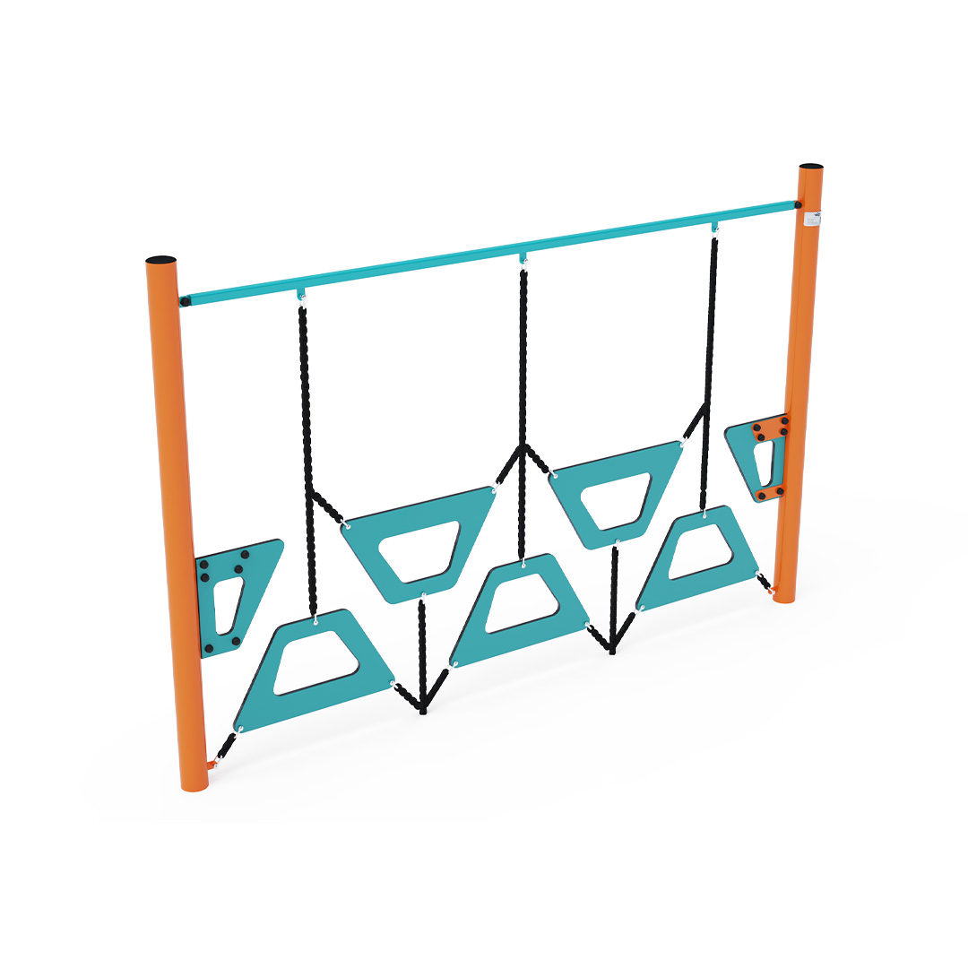 Affenparcours – eine Wand aus Trapezen unterschiedlicher Höhe. Dieses Spielelement zu überwinden macht nicht nur Spaß, sondern erfordert auch Anstrengung. Das Spielelement besteht aus verzinktem Stahl mit einer hochwertigen Oberflächenbehandlung. Die Verbindungsstücke sind aus Edelstahl und mit Kunststoffkappen versehen, um die Sicherheit und Haltbarkeit zu erhöhen. Die Seile bestehen aus Polyesterfasern, die um die Mitte gewickelt sind. Diese Seilkonstruktion erhöht die Festigkeit und Widerstandsfähigkeit gegen mechanische Belastung. Polyester selbst besitzt viele positive Eigenschaften. Es ist resistent gegen Mikroorganismen und Witterungseinflüsse, trocknet schnell nach Regen, ist farbecht und zeichnet sich durch hohe Festigkeit aus.
