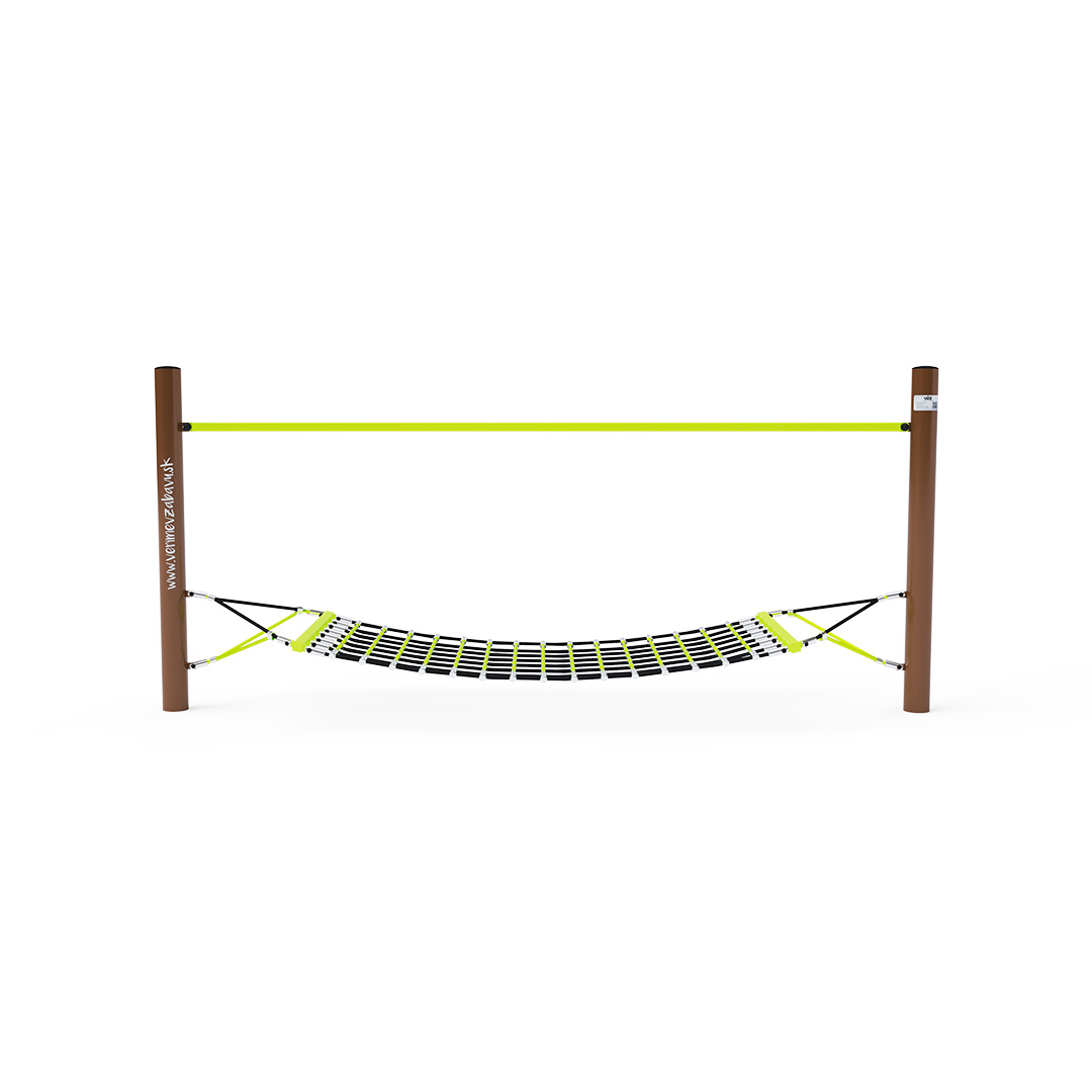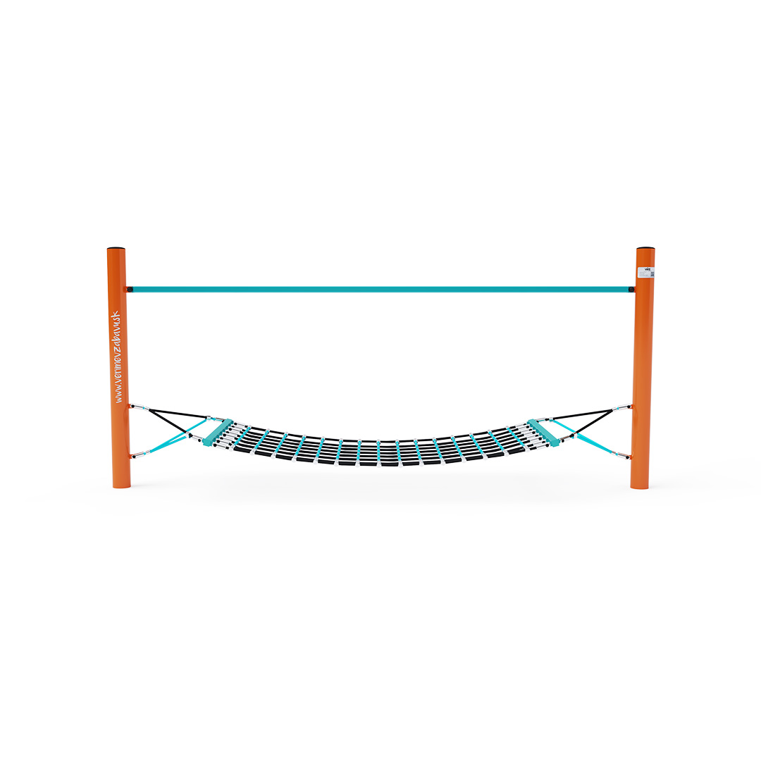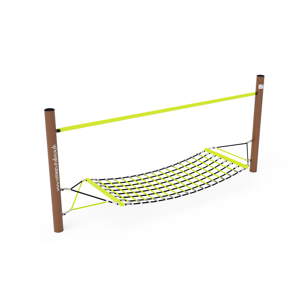 Ein Affenpfad in Form einer Hängematte. Ideal zum Entspannen nach einem anstrengenden Spiel, nicht nur für Kinder. Das Spielelement besteht aus feuerverzinktem Stahl mit einer hochwertigen Oberflächenveredelung. Die Verbindungen sind aus Edelstahl und mit Kunststoffkappen versehen, um die Sicherheit und Langlebigkeit zu erhöhen. Die Seile bestehen aus Polyesterfasern, die um die Mitte gewickelt sind. Diese Seilkonstruktion erhöht die Festigkeit und Widerstandsfähigkeit gegen mechanische Belastung. Polyester selbst besitzt viele positive Eigenschaften. Es ist resistent gegen Mikroorganismen, witterungsbeständig, trocknet schnell nach Regen, ist farbecht und zeichnet sich durch hohe Festigkeit aus.