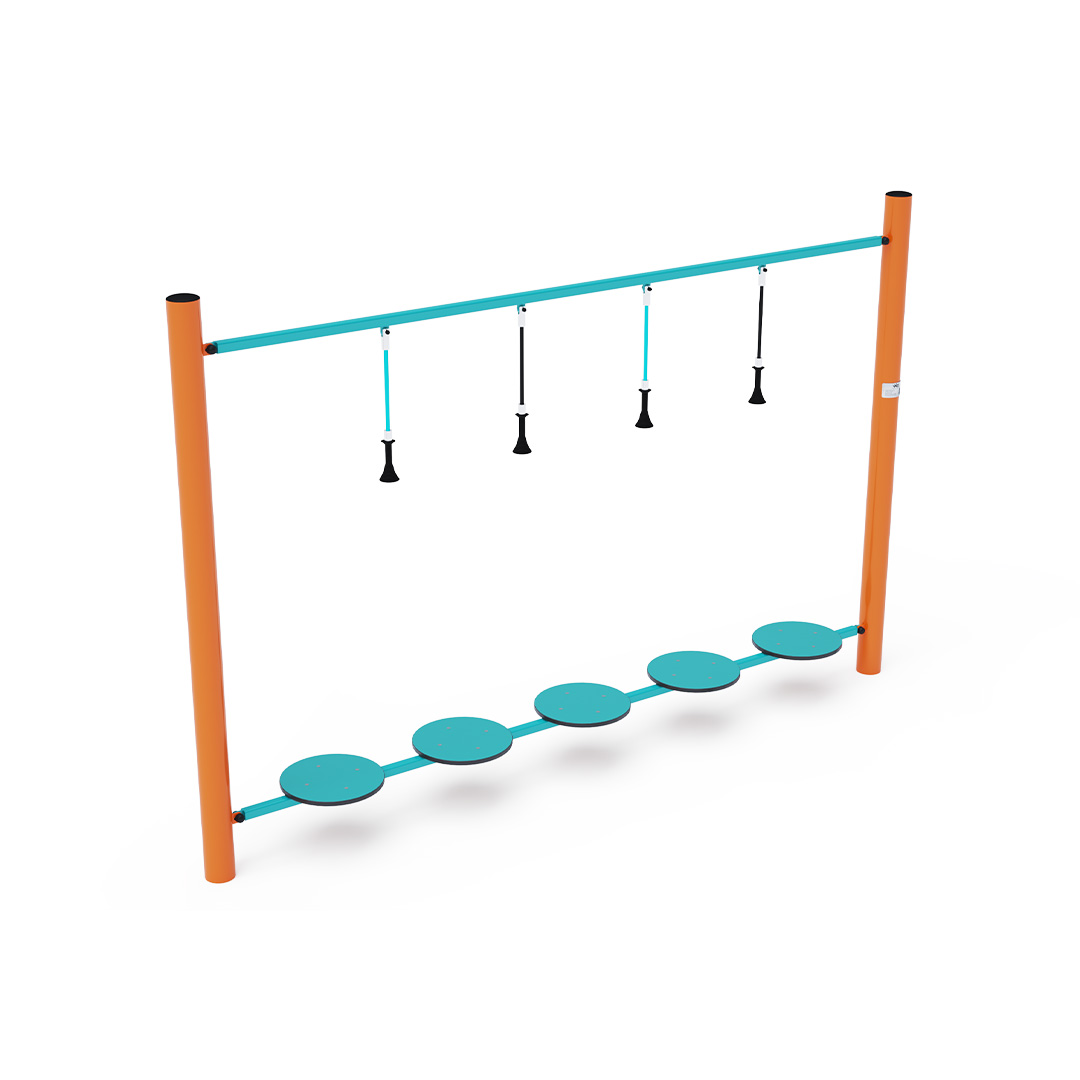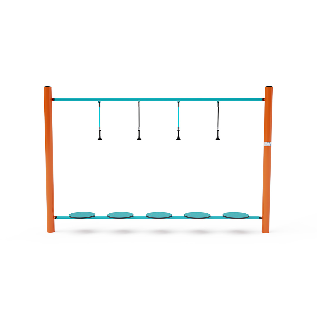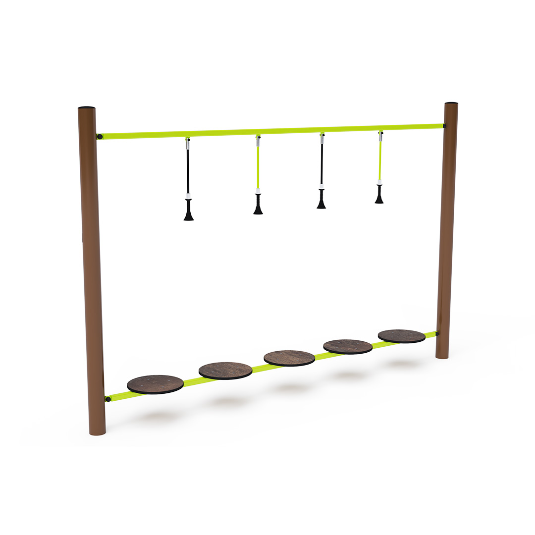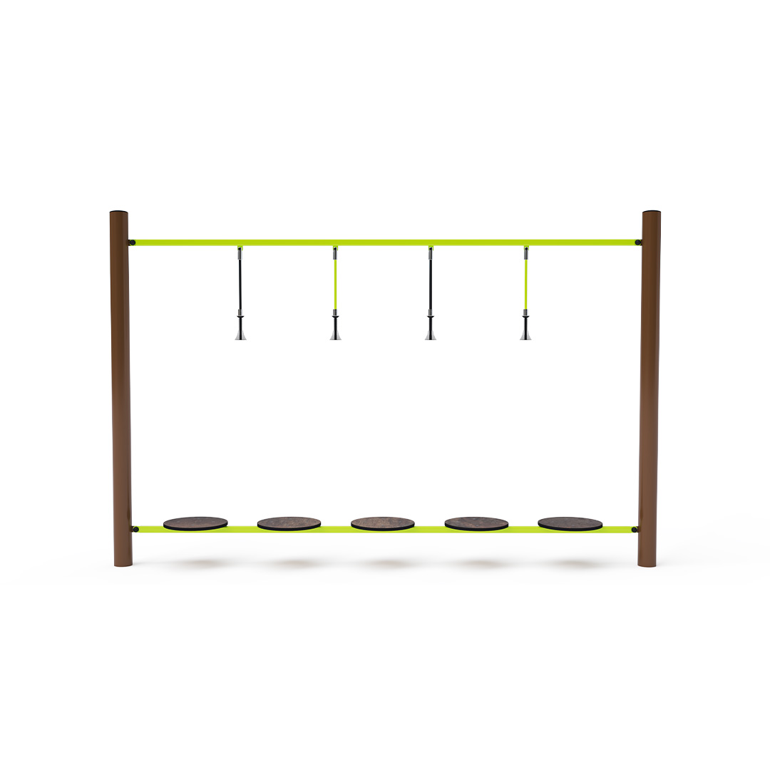 Ein Affenparcours aus HPL-Balancestufen mit zusätzlichen vertikalen Seilen. Jeder Spielplatz wird mit einem Affenparcours noch attraktiver. Das Spielelement besteht aus feuerverzinktem Stahl mit einer hochwertigen Oberflächenveredelung. Die Verbindungen sind aus Edelstahl und mit Kunststoffkappen versehen, um die Sicherheit und Langlebigkeit zu erhöhen. Die Seile bestehen aus Polyesterfasern, die um den Kern gewickelt sind. Diese Konstruktion erhöht die Festigkeit und Widerstandsfähigkeit gegen mechanische Belastung. Polyester besitzt viele positive Eigenschaften. Es ist resistent gegen Mikroorganismen und Witterungseinflüsse, trocknet schnell nach Regen, ist farbecht und zeichnet sich durch hohe Festigkeit aus.