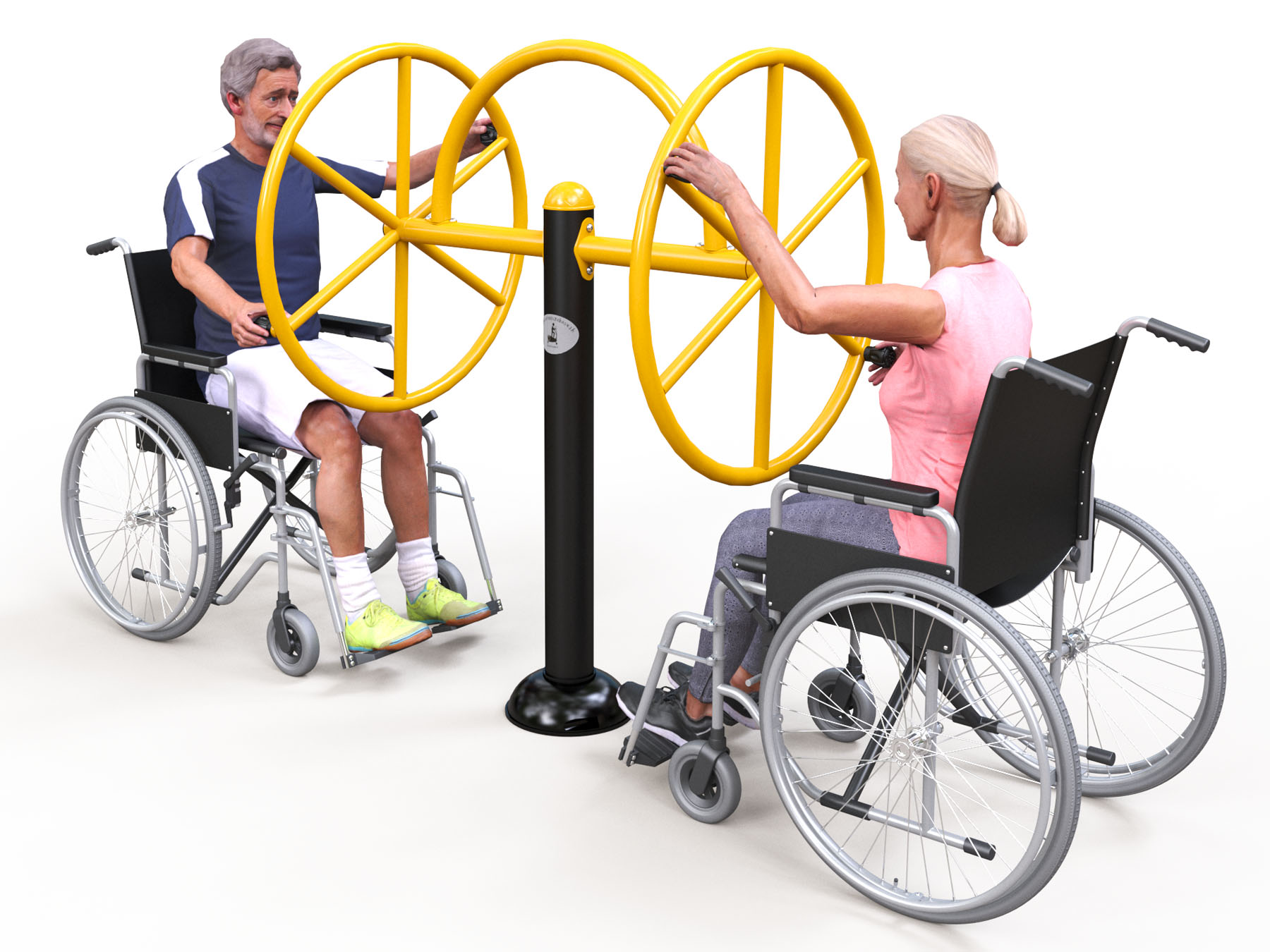 HF02 Outdoor-Fitnessgerät für Menschen mit Behinderung – dient der Kräftigung der Muskulatur und Gelenke der oberen Extremitäten von den Schultern über die Ellbogen bis zum Handgelenk. Die Mindestfläche für die Aufstellung des Geräts beträgt 4230 x 3900 mm.