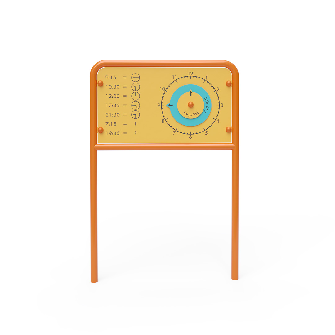 Die Uhrzeit, die Funktionsweise einer Uhr und die Bedeutung der Zeiger lassen sich an der frischen Luft spielerisch erlernen. Die farbcodierten Zeiger der Lerntafel sind beweglich, sodass Kinder so lange üben können, wie sie möchten. Die Lerntafel besteht aus verzinktem Stahl mit Pulverbeschichtung. Die Verbindungen sind aus Edelstahl und mit Kunststoffkappen versehen, um Sicherheit und Langlebigkeit zu gewährleisten. Die Tafel selbst ist aus HPL-Material gefertigt, das chemikalienbeständig, UV-beständig, ungiftig, recycelbar und bruchfest ist. Es besteht keine Verletzungsgefahr für Kinder durch scharfe Kanten oder Splitter.