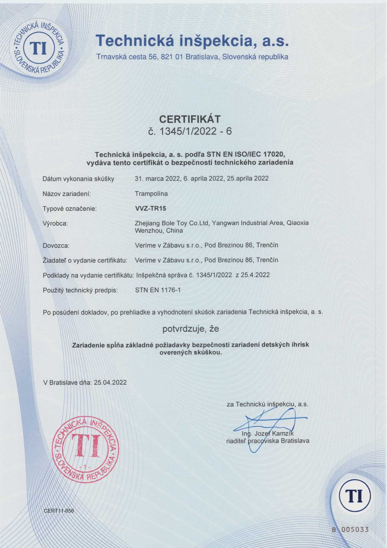 Das quadratische Trampolin VVZ-TR15 ist nach STN EN 1176 zertifiziert.