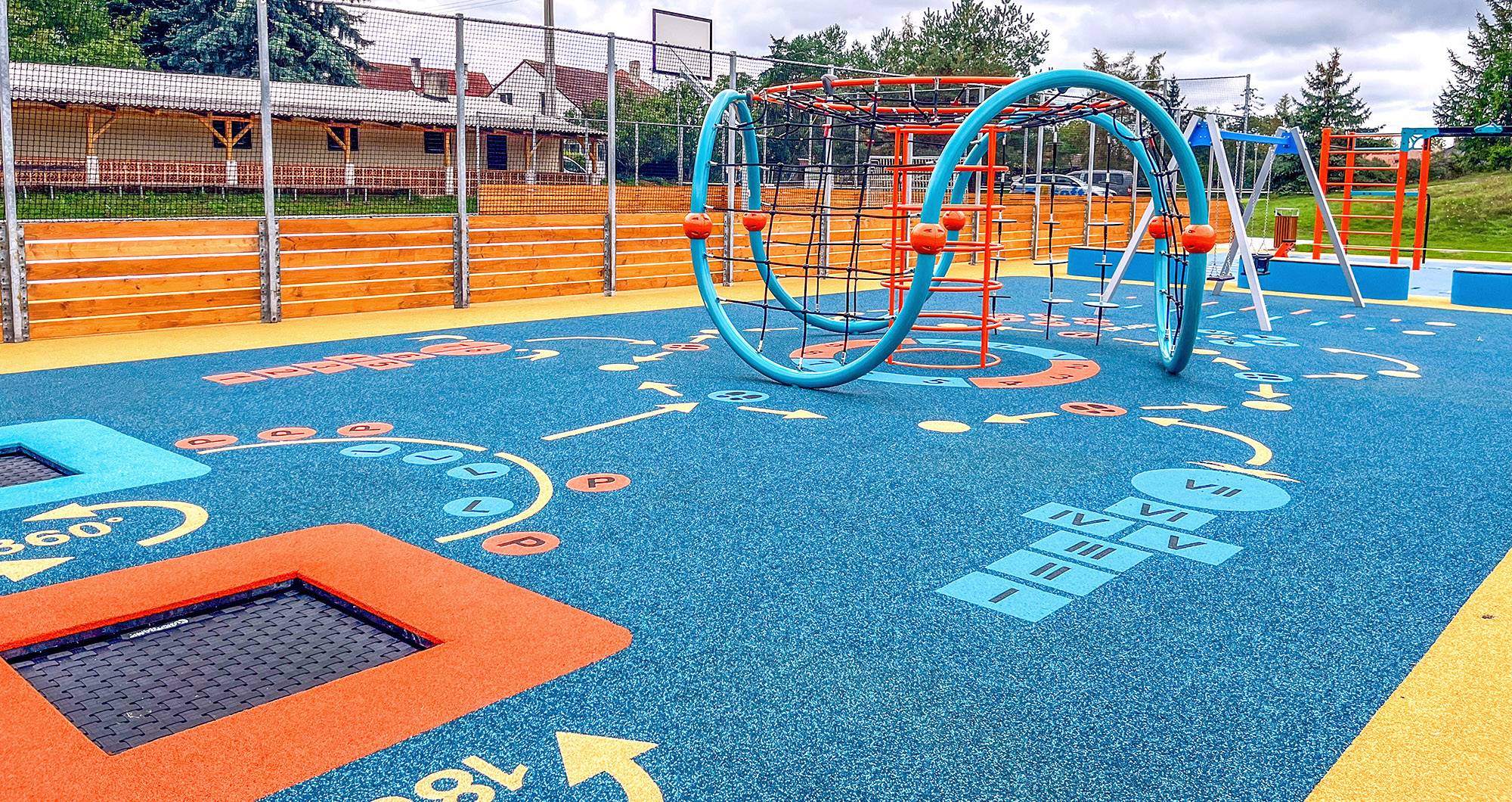 Material: Feuerverzinkter Rahmen, stoßdämpfende EPDM-Oberfläche, strapazierfähiger, rutschfester Kunststoff