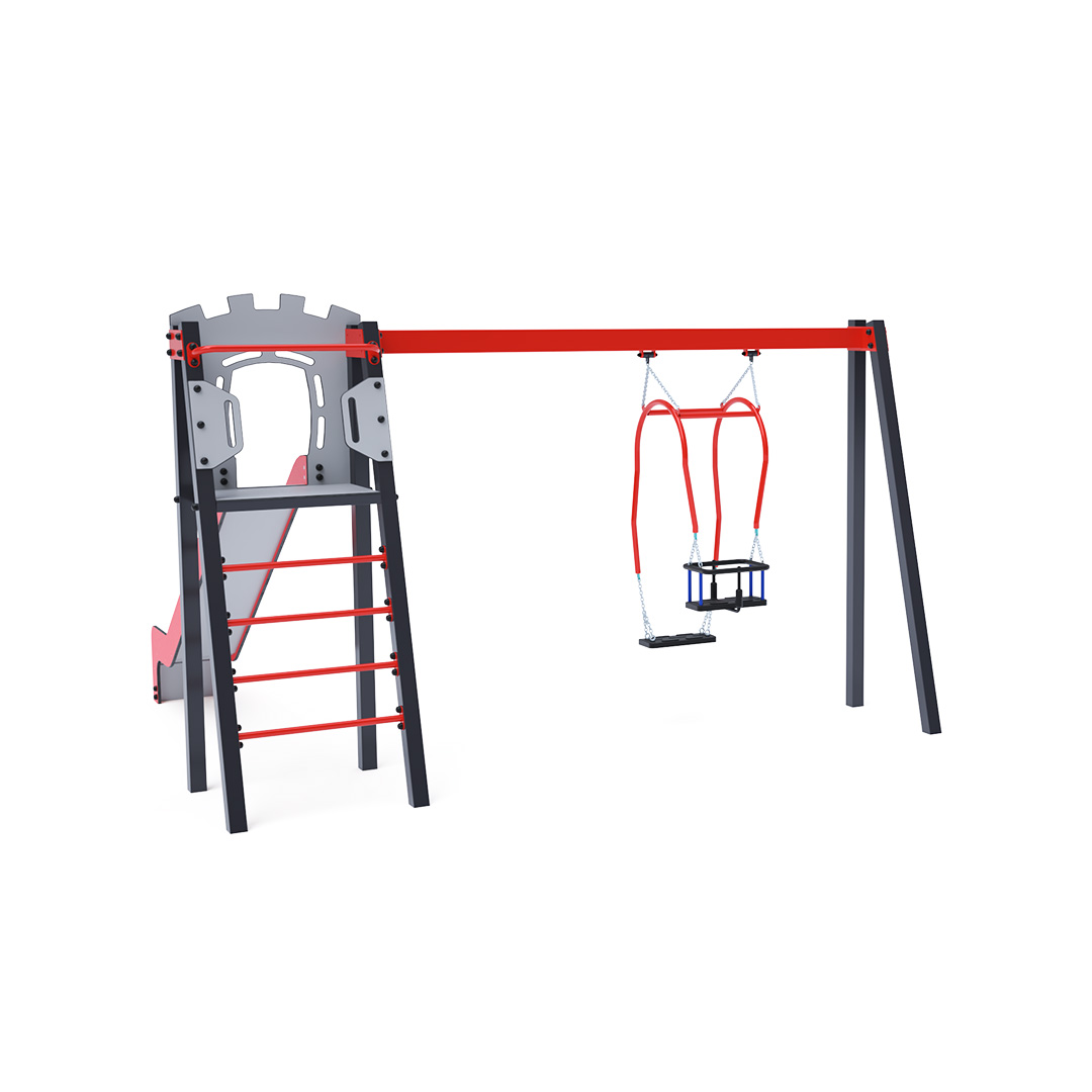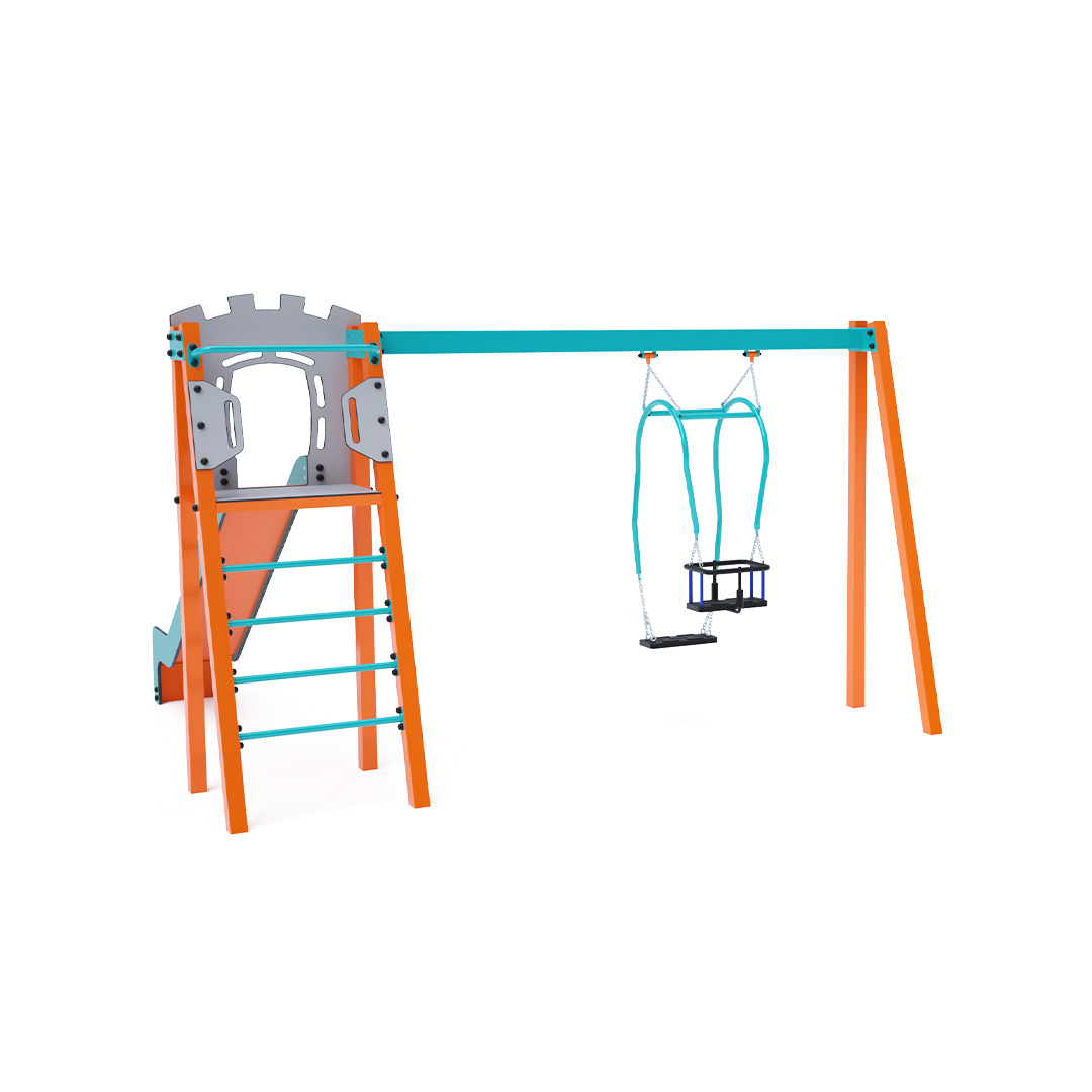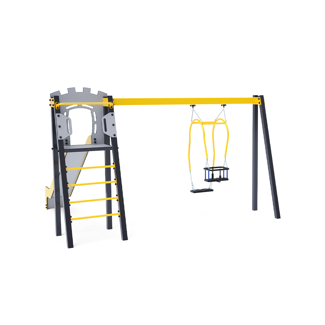 Zertifizierter, wartungsfreier A-förmiger Turm mit geriffeltem Ausstieg und Rutsche, ergänzt durch eine Hängeschaukel mit klassischem Sitz. Die Stahlkonstruktion ist dank Feuerverzinkung und langlebiger Pulverbeschichtung witterungsbeständig. Das verwendete HPL-Material ist chemikalienbeständig, UV-beständig, farbecht, ungiftig, recycelbar und bruchfest. Es besteht keine Verletzungsgefahr für Kinder durch scharfe Kanten oder Splitter. Alle Verbindungen sind aus Edelstahl und mit Kunststoffkappen abgedeckt, um Langlebigkeit und Sicherheit zu erhöhen.