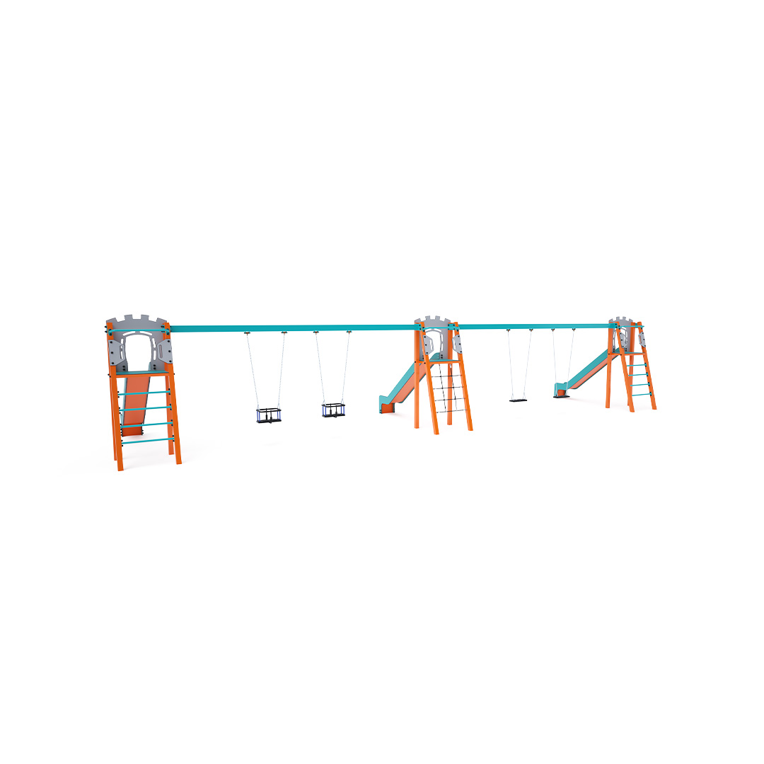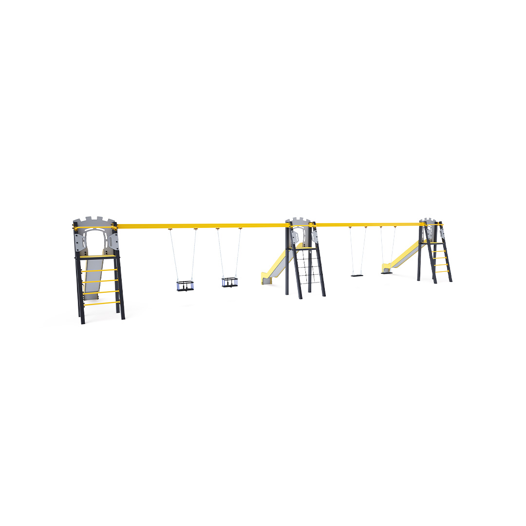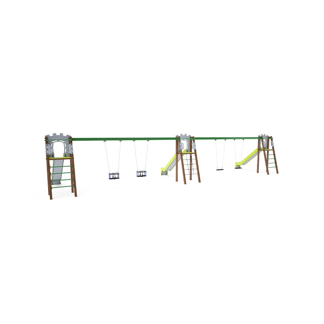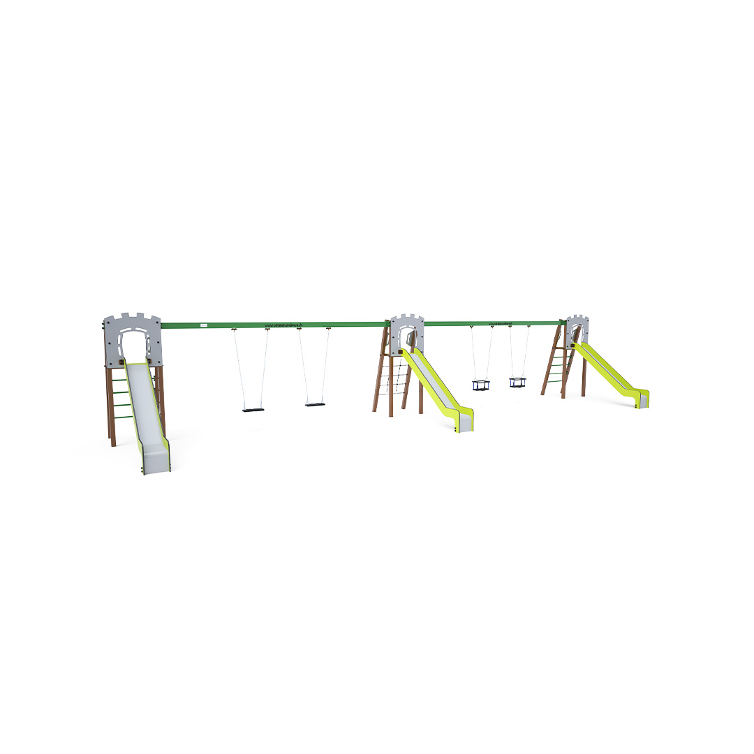 Drei zertifizierte, wartungsfreie A-förmige Türme. Zwei mit geriffeltem Ausgang und Rutsche, einer mit Seilnetz und Rutsche, verbunden durch zwei Doppelschaukeln. Eine Schaukel hat zwei klassische Sitze, die andere zwei Babysitze. Der Babysitz verfügt über ein Laufgitter mit einer Querstange zwischen den Beinen des Kindes, die ein Abrutschen oder Herausfallen verhindert. Gleichzeitig kann sich das Kind daran anlehnen. Die Stahlkonstruktion ist dank Verzinkung und widerstandsfähiger Pulverbeschichtung witterungsbeständig. Die verwendeten Materialien HPL und HDPE sind chemikalienbeständig, UV-beständig, farbecht, ungiftig, recycelbar und bruchfest. Es besteht keine Verletzungsgefahr durch scharfe Kanten oder Splitter.